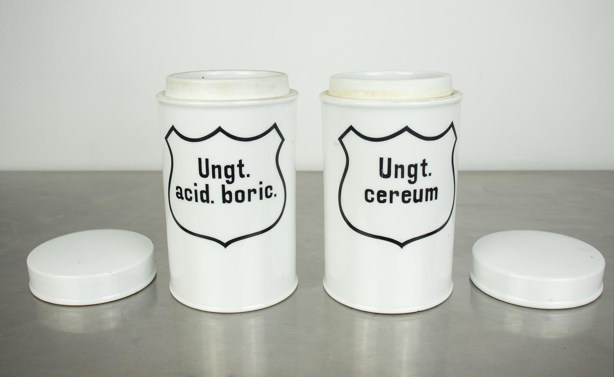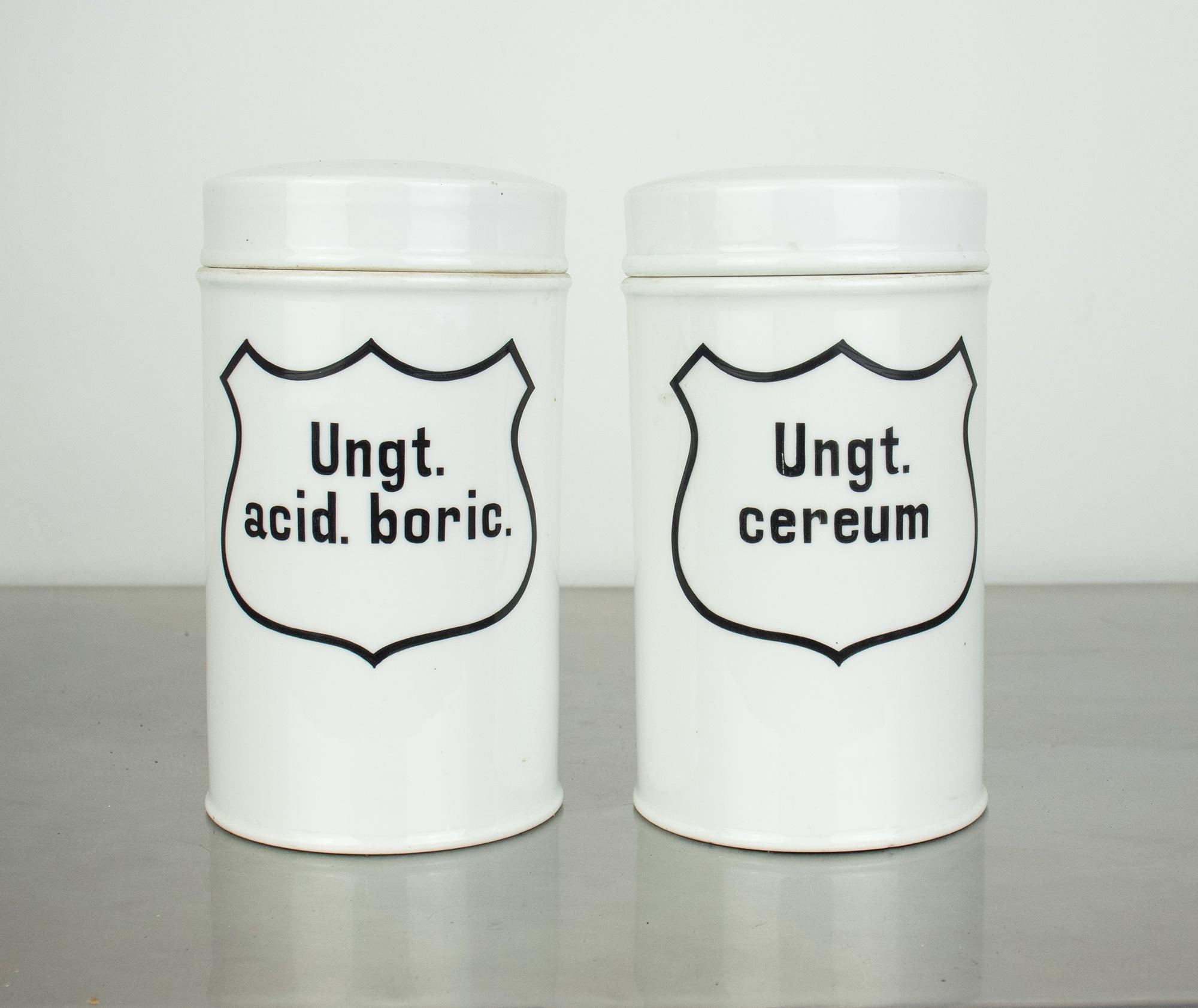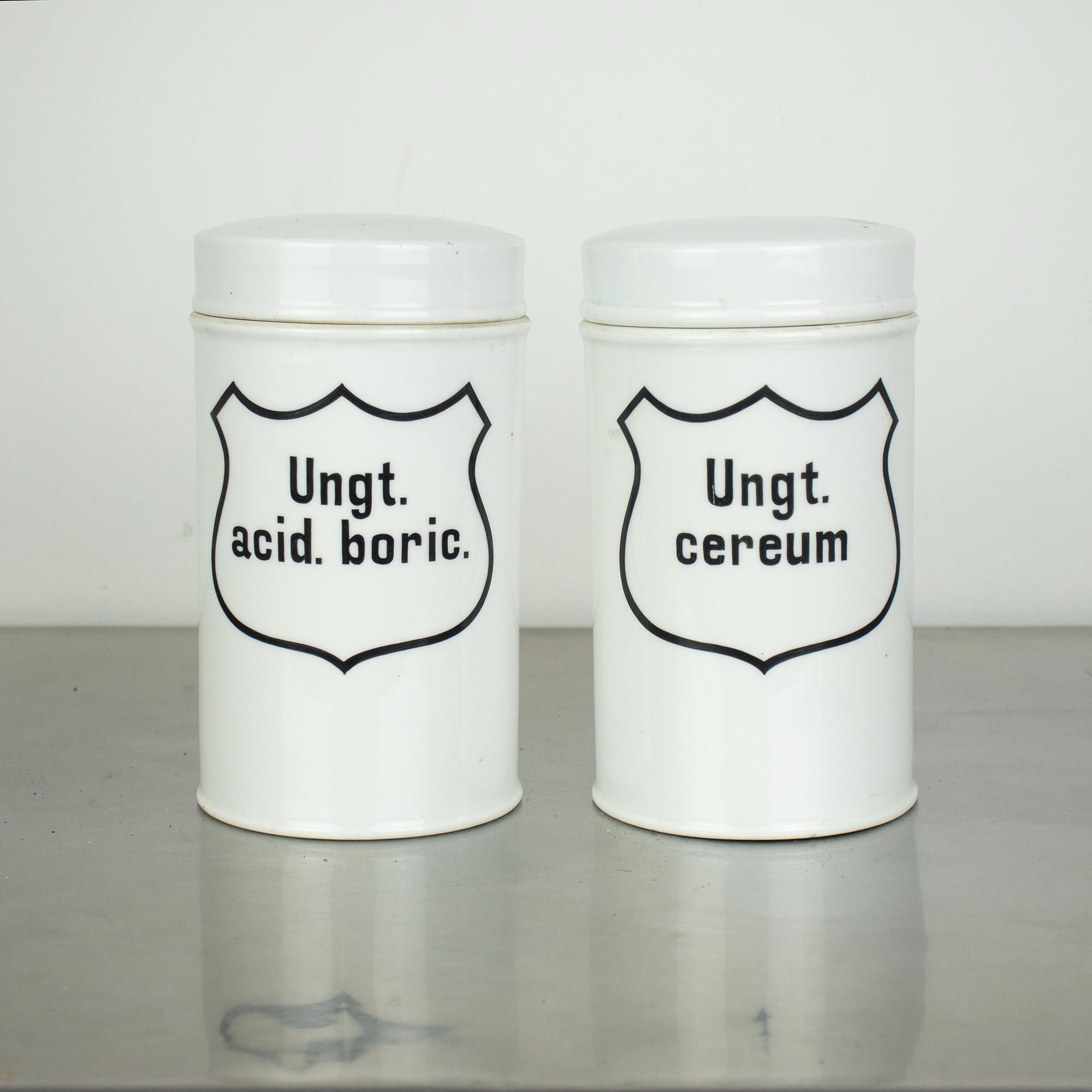 A beautiful pair of vintage apothecary jars made of white enamel with classic black typography and shield-shaped labels. These jars were originally used in pharmacies for storing ointments, with the Latin inscriptions “Ungt. acid. boric.” (boric acid ointment) and “Ungt. cereum” (wax-based ointment).