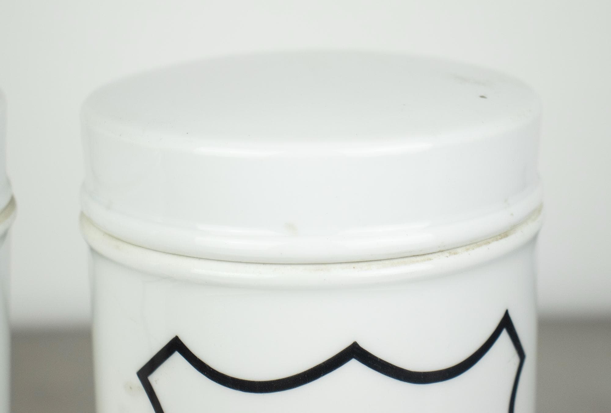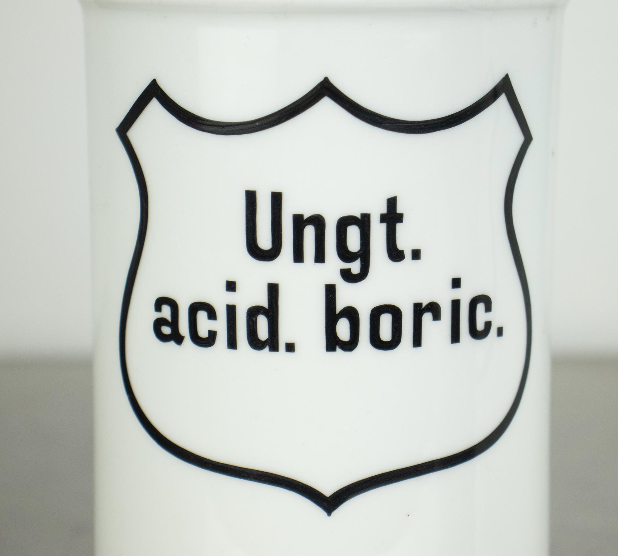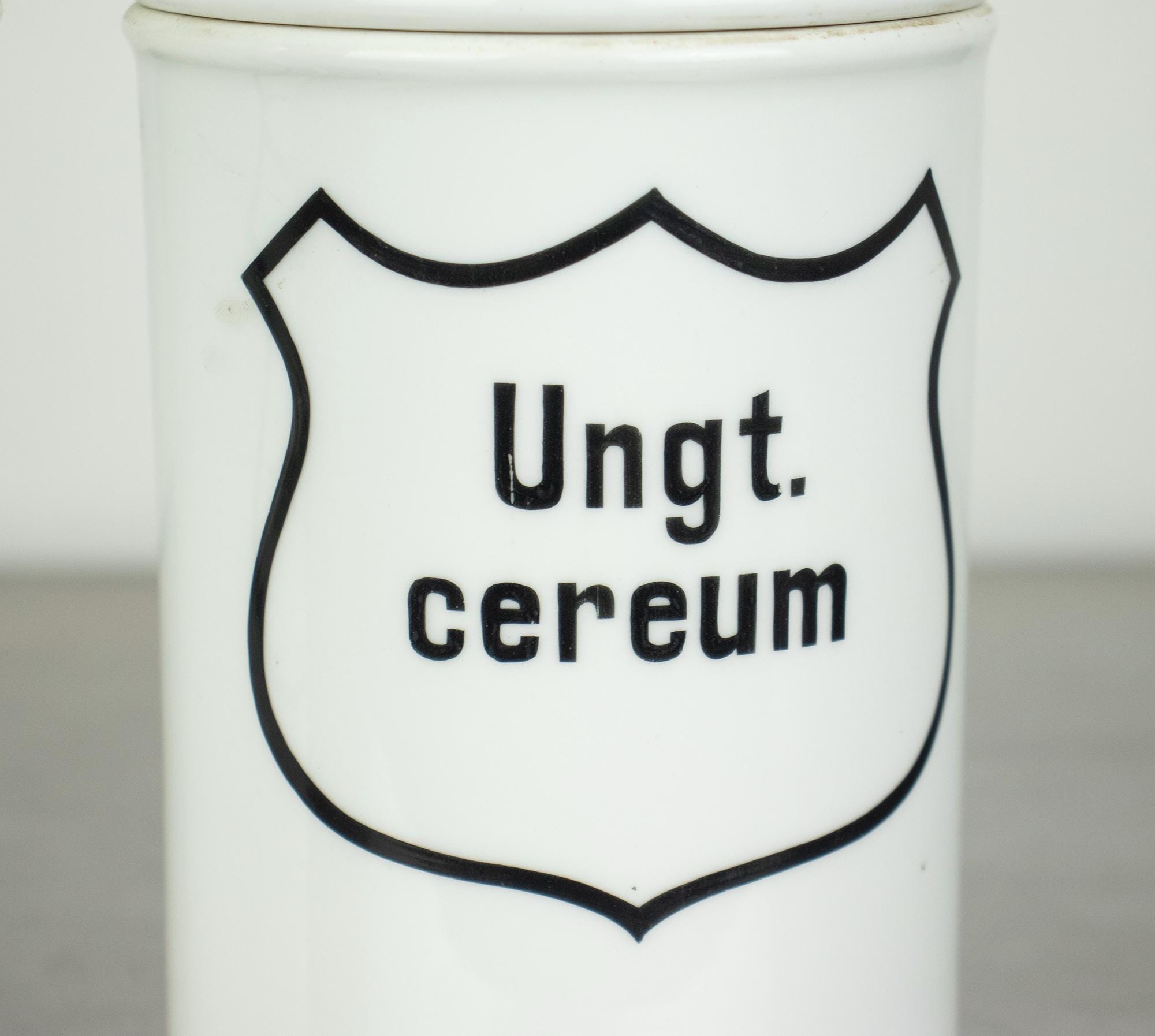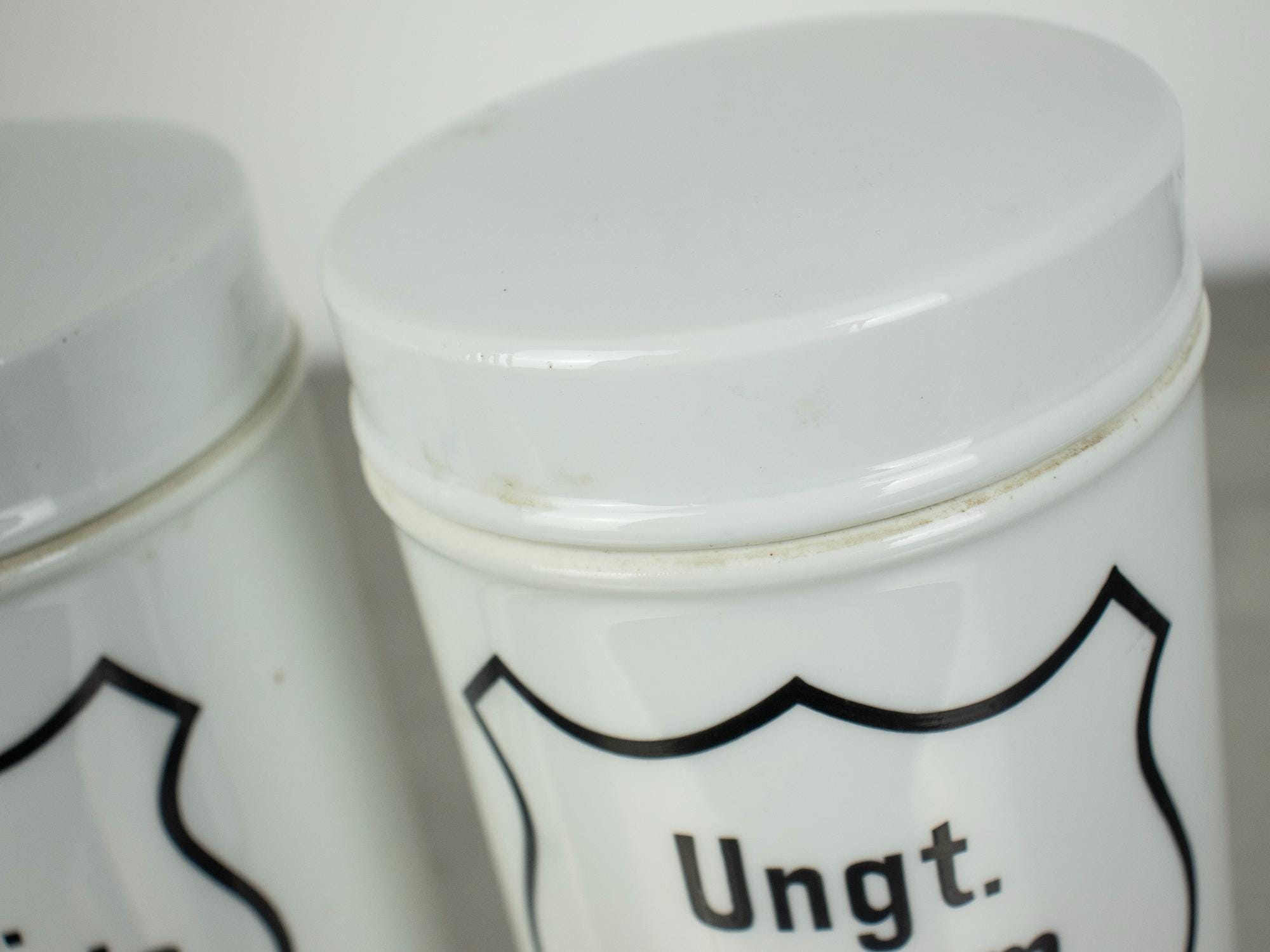 A beautiful pair of vintage apothecary jars made of white enamel with classic black typography and shield-shaped labels. These jars were originally used in pharmacies for storing ointments, with the Latin inscriptions “Ungt. acid. boric.” (boric acid ointment) and “Ungt. cereum” (wax-based ointment).