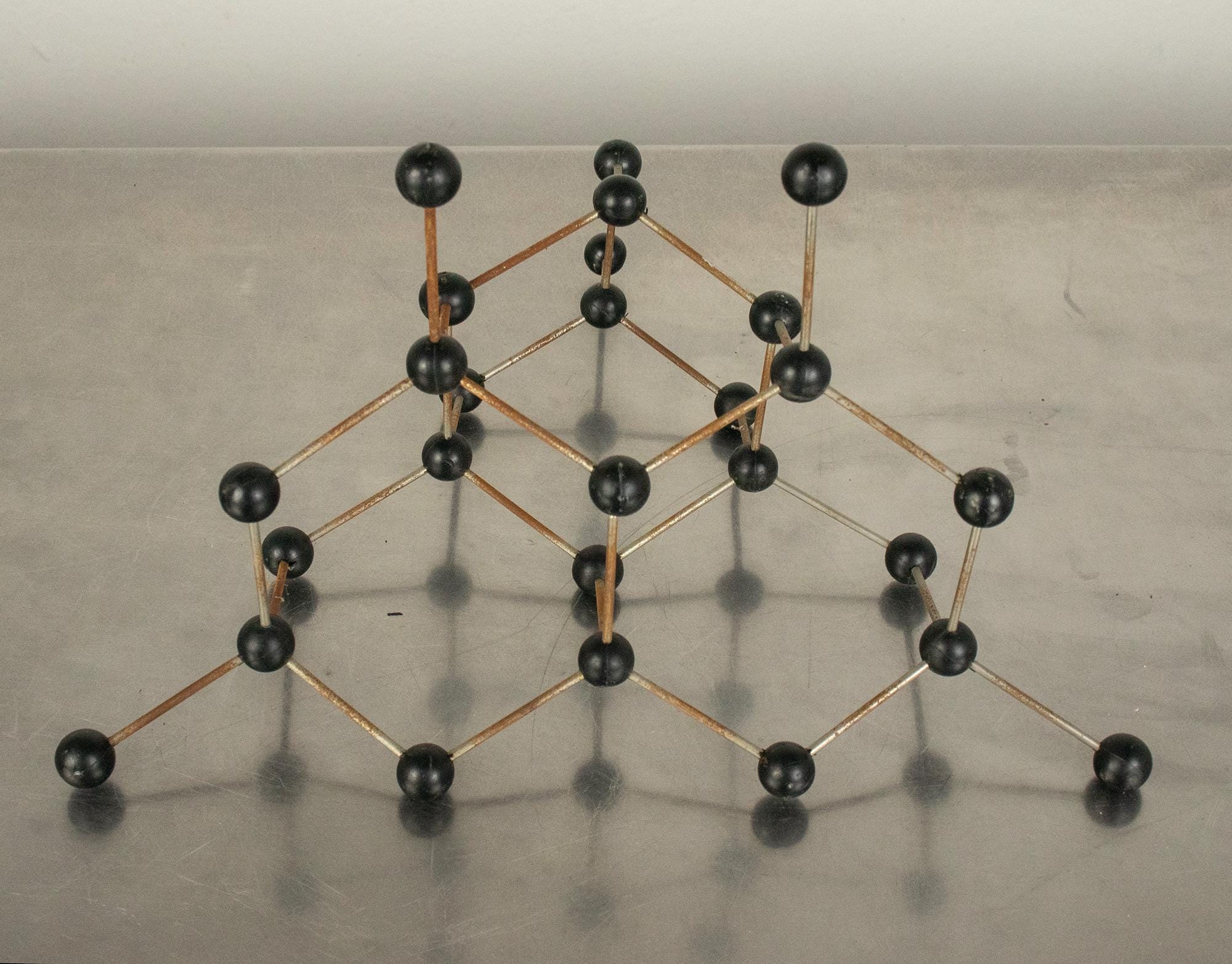Original vintage school crystal lattice model representing the atomic structure of diamond. Used in physics and chemistry education to demonstrate the tetrahedral lattice arrangement of carbon atoms in diamond.