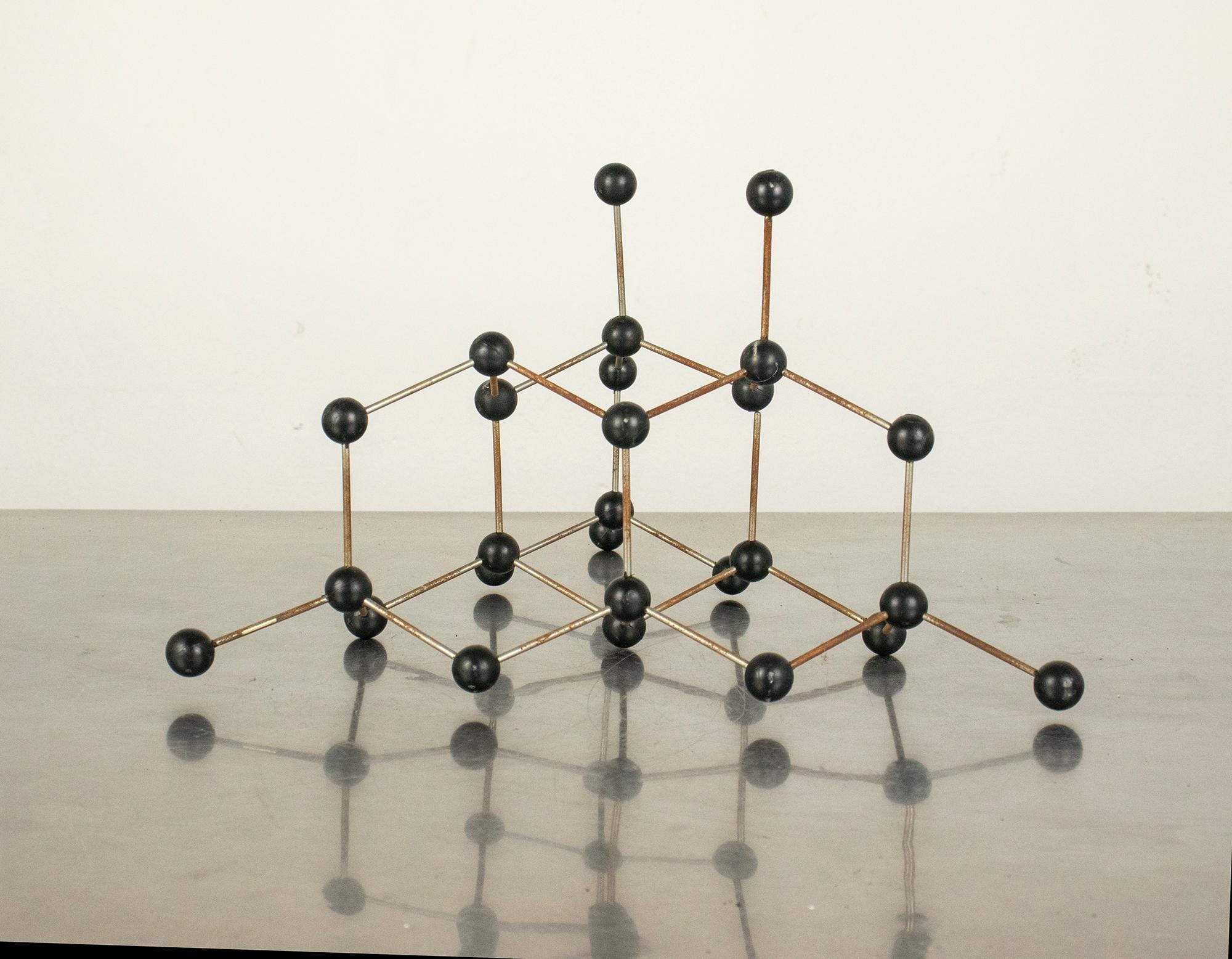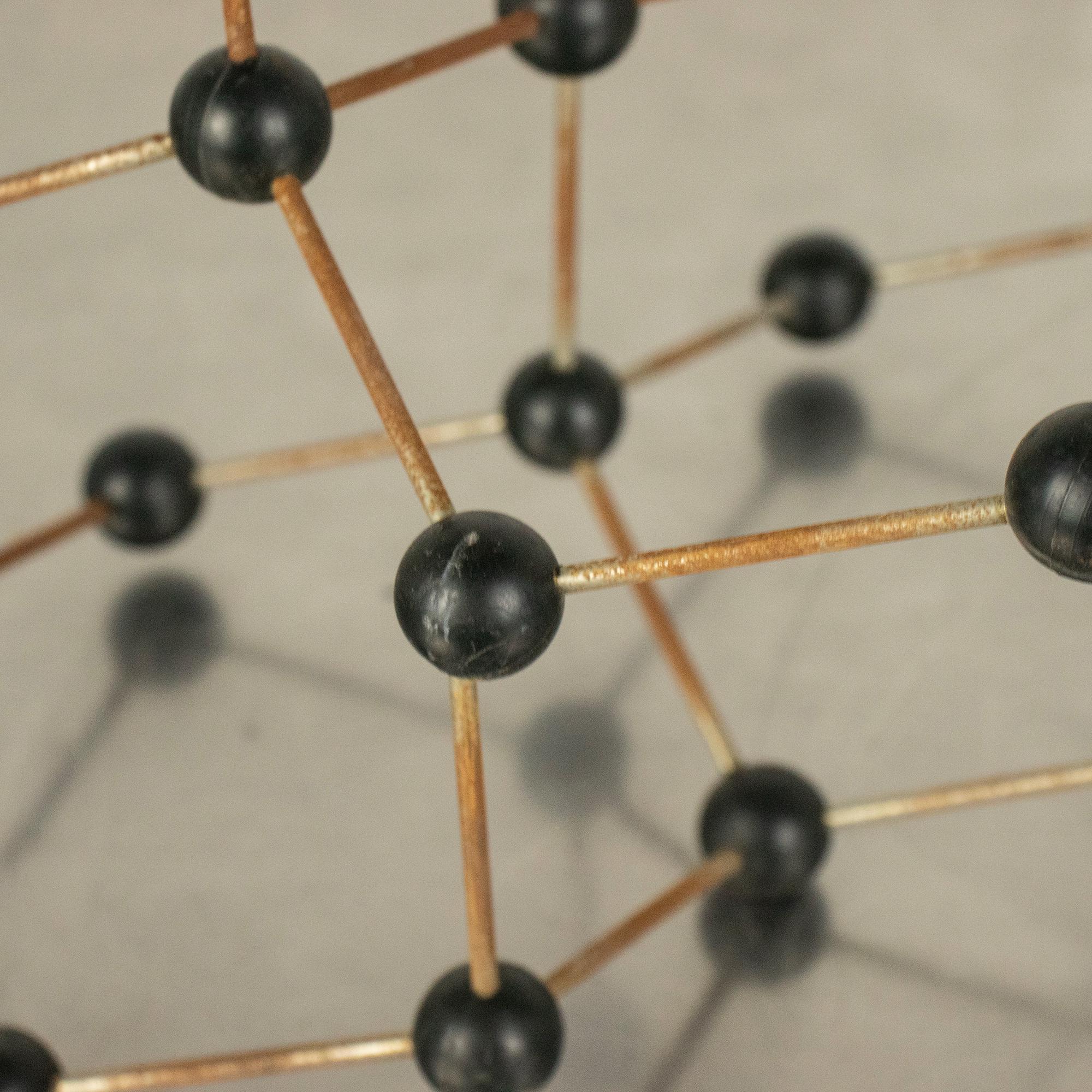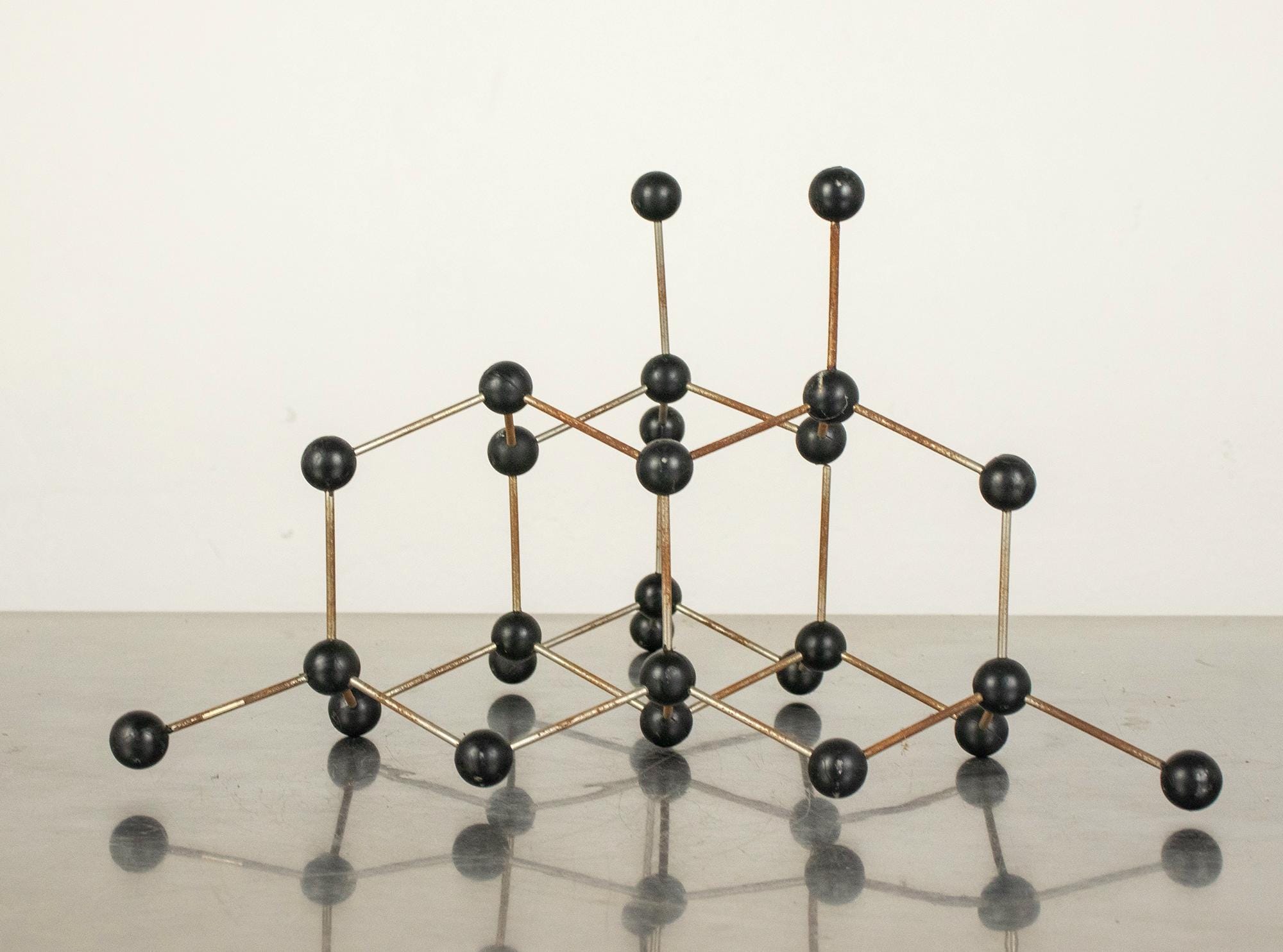 Made of metal rods and black spherical nodes, the model has a strong scientific and minimalist look. Today it works beautifully as a decorative object for a modern interior, office, studio, or science-inspired space.