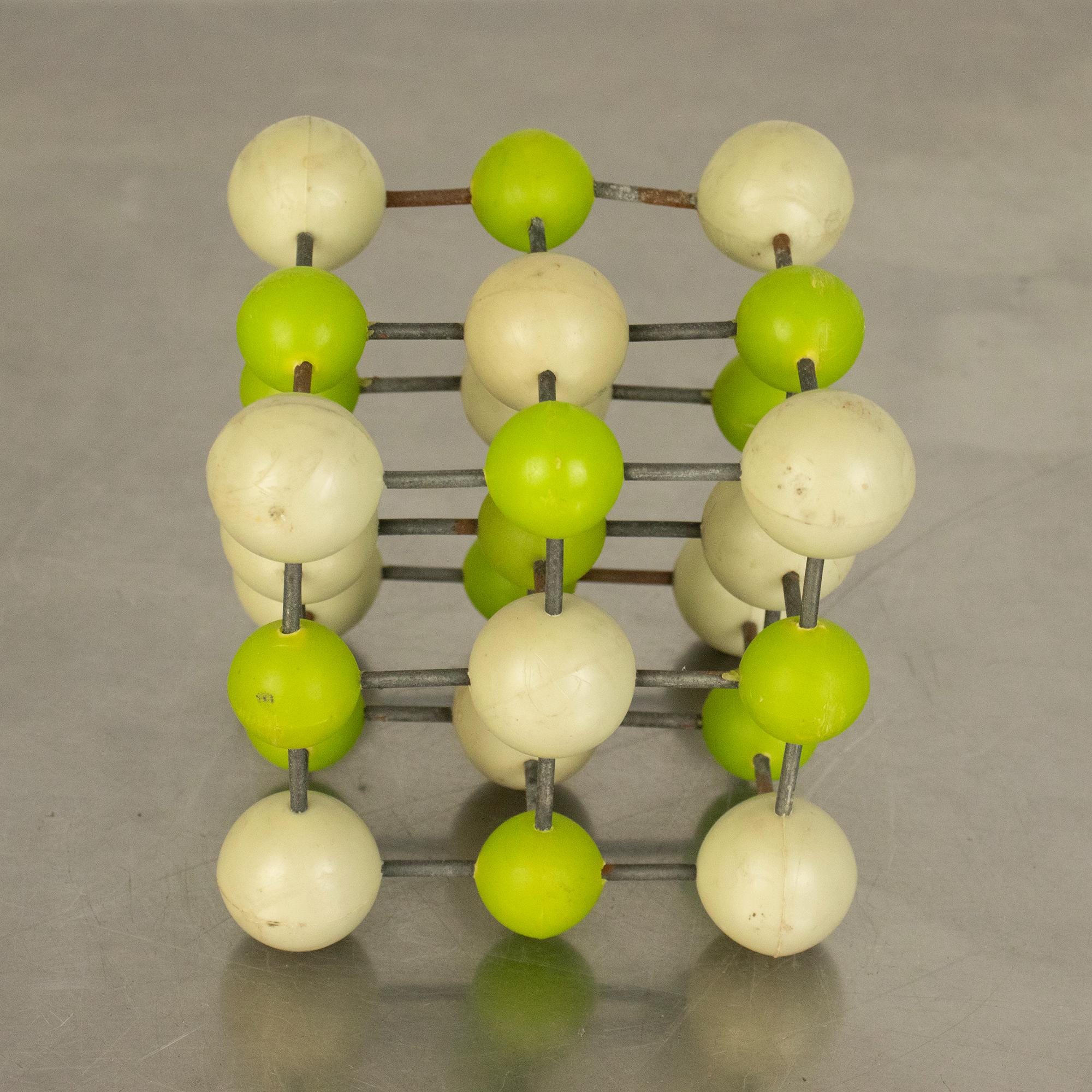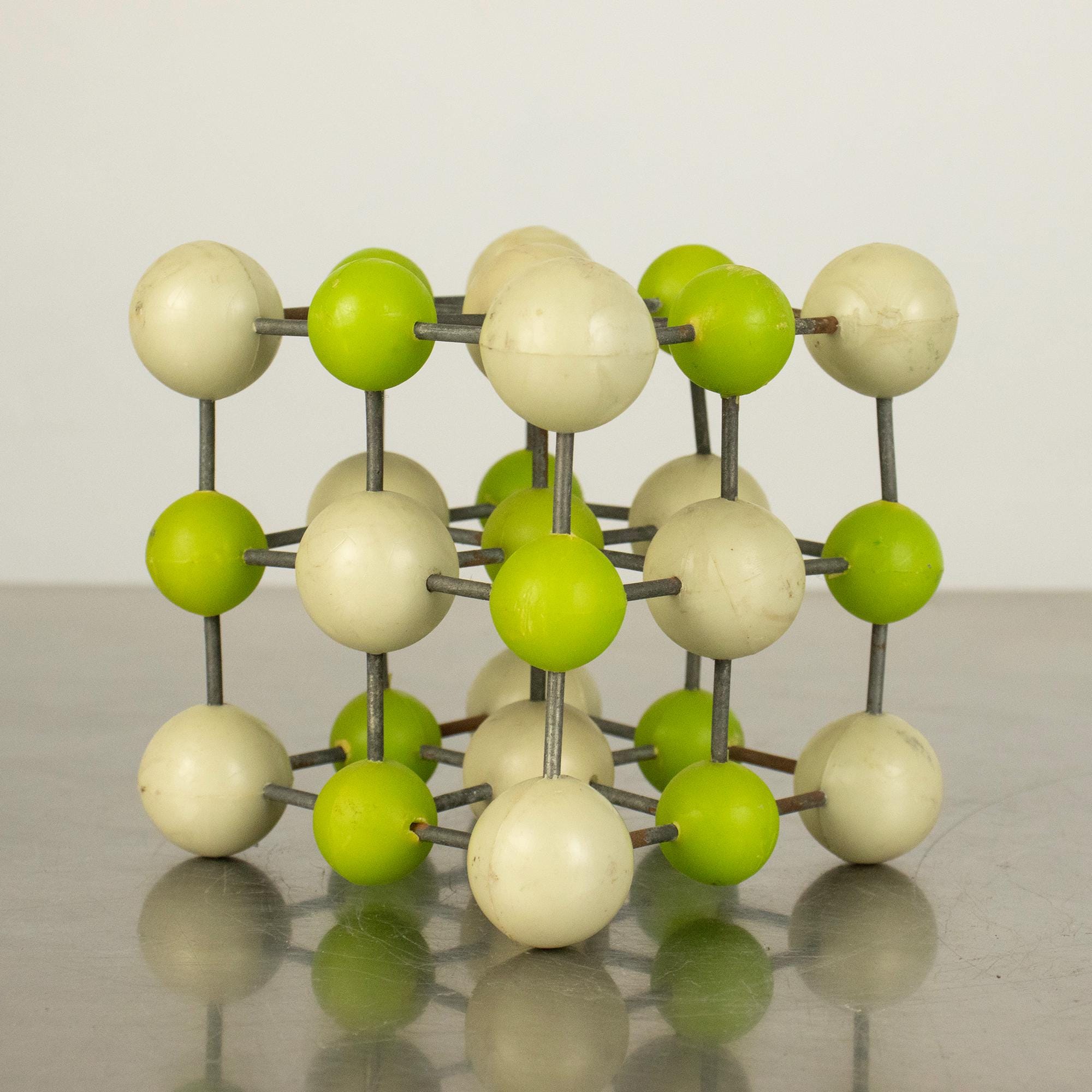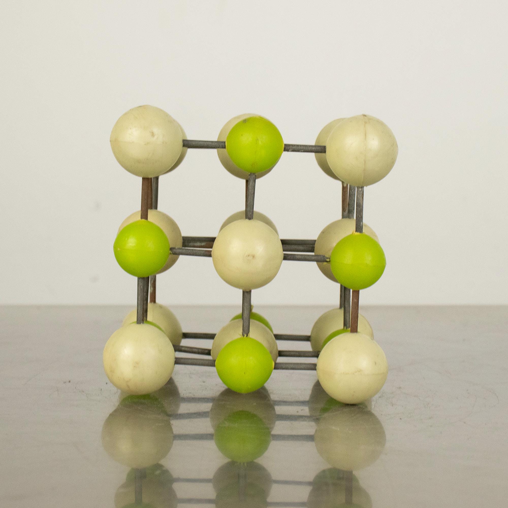 The model is constructed from plastic spheres connected with metal rods, forming a cubic lattice. These types of models were used to visually explain atomic arrangements, crystal structures, and bonding in solid materials.