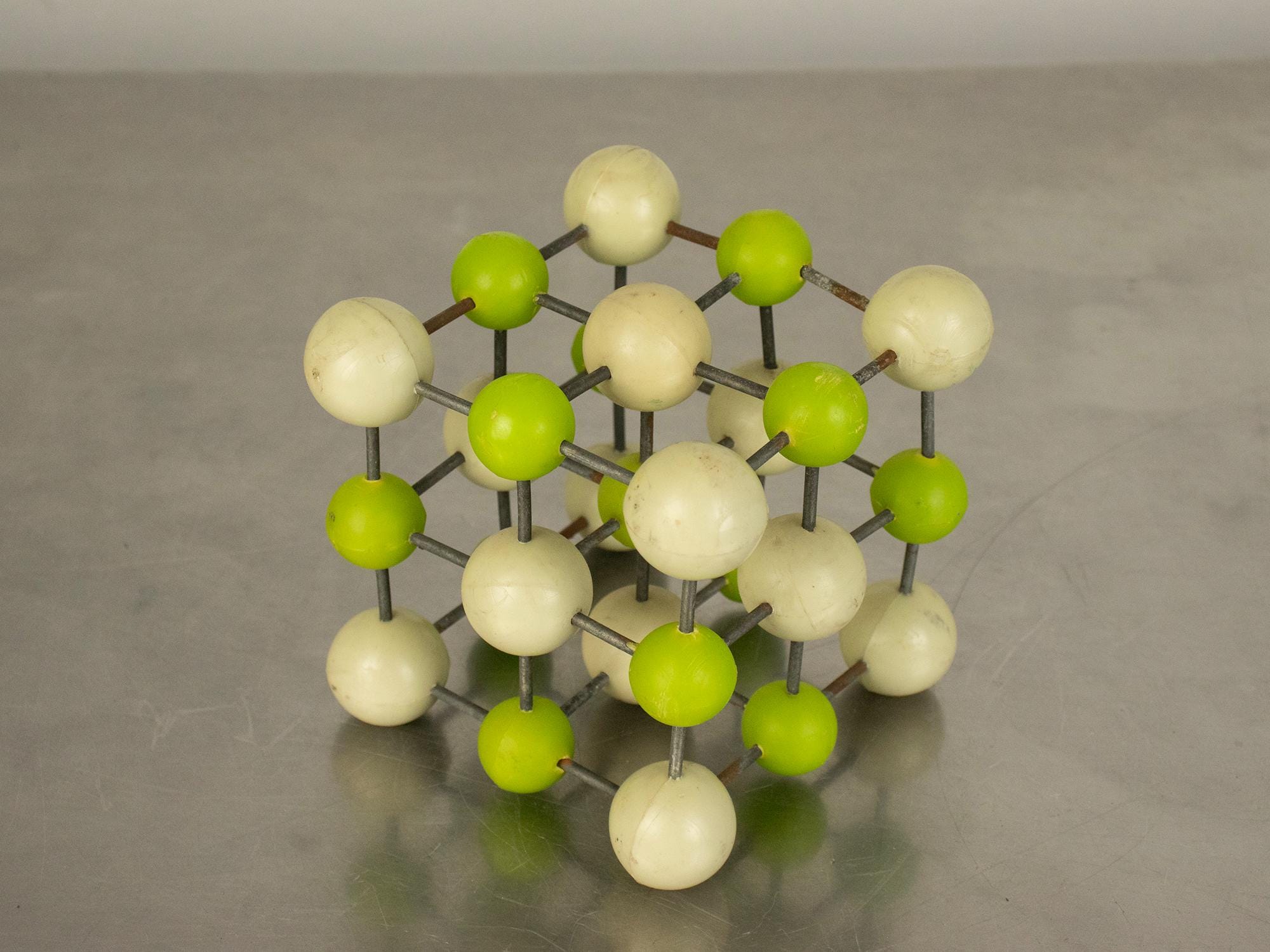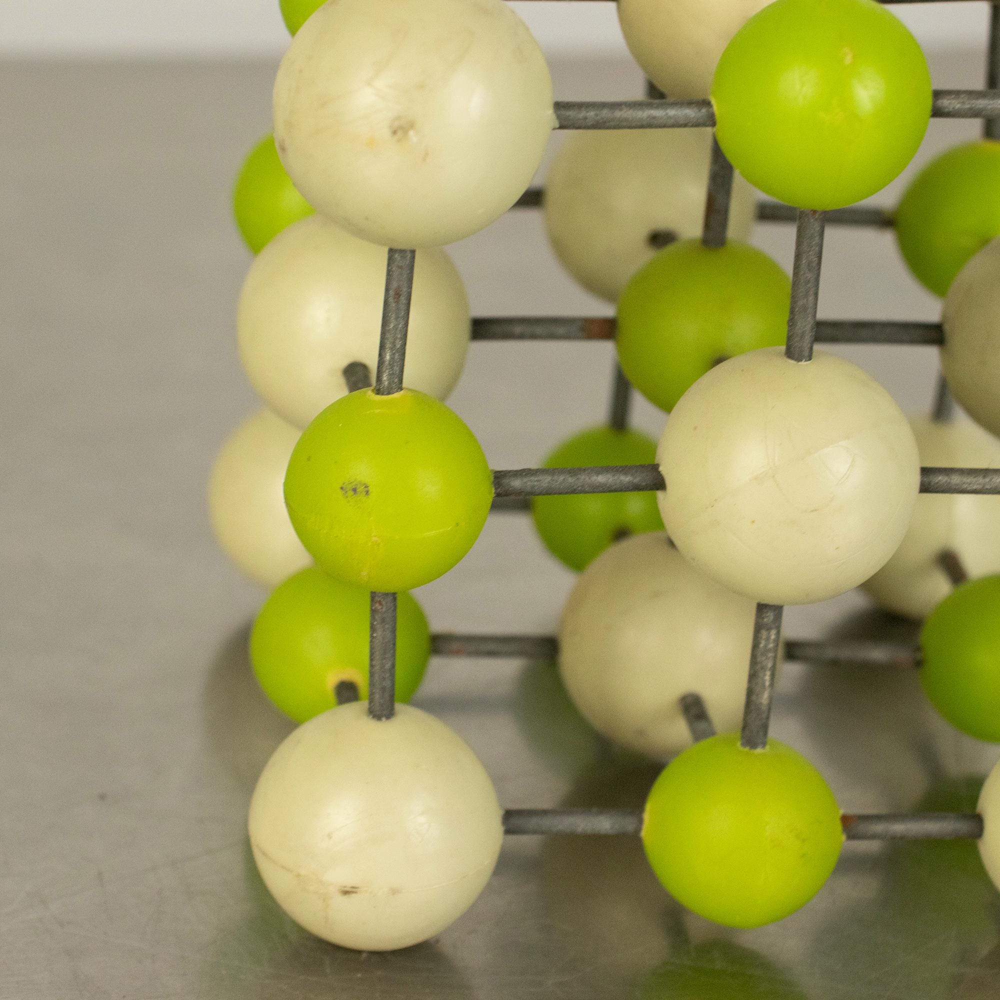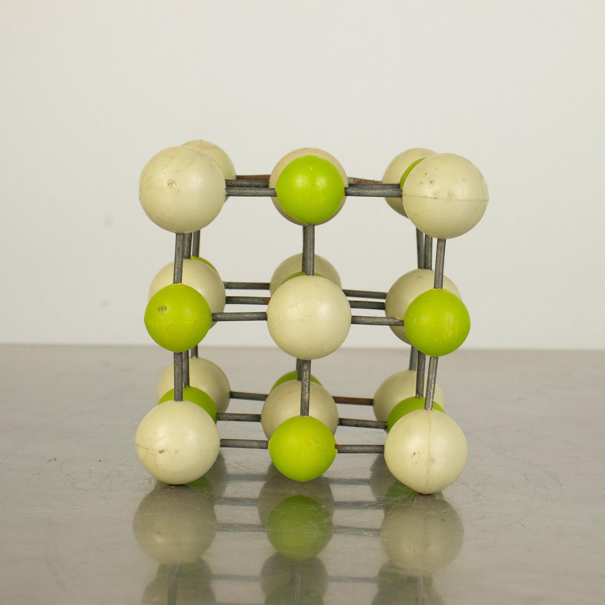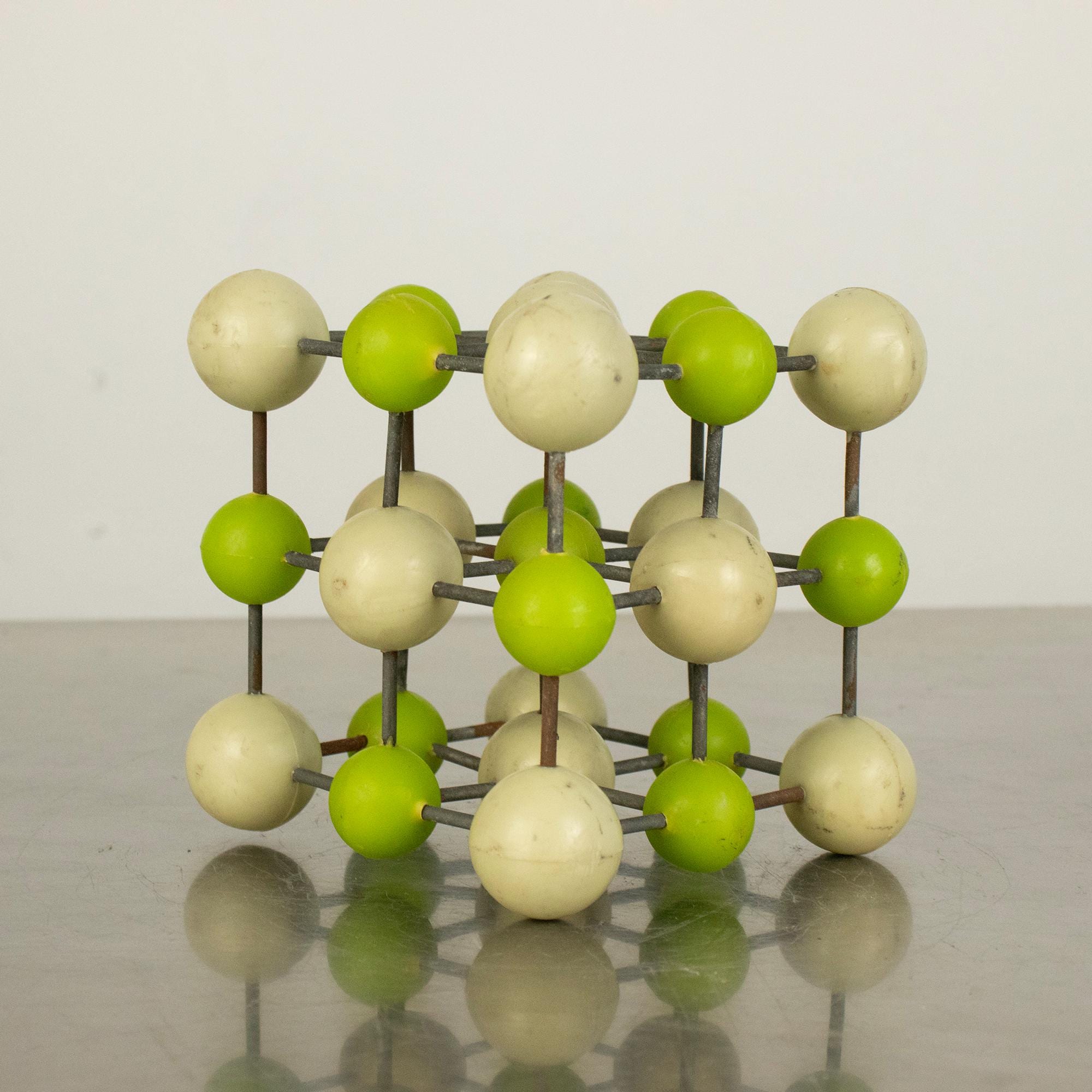The model is constructed from plastic spheres connected with metal rods, forming a cubic lattice. These types of models were used to visually explain atomic arrangements, crystal structures, and bonding in solid materials.