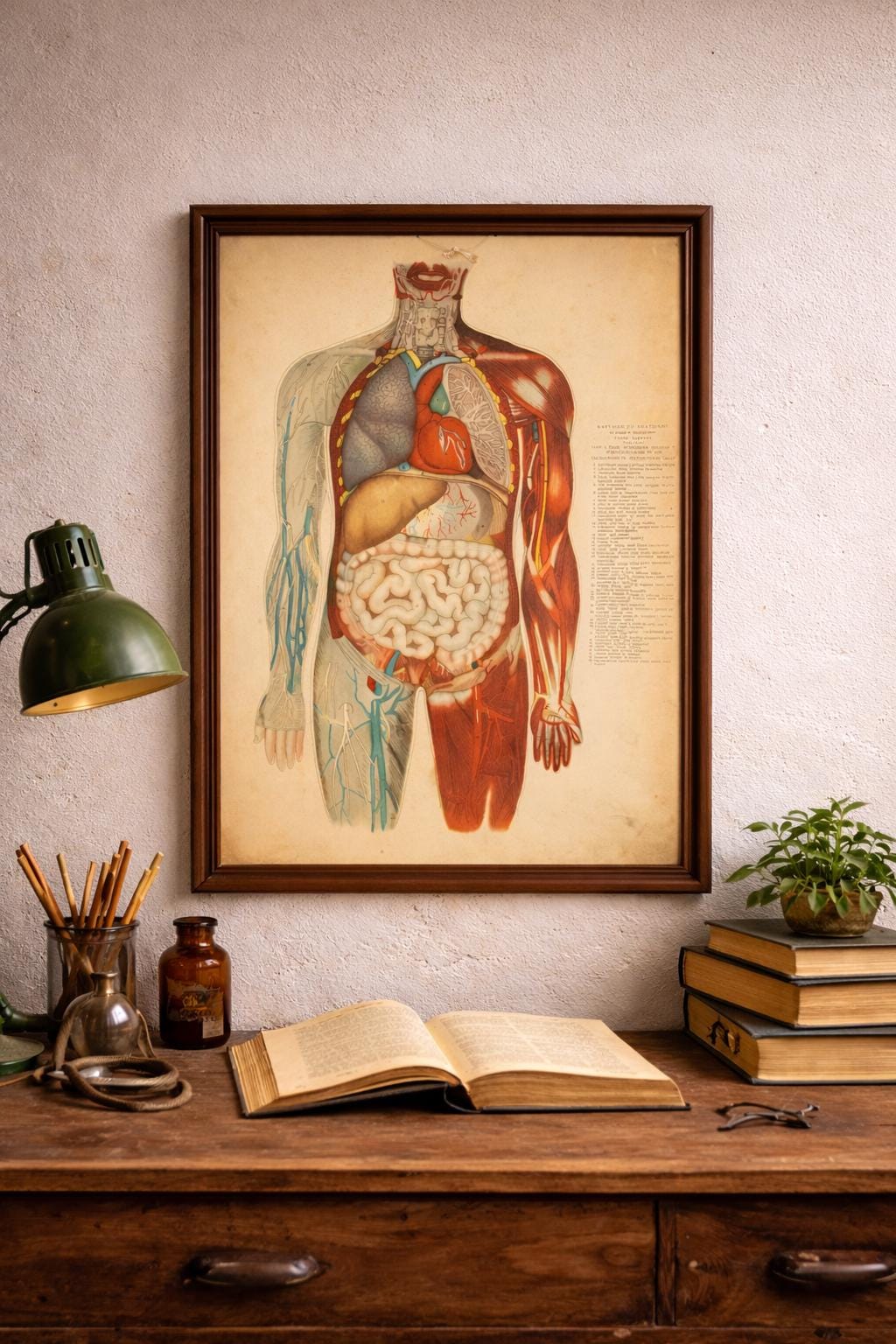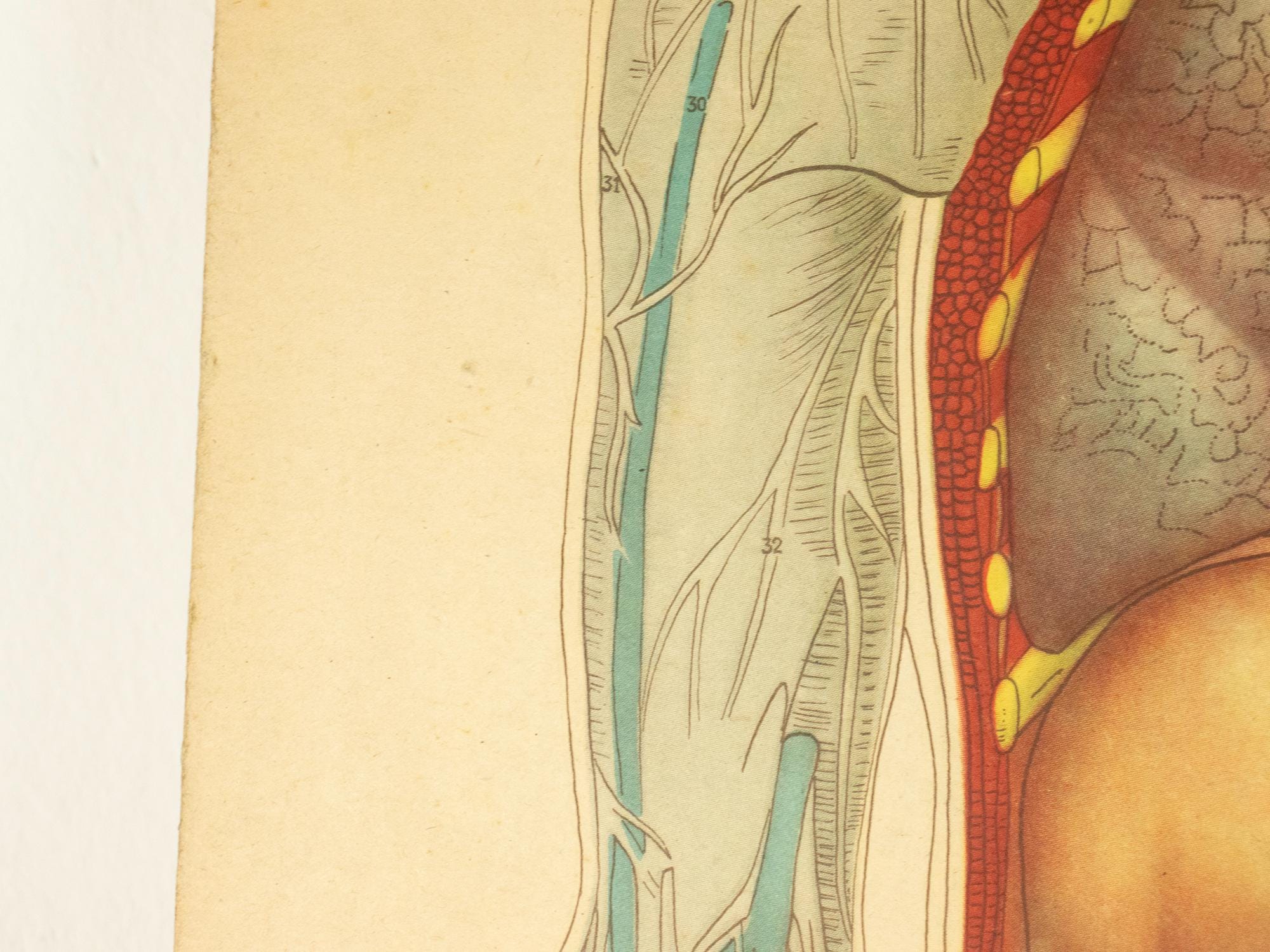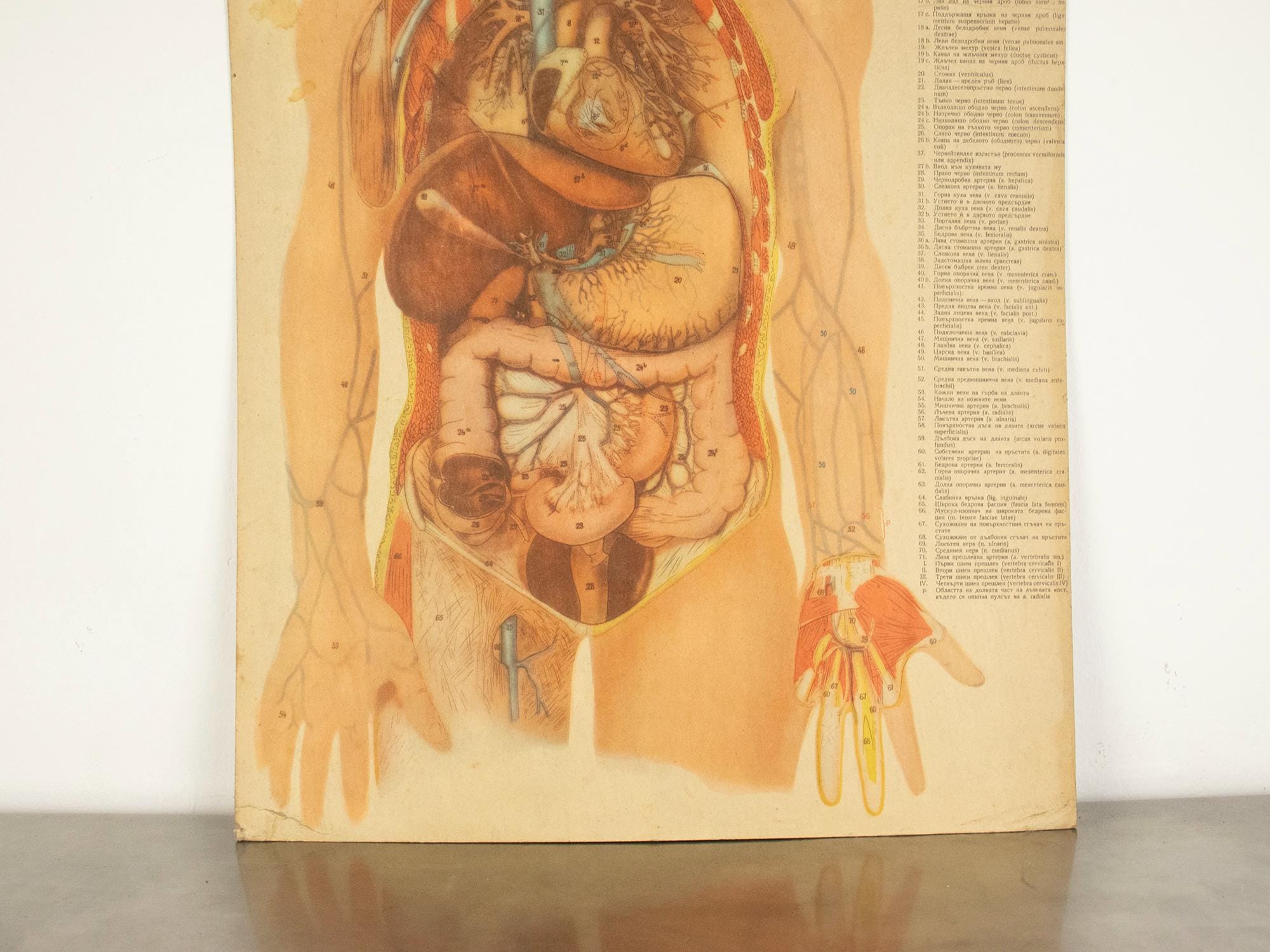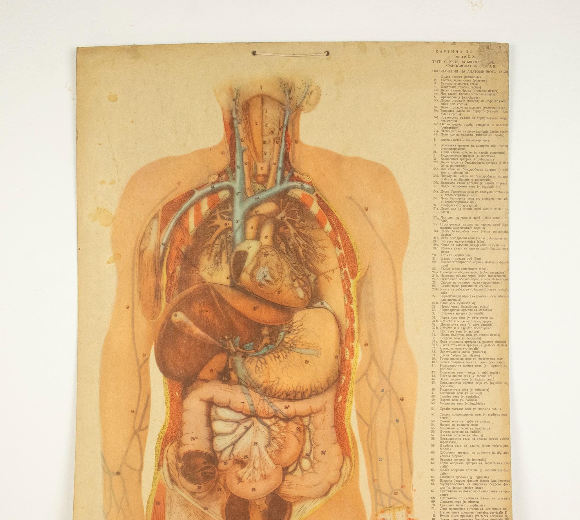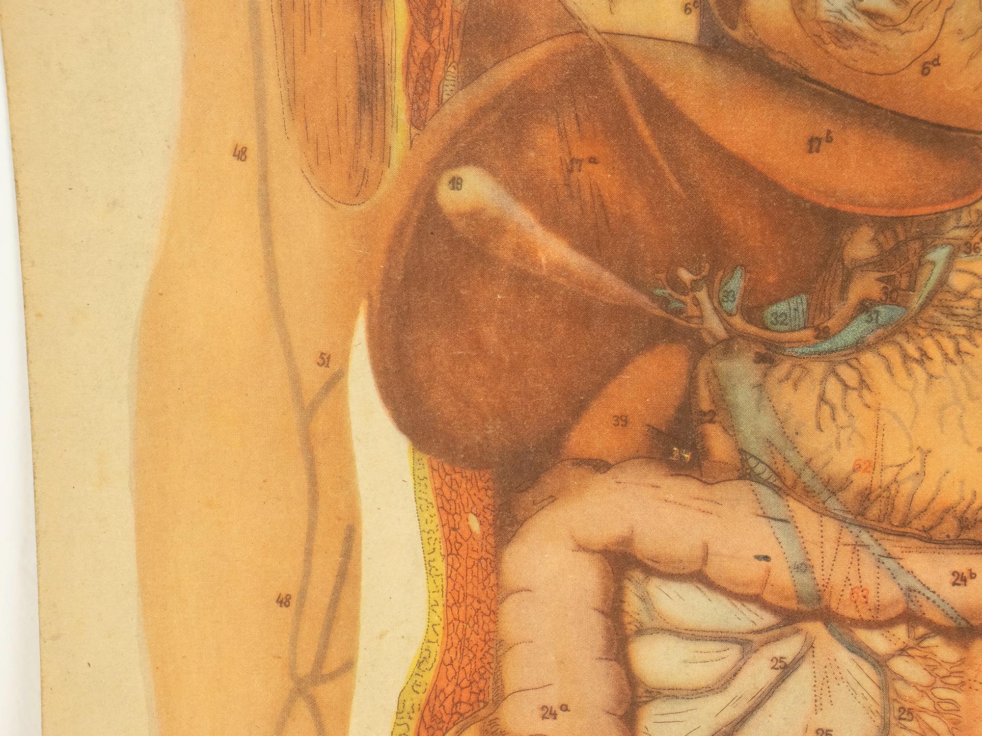 A beautiful and authentic double-sided vintage anatomy poster illustrating two essential human body systems — the vascular system on one side and the digestive system on the other. Rich in detail and academically precise, this chart was designed as a serious teaching aid and today stands as a compelling piece of scientific history.