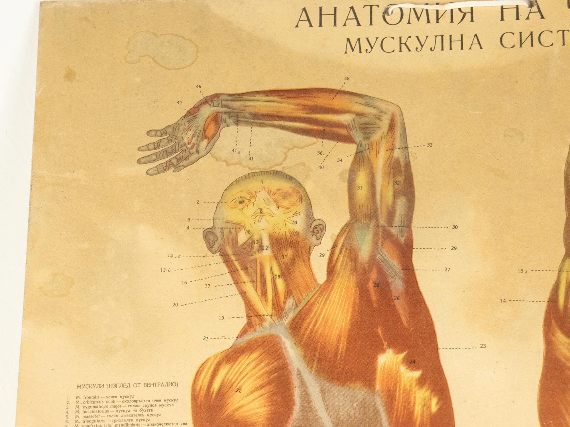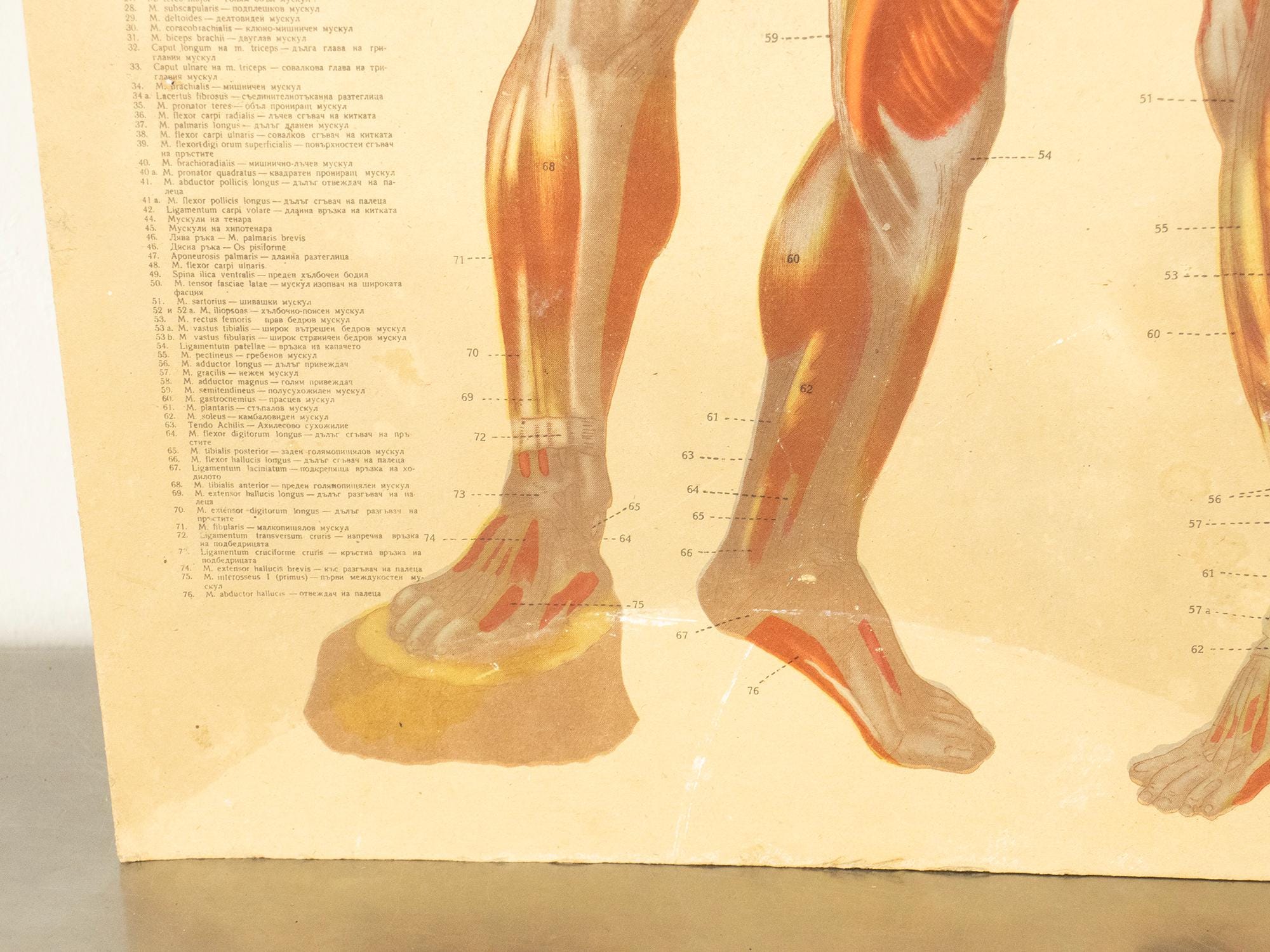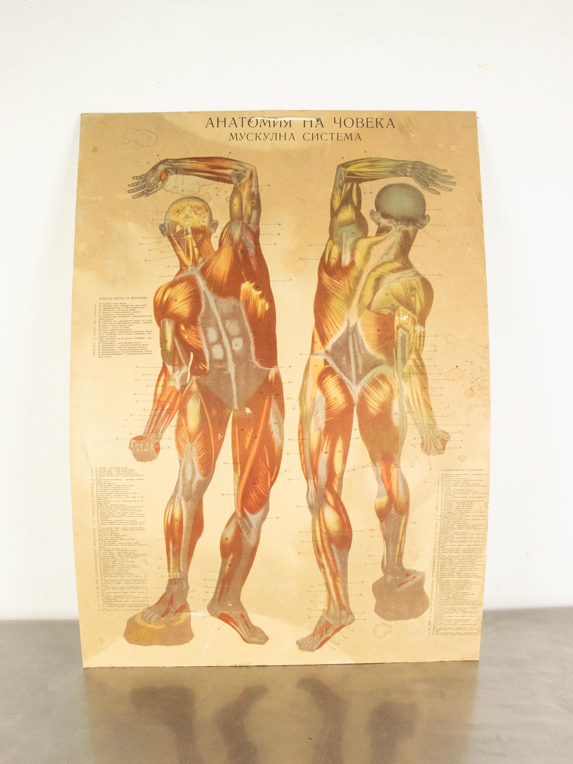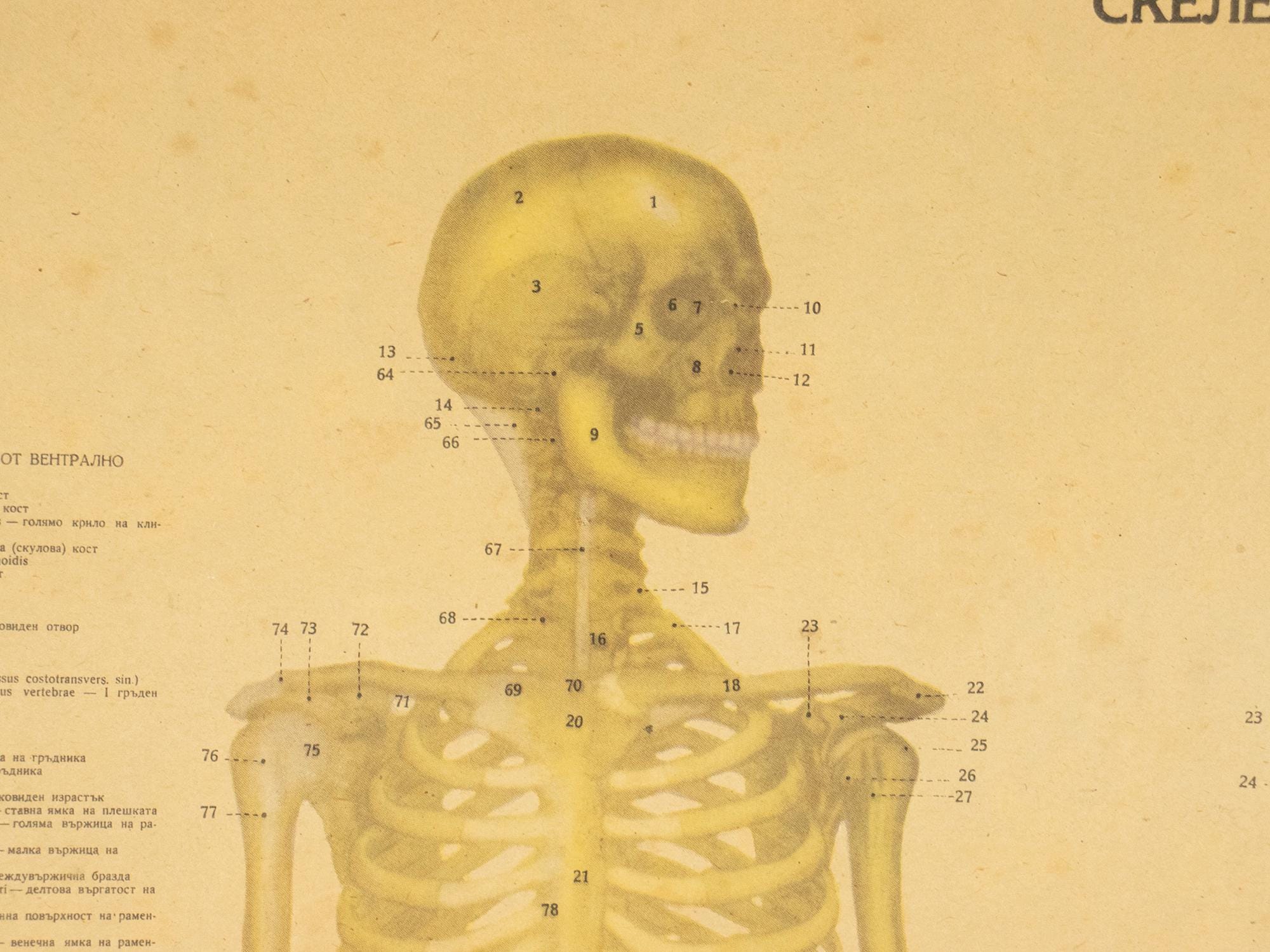Originally produced as an educational classroom chart, this piece reflects a time when teaching relied on beautifully illustrated, large-format visuals. The detailed anatomical renderings are accompanied by Latin and Bulgarian terminology, making it both scientifically engaging and visually compelling.