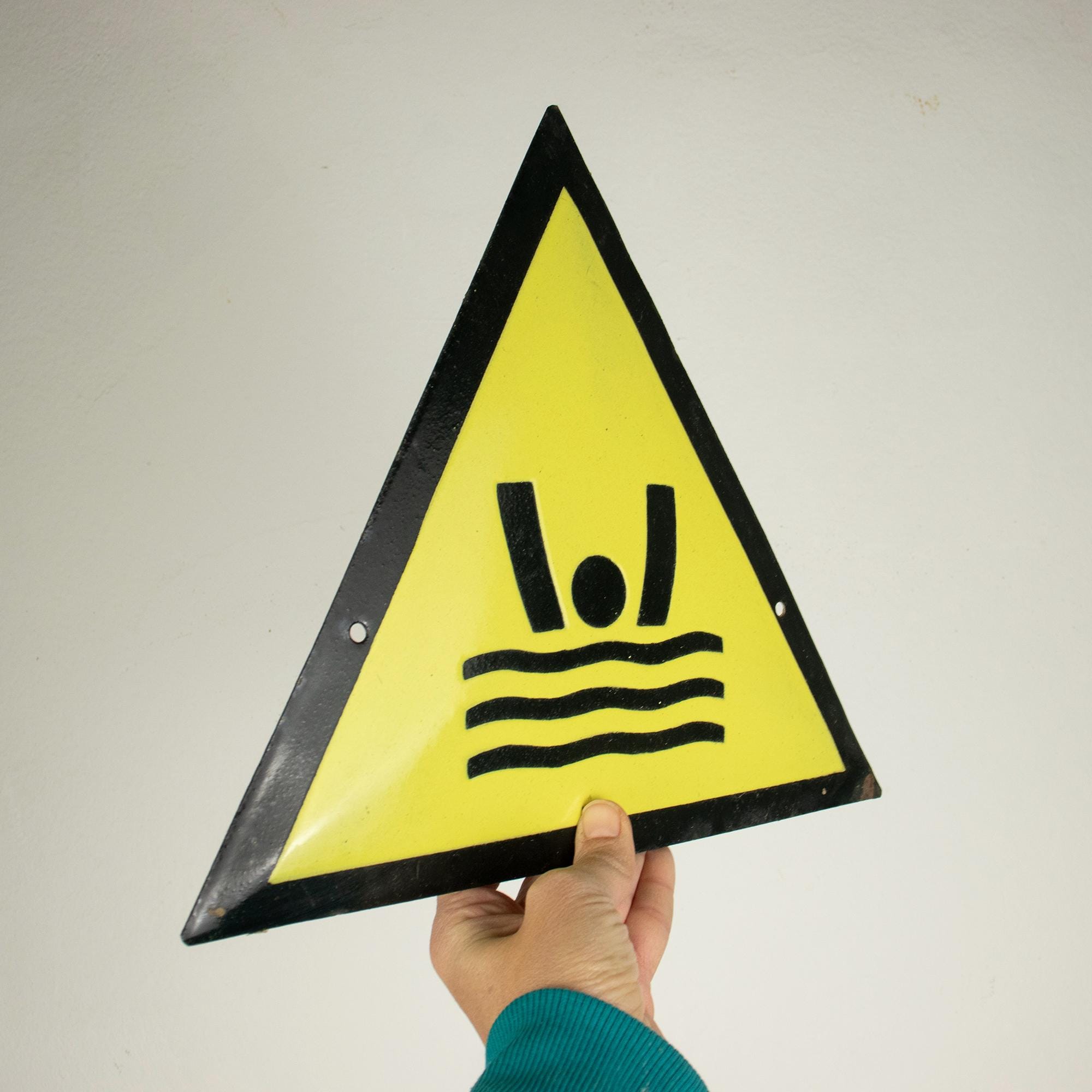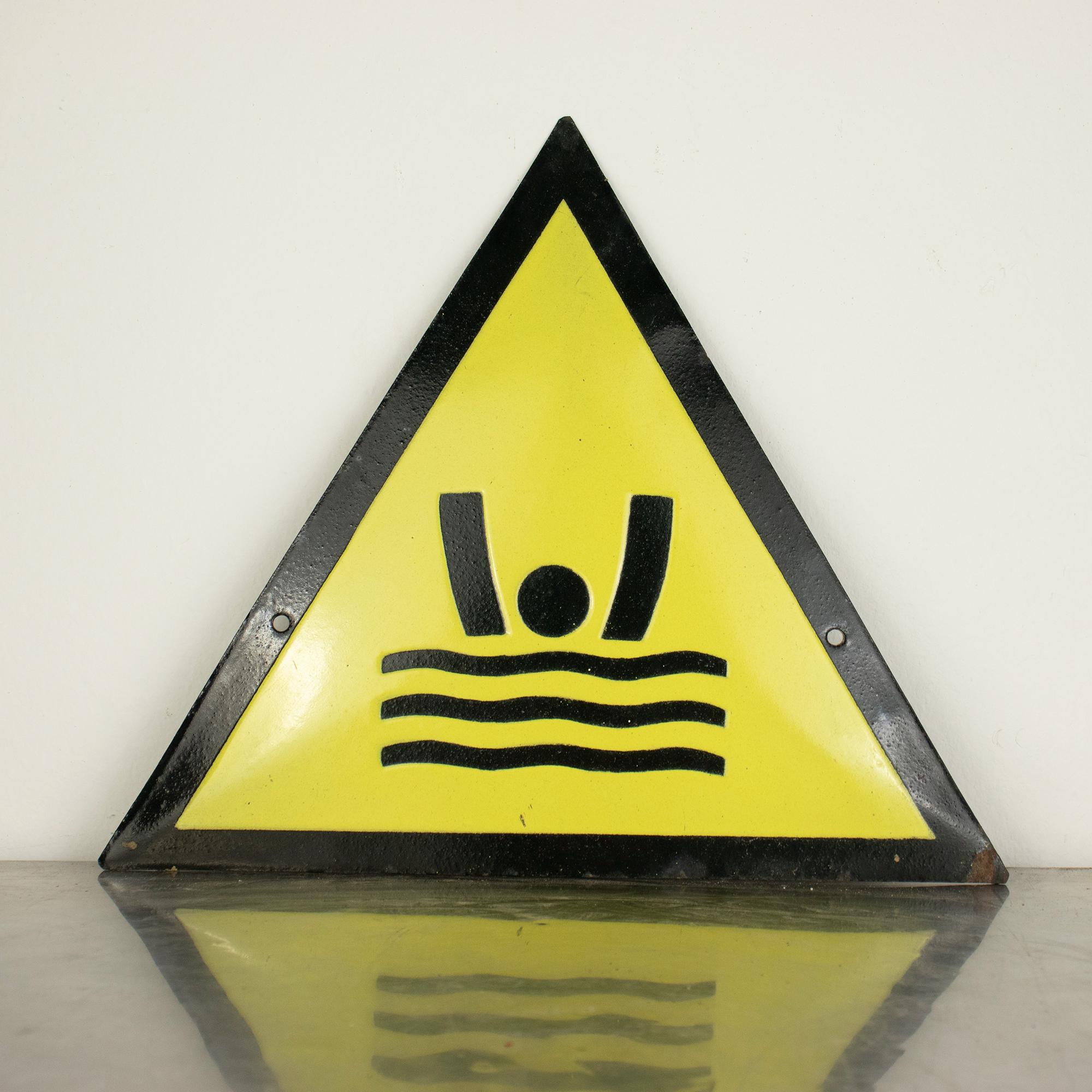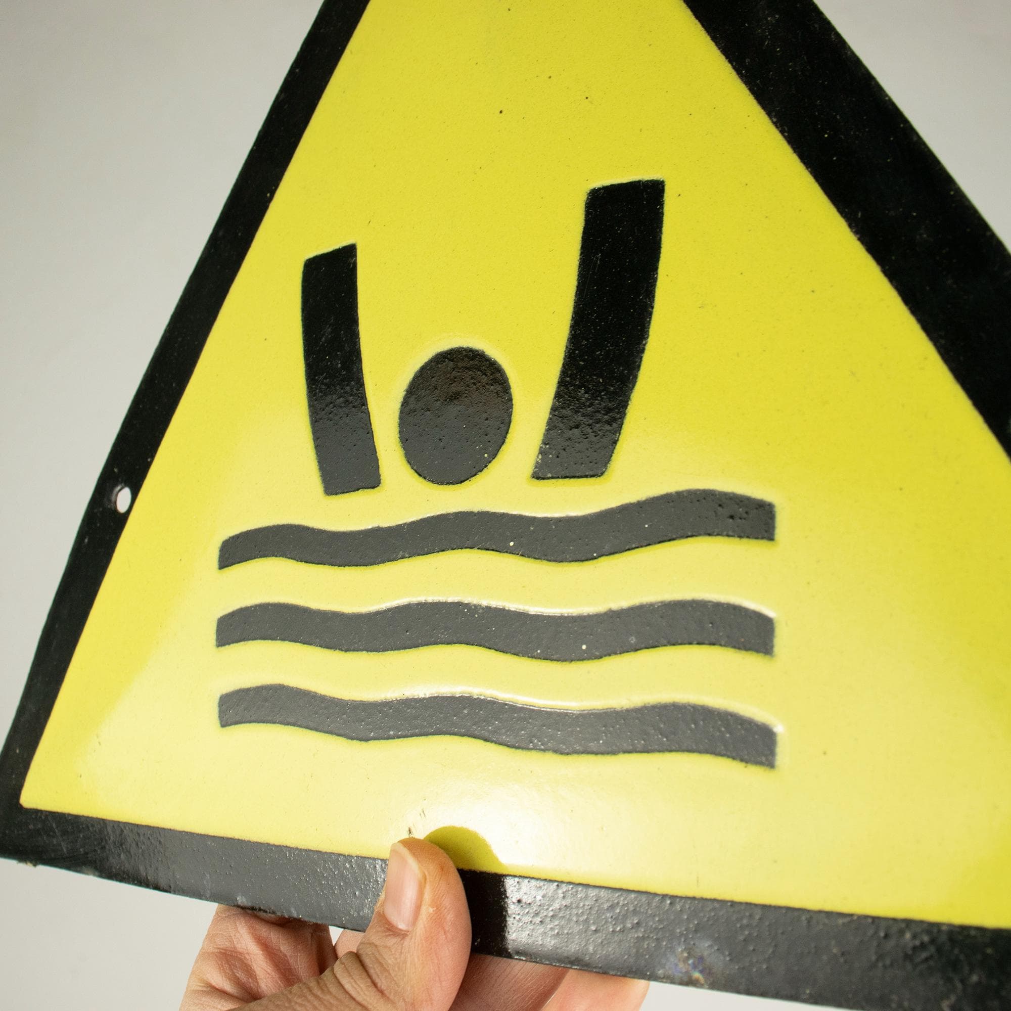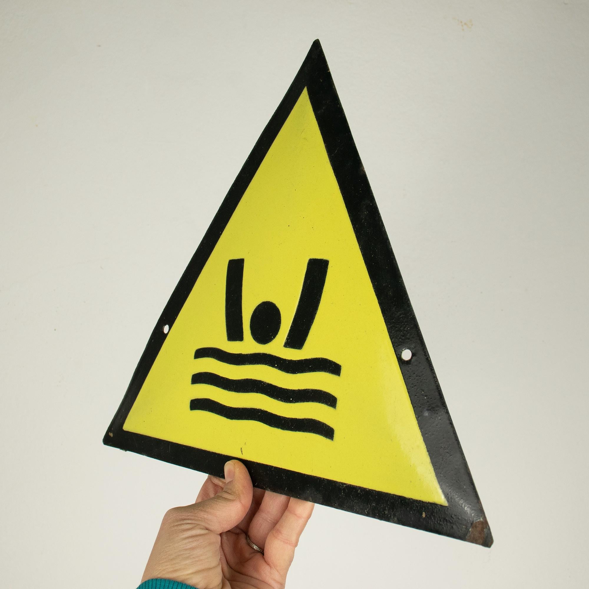 Authentic vintage enamel warning sign featuring a bold swimmer symbol, originally used to mark deep water or designated swimming areas. With its striking yellow background and strong black graphic, this piece has the timeless visual impact typical of mid-century industrial signage.