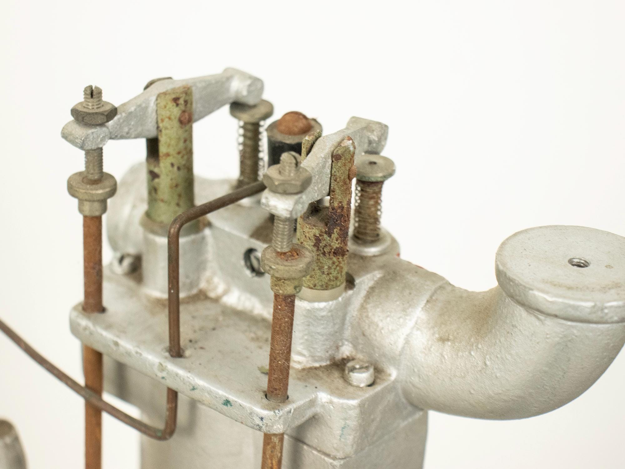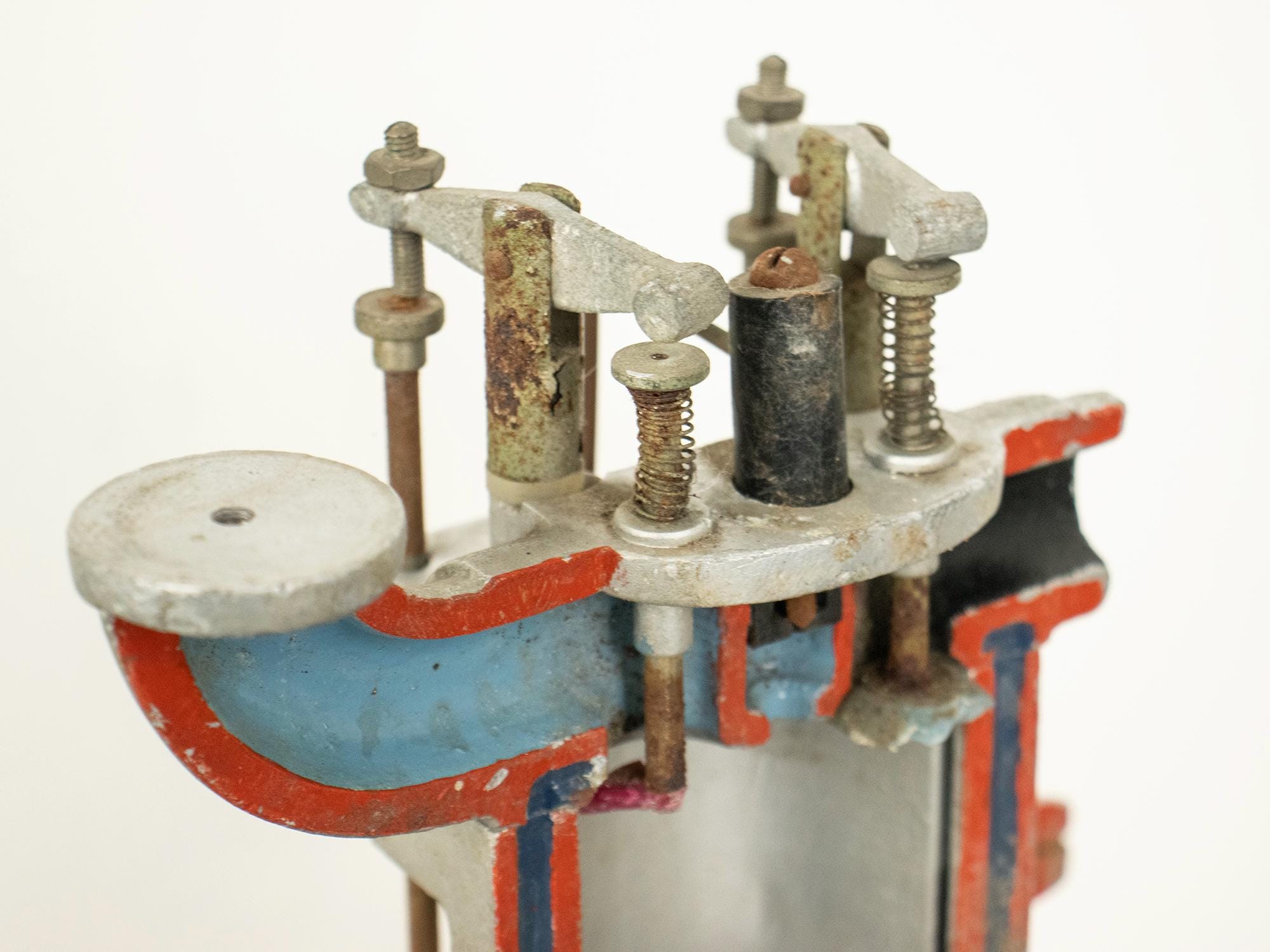 A striking vintage mechanical pump model crafted entirely from metal and designed as an educational teaching aid to demonstrate the inner workings of pump mechanics.