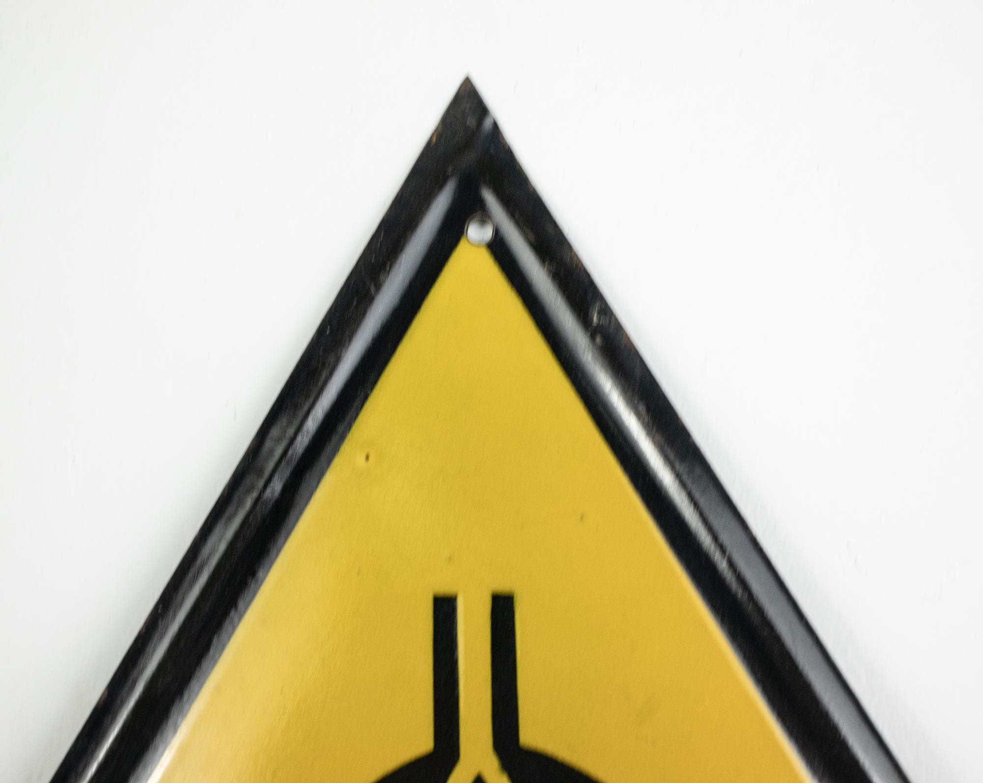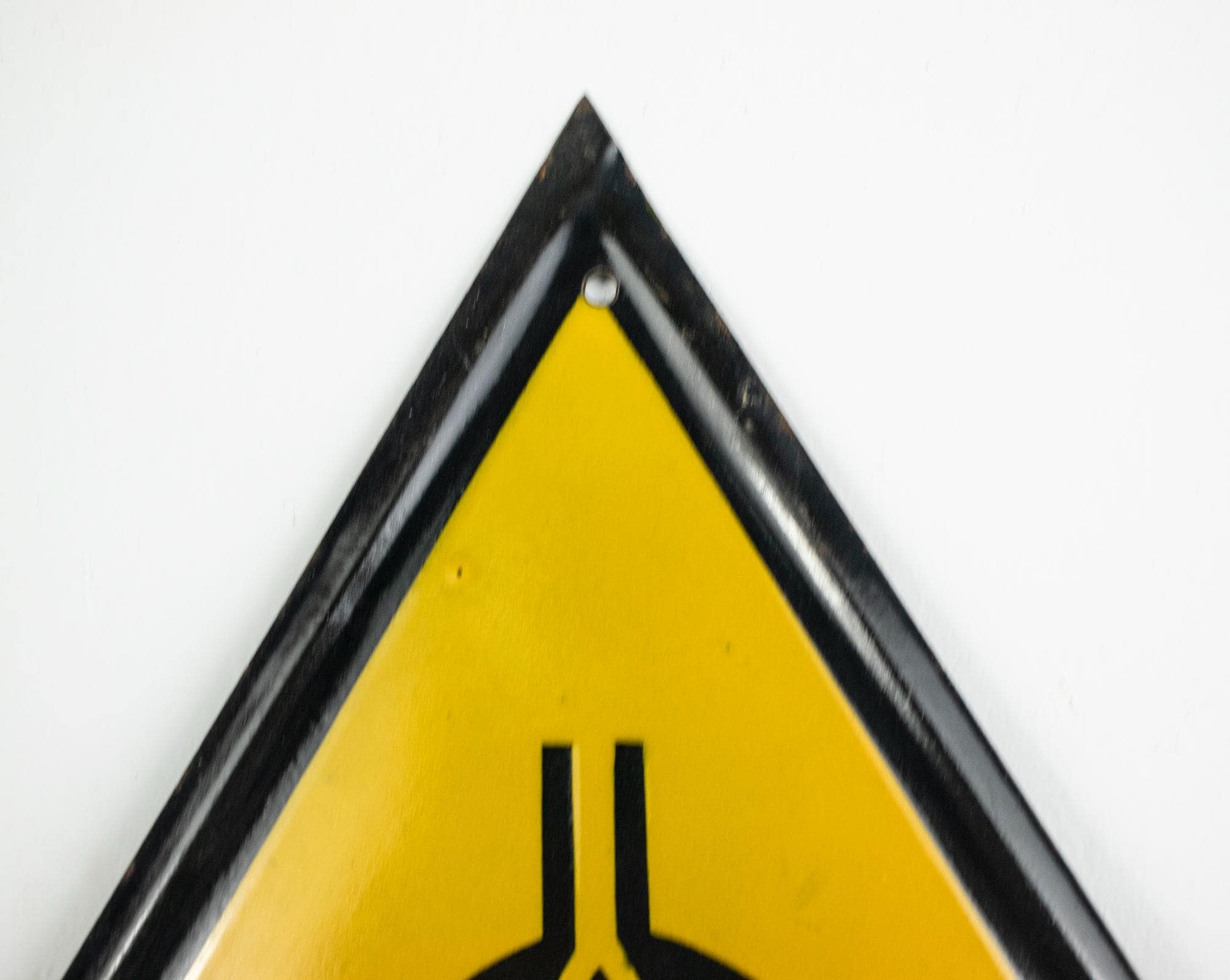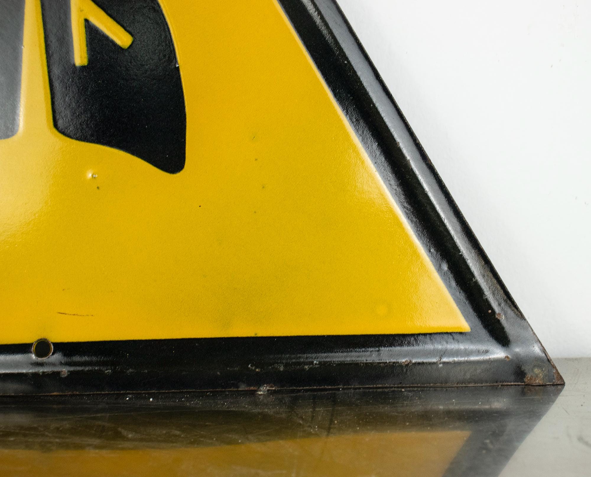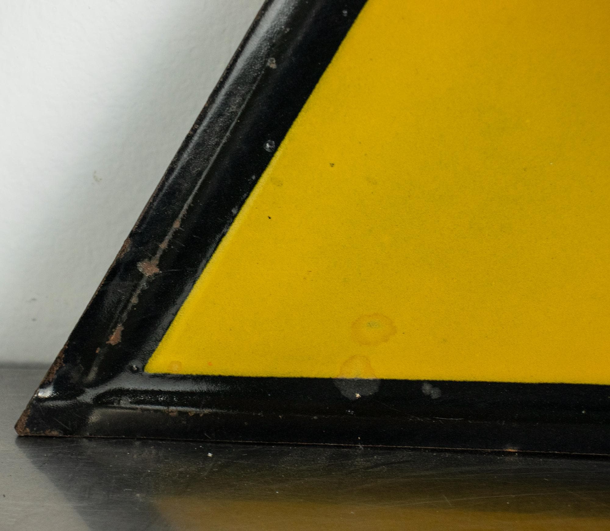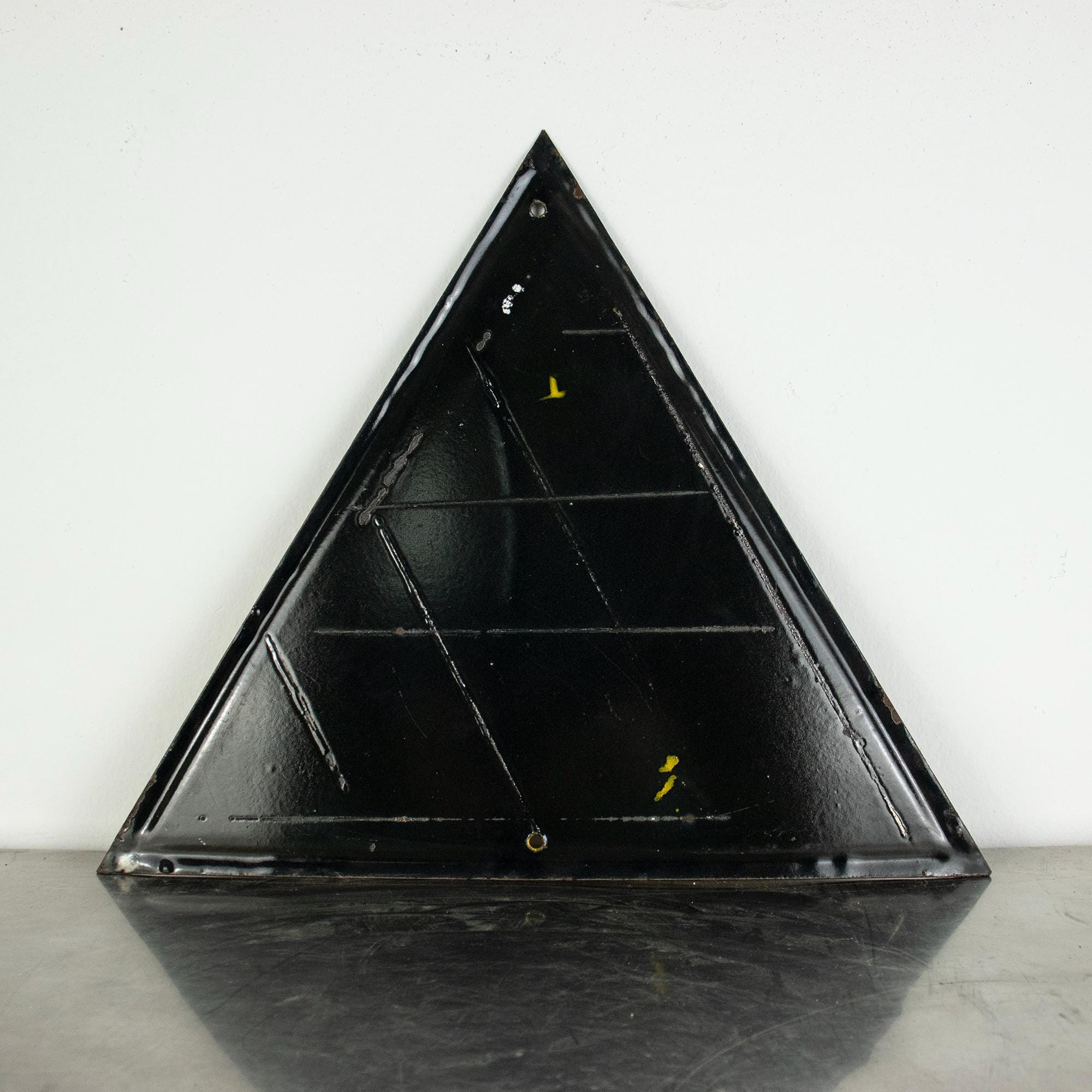 Manufactured in Communist Bulgaria, the sign is made of pressed tin metal coated with durable porcelain enamel in black and yellow. These types of safety signs were used in factories, mines, and state industrial facilities during the socialist period.