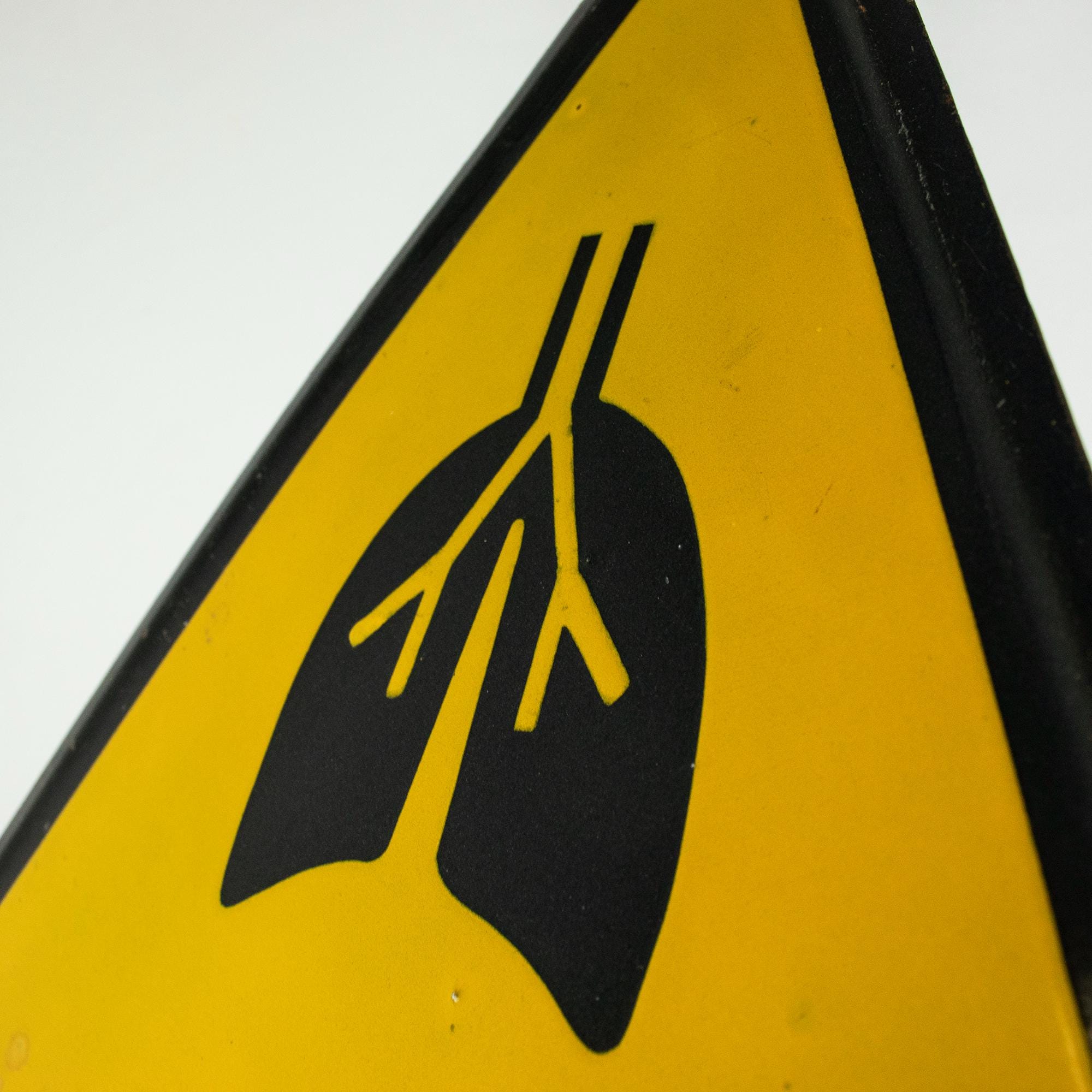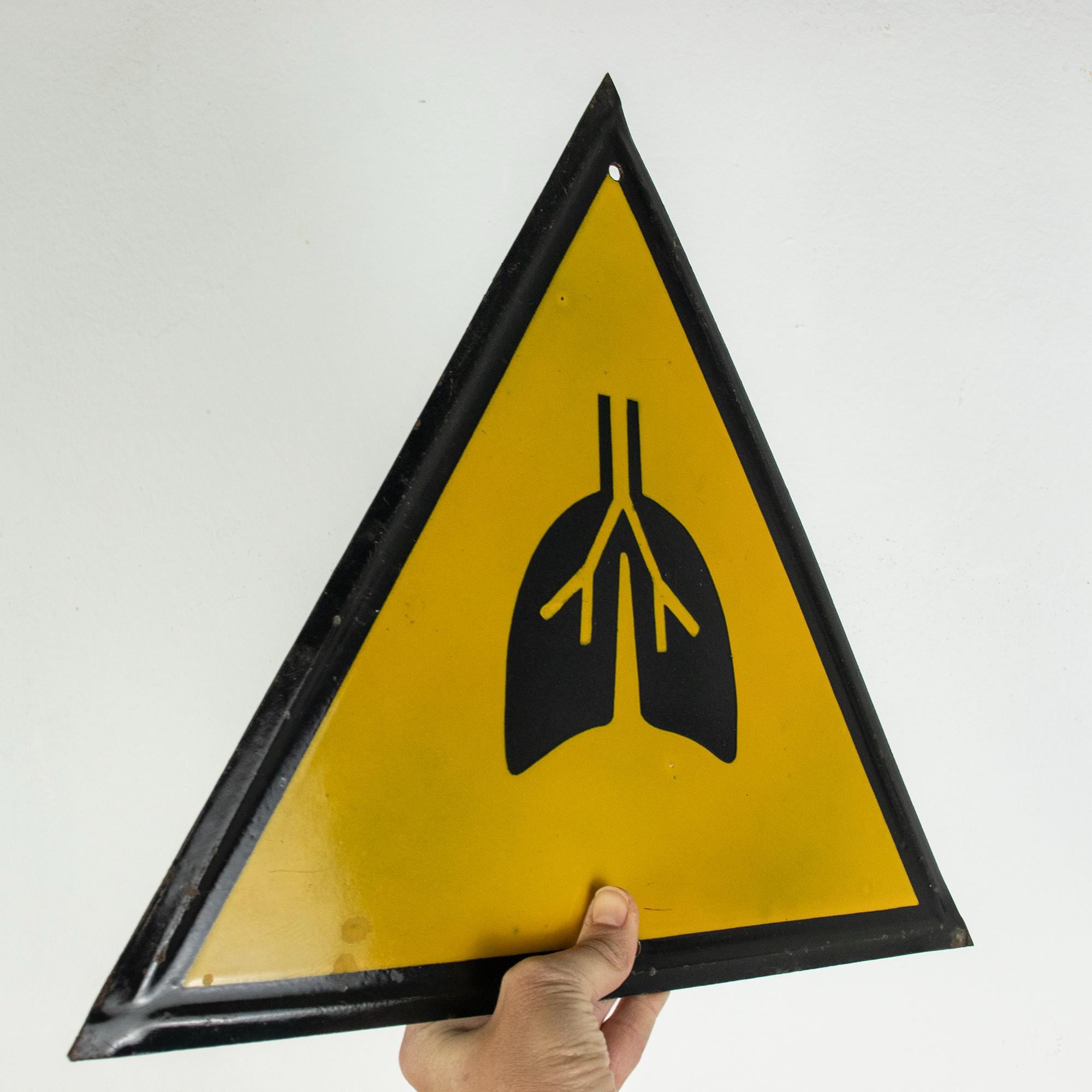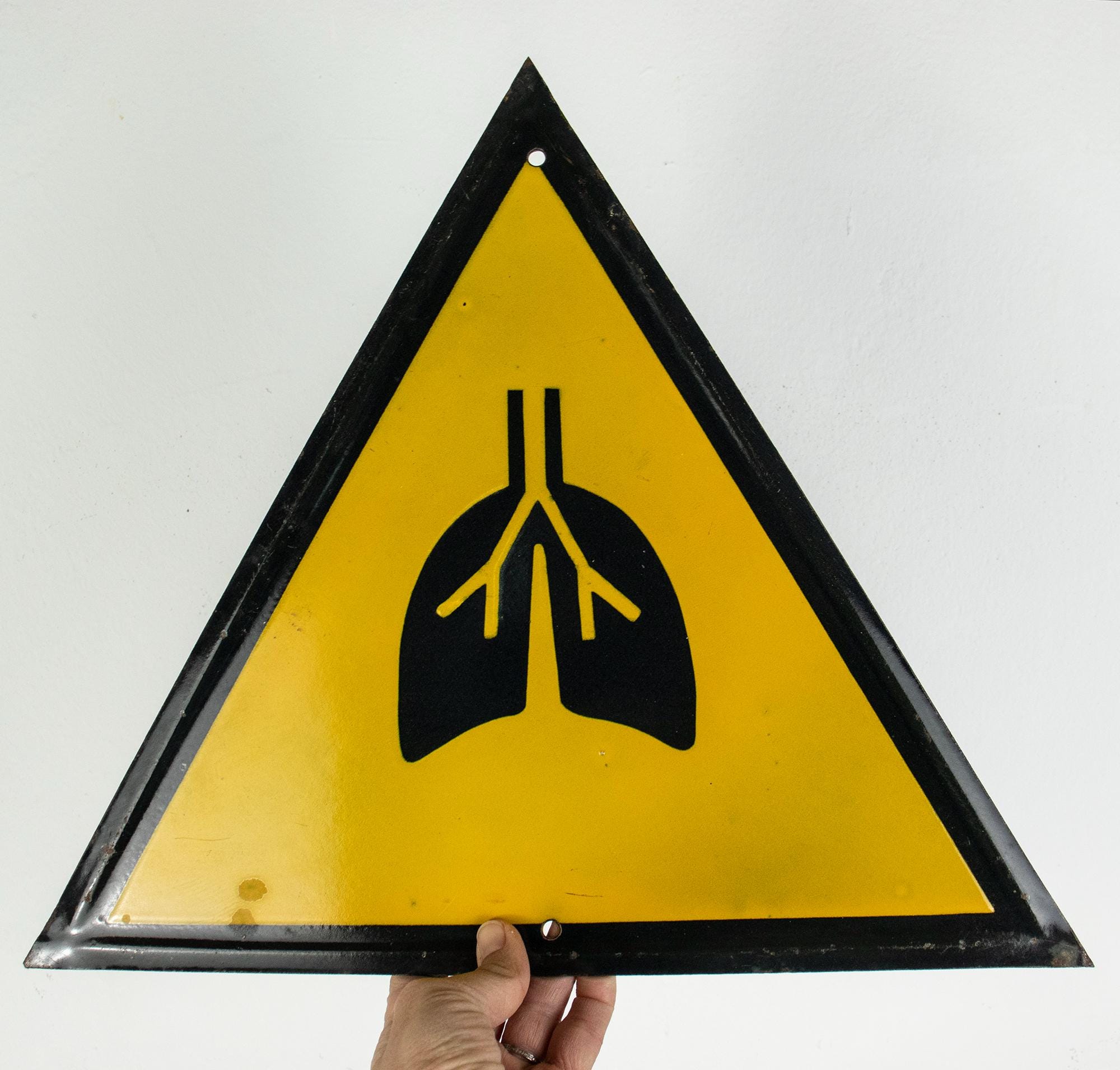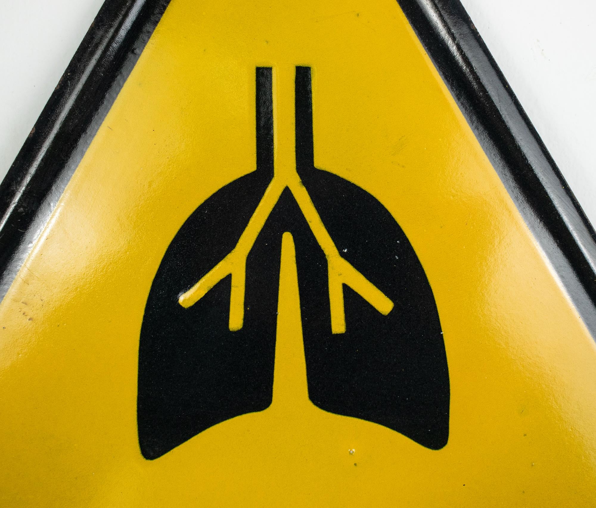 This striking triangular porcelain enamel sign features a bold black lung symbol against a vivid yellow background — a warning related to respiratory hazards in mining or heavy industrial environments.