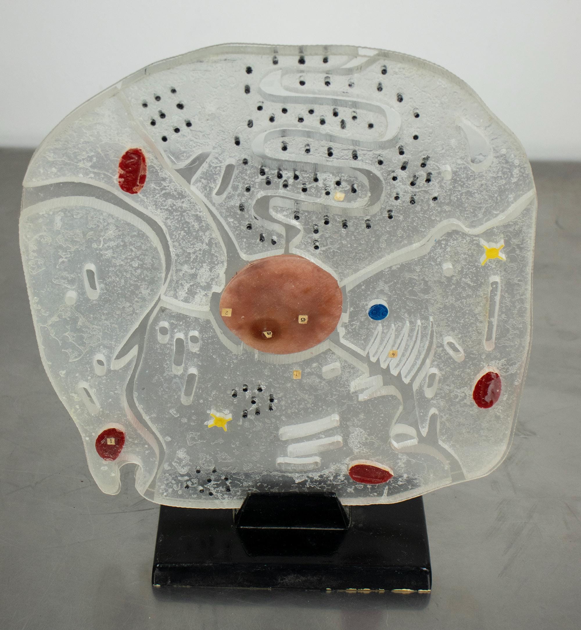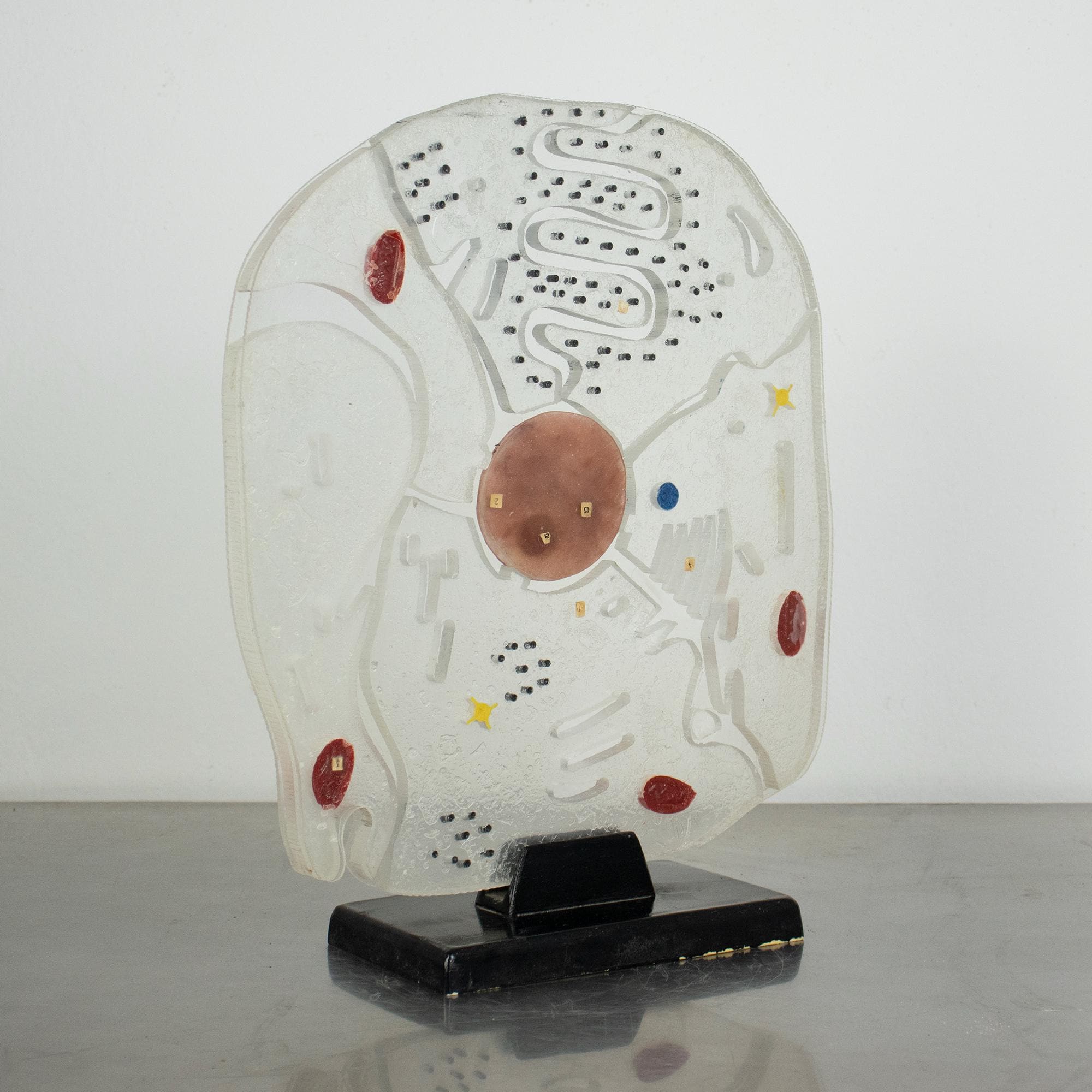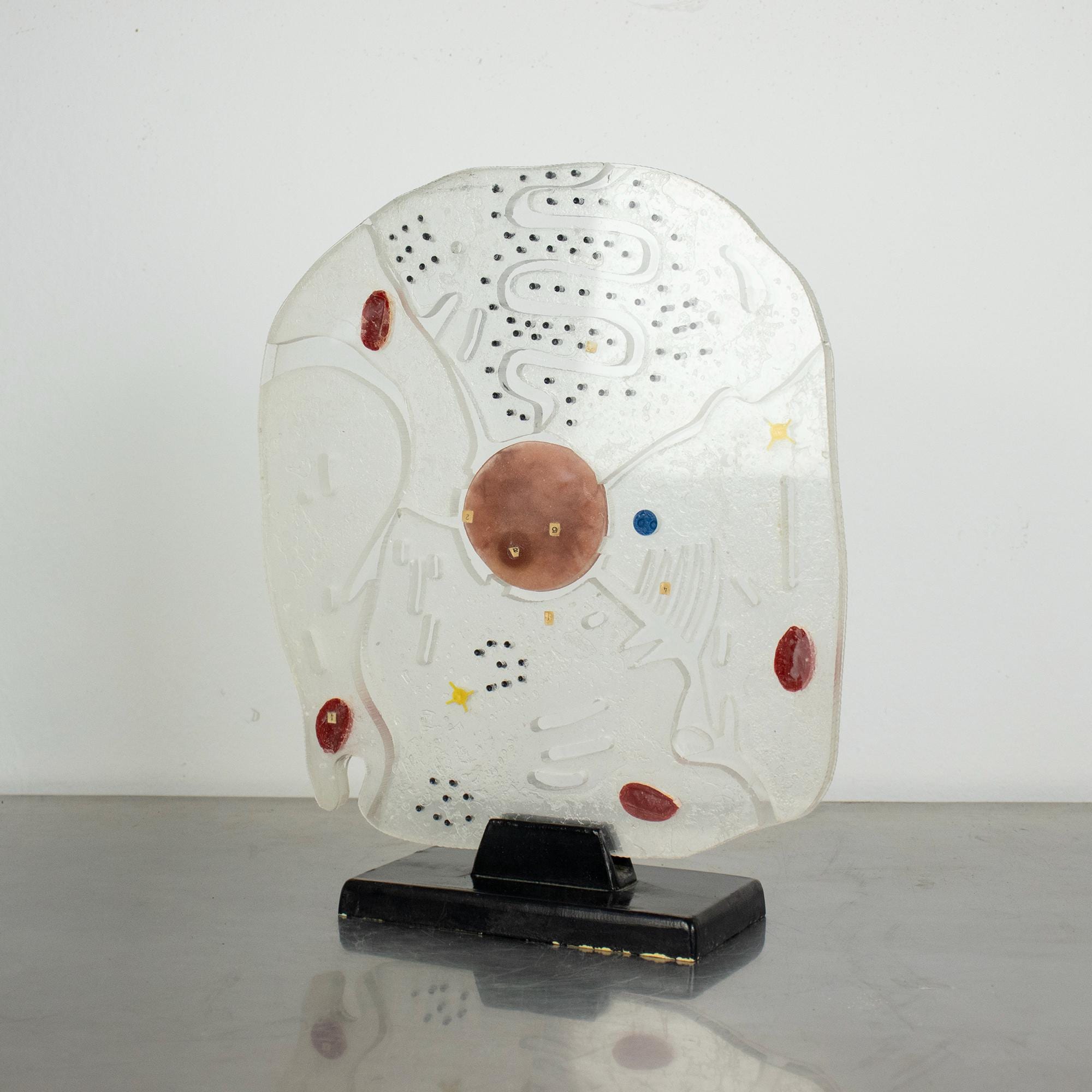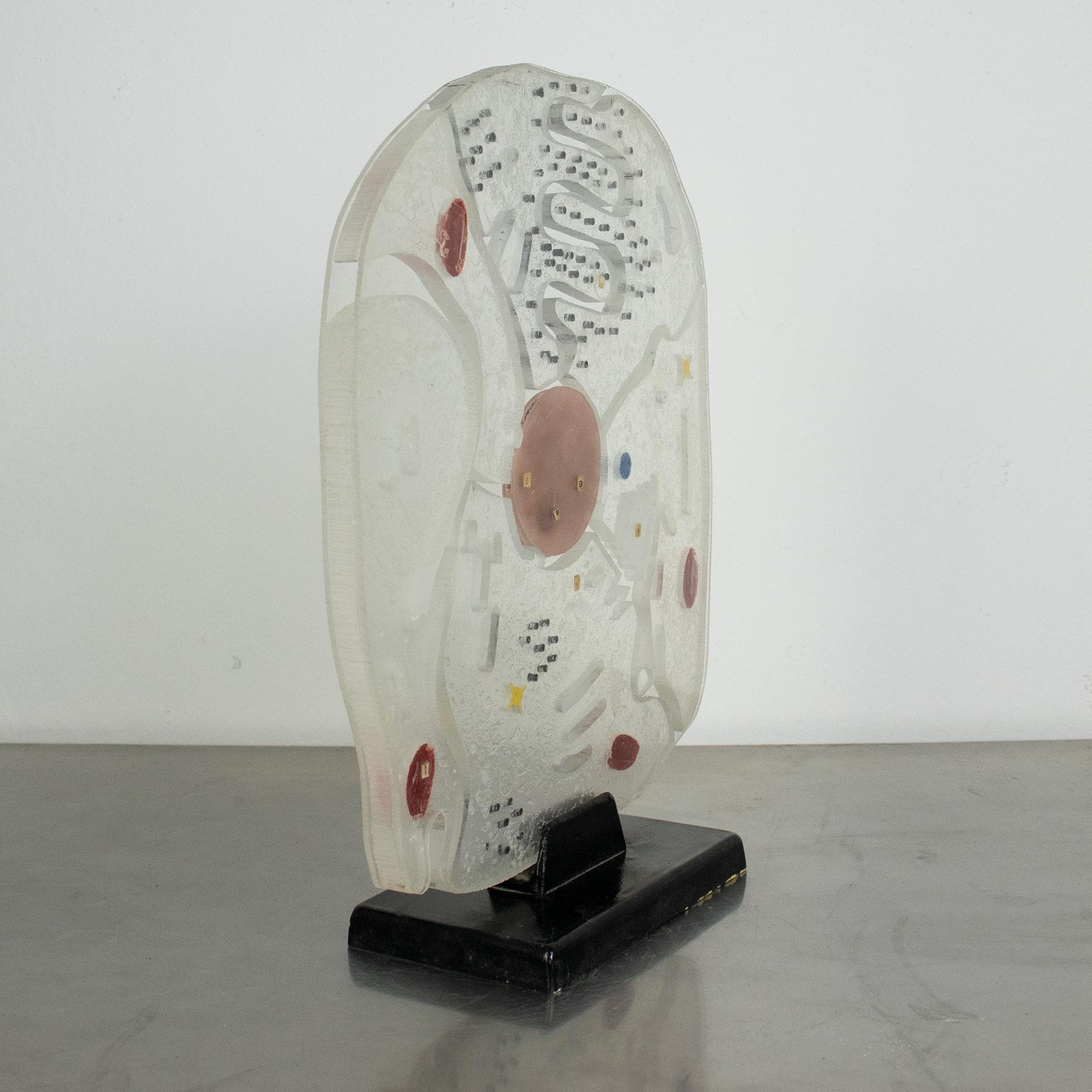 A wonderful vintage educational model of a eukaryotic animal cell, made of hard plastic and mounted on a black wooden base.