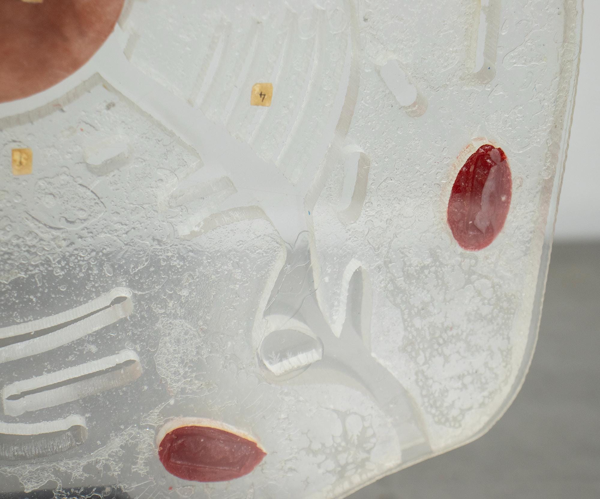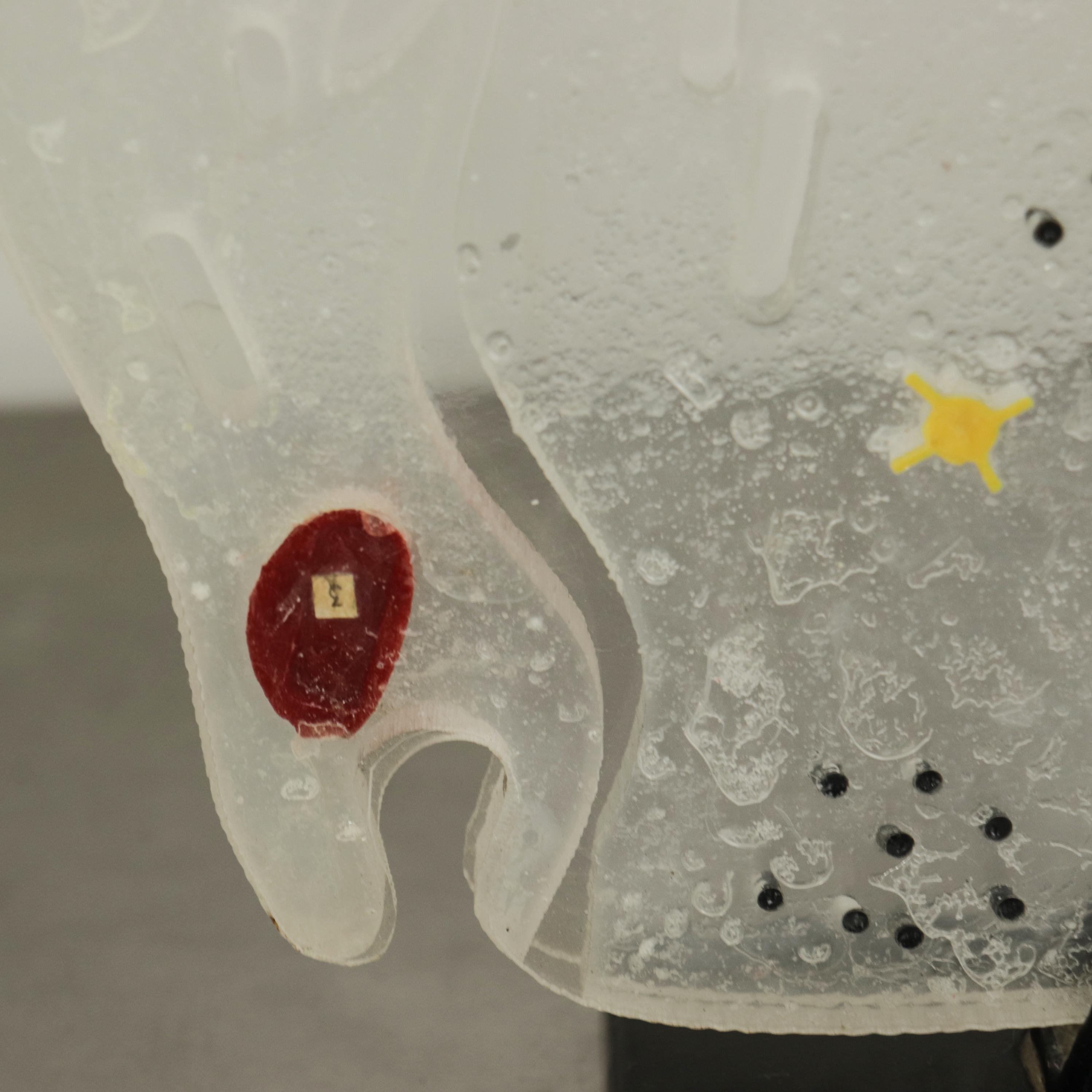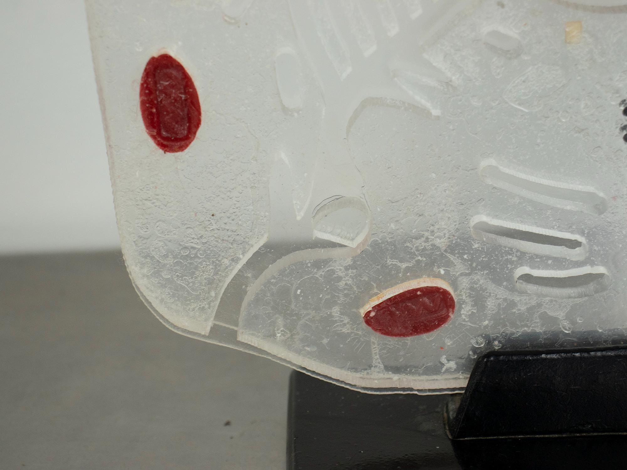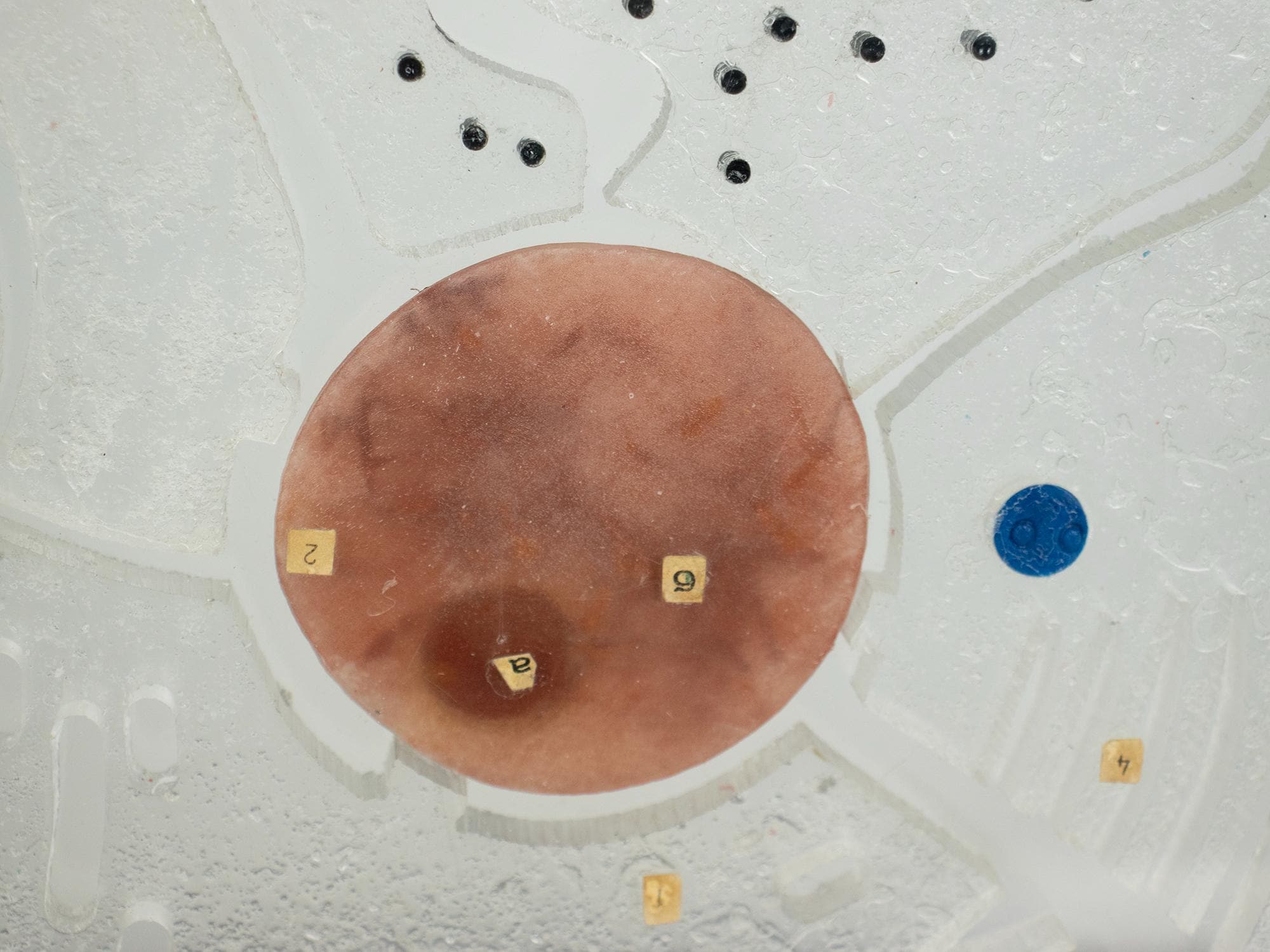 A wonderful vintage educational model of a eukaryotic animal cell, made of hard plastic and mounted on a black wooden base.