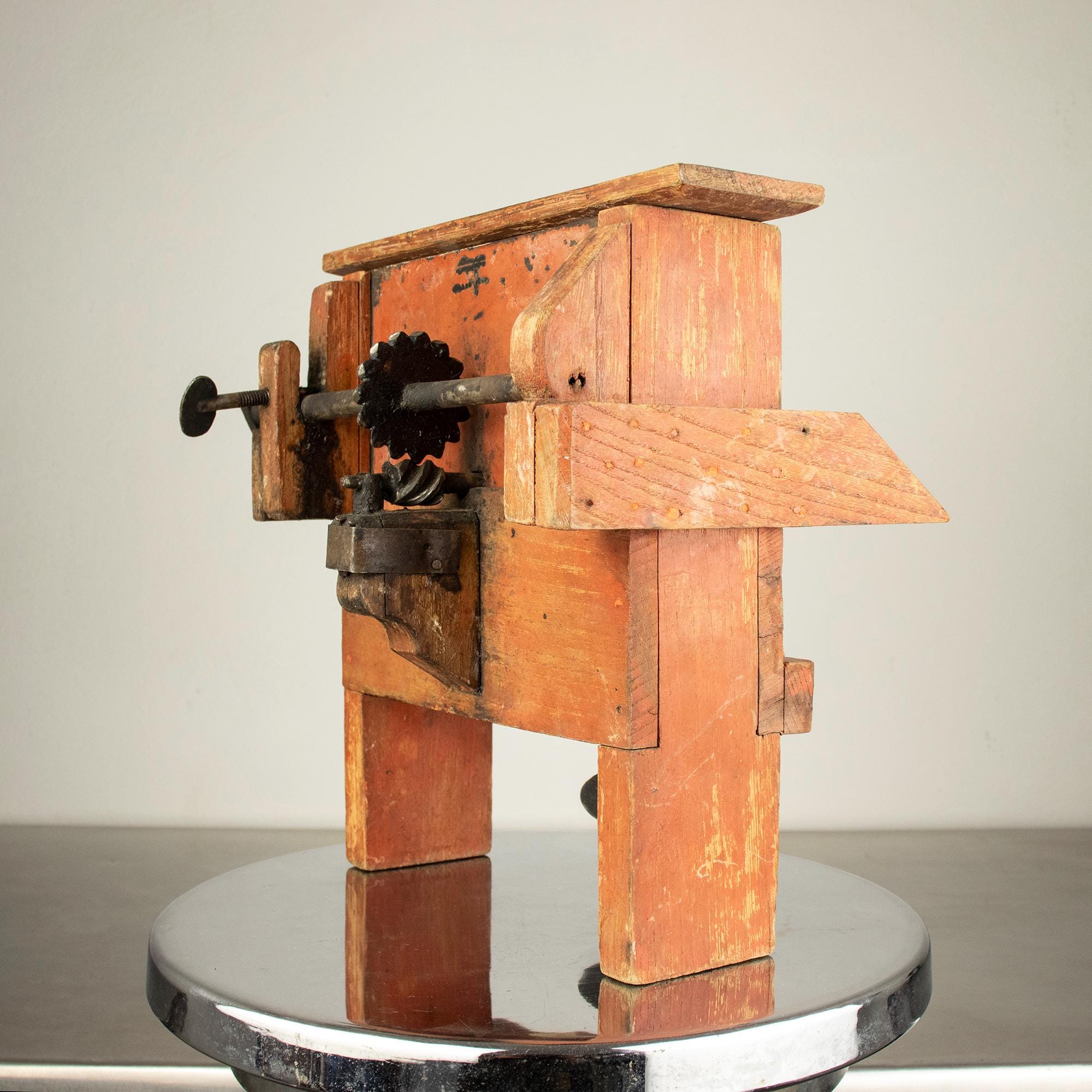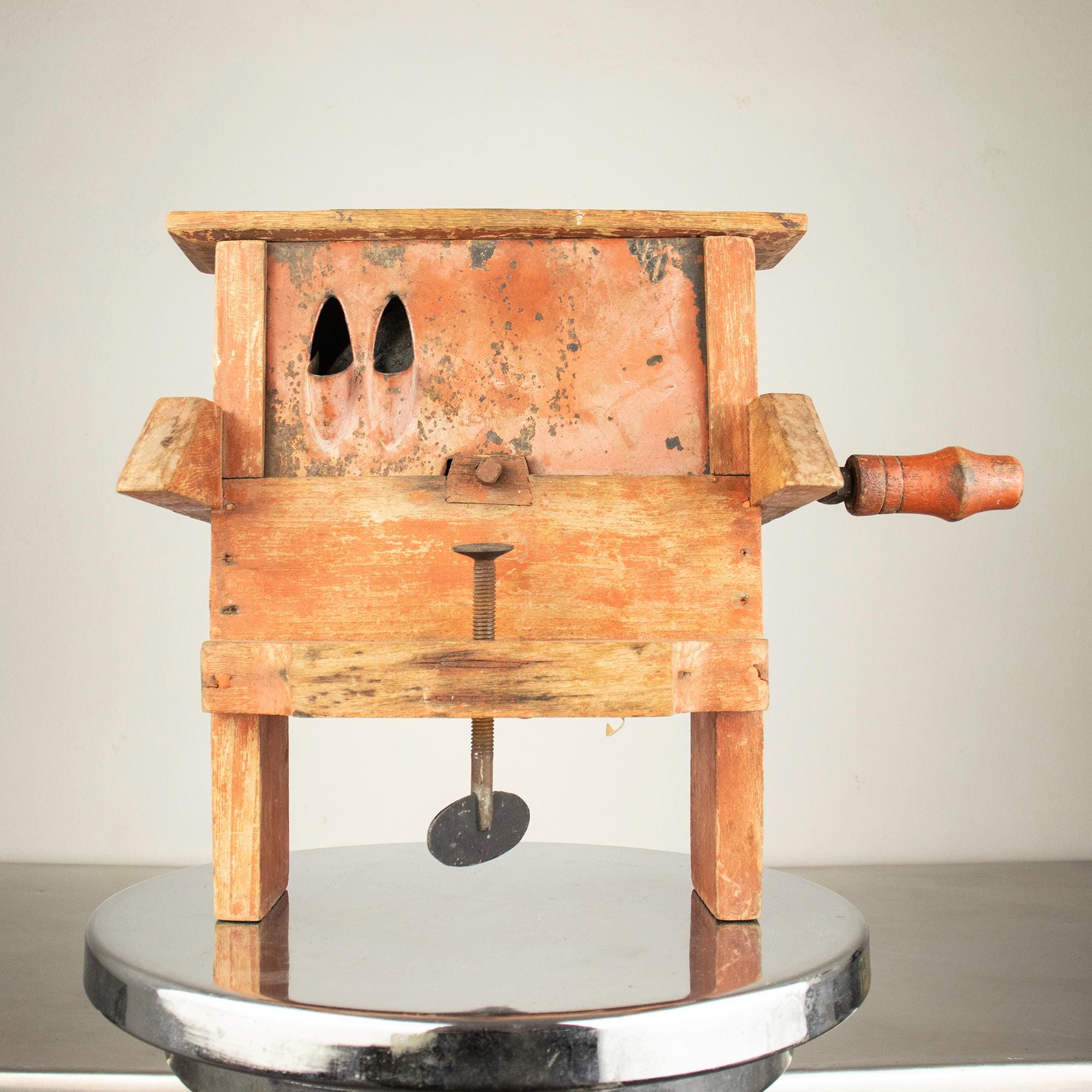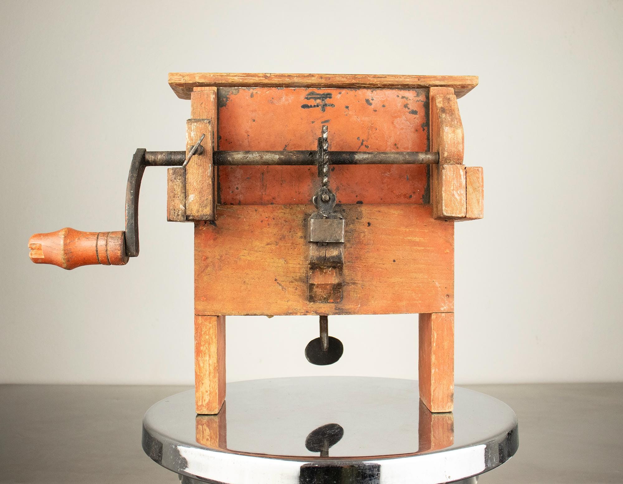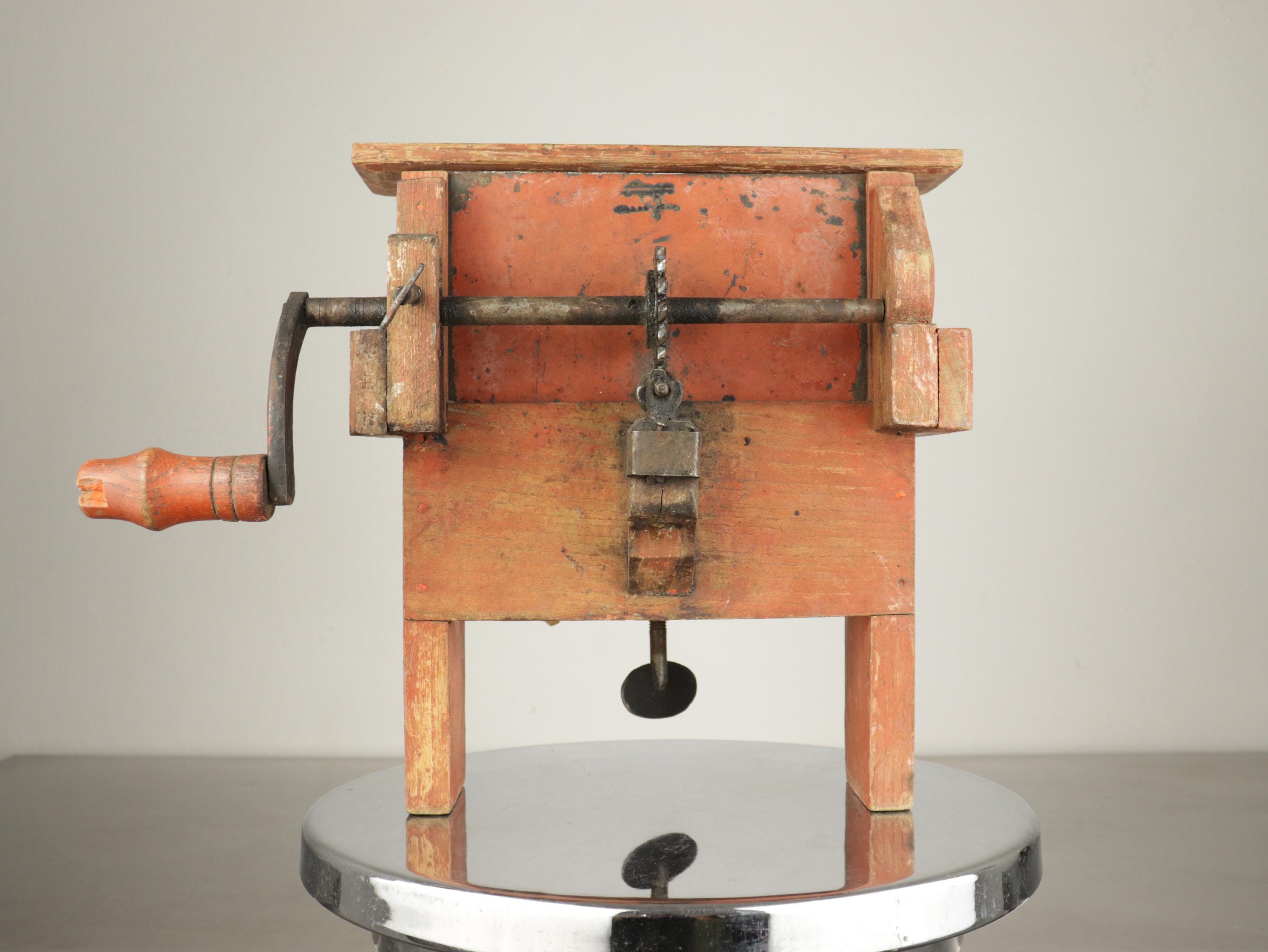 Unlike the common small cast-iron kitchen slicers, this is a large bench-mounted model with a strong architectural presence. The original painted surface has developed a rich, natural patina over decades of use, giving it warmth and authenticity that cannot be replicated.