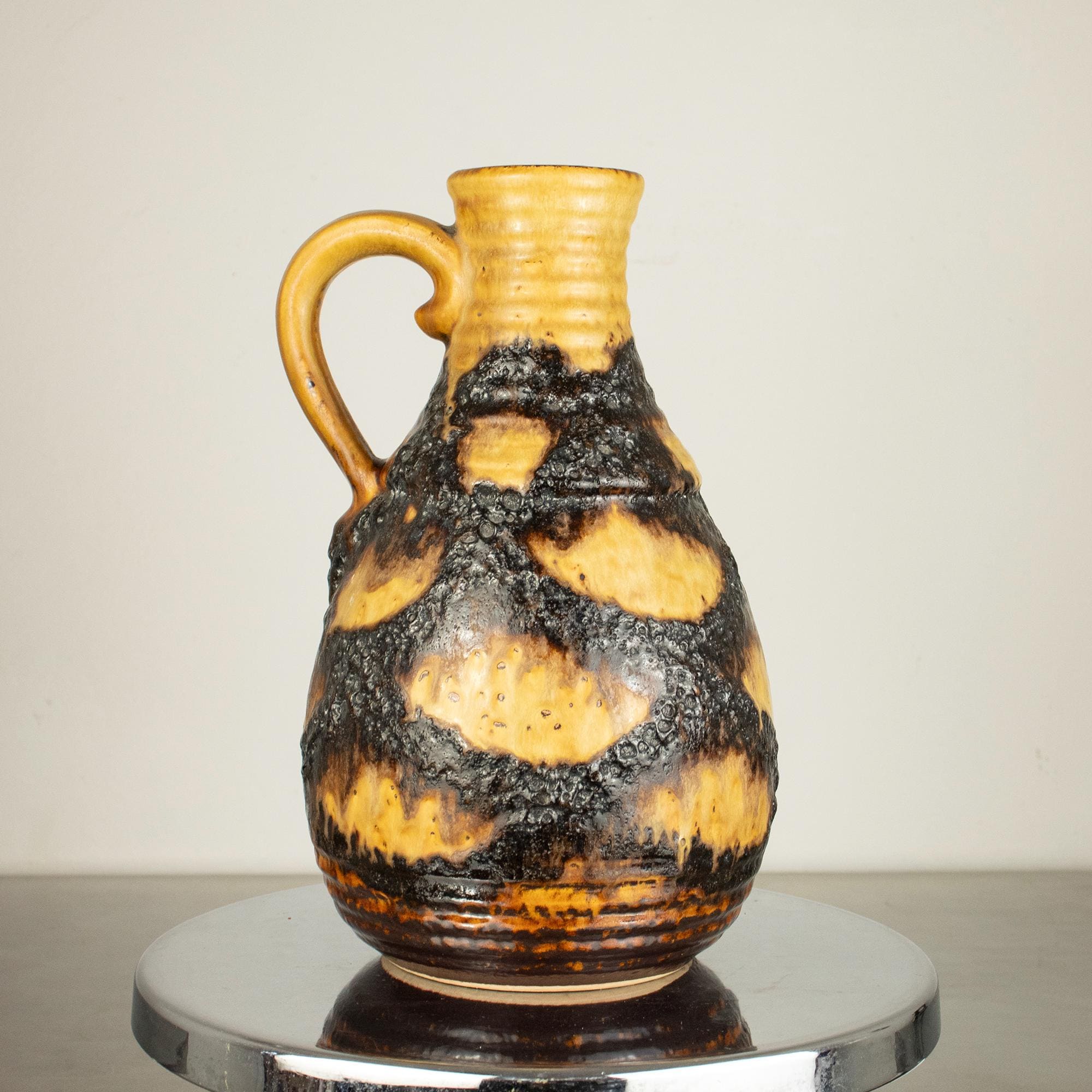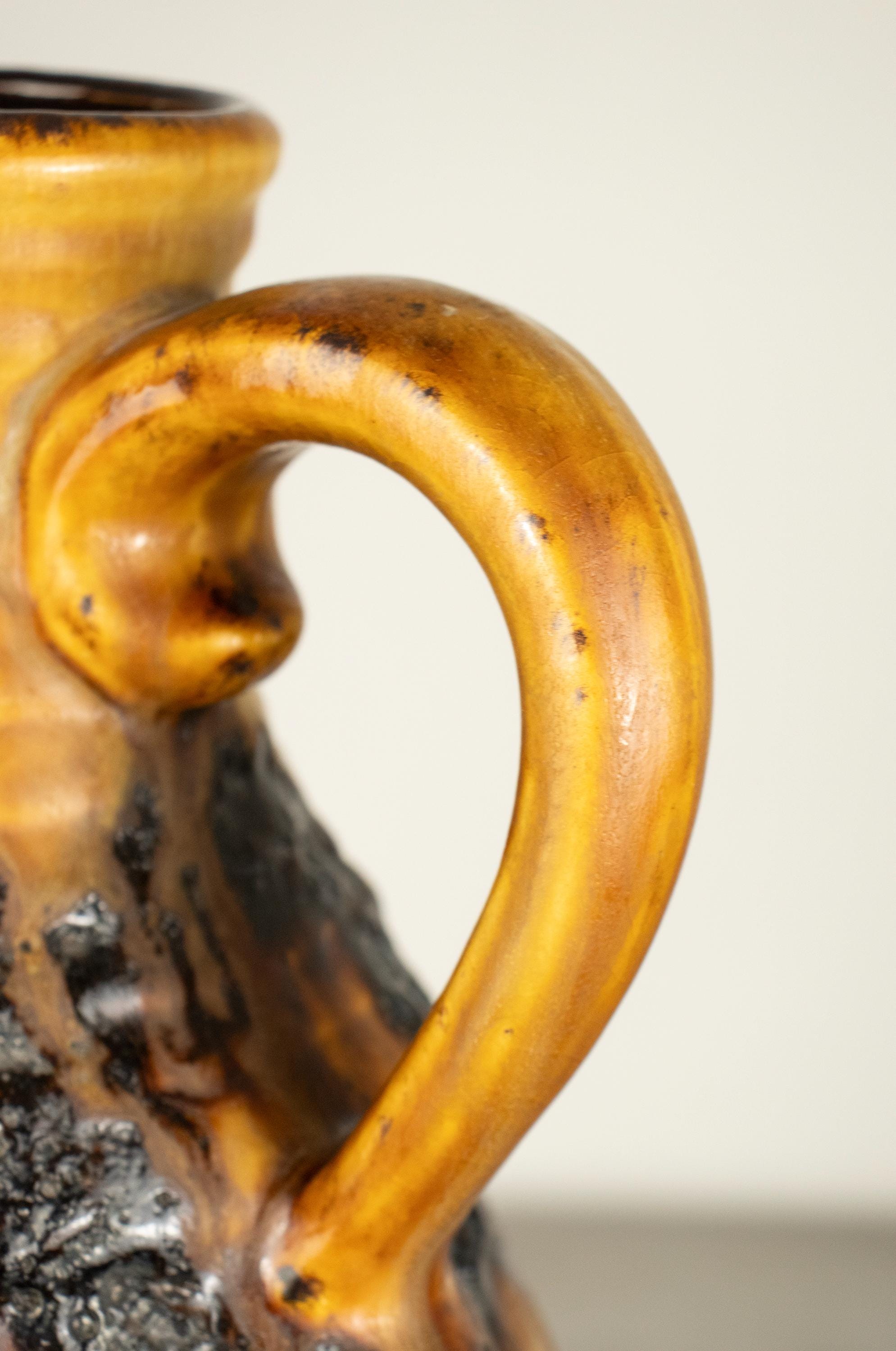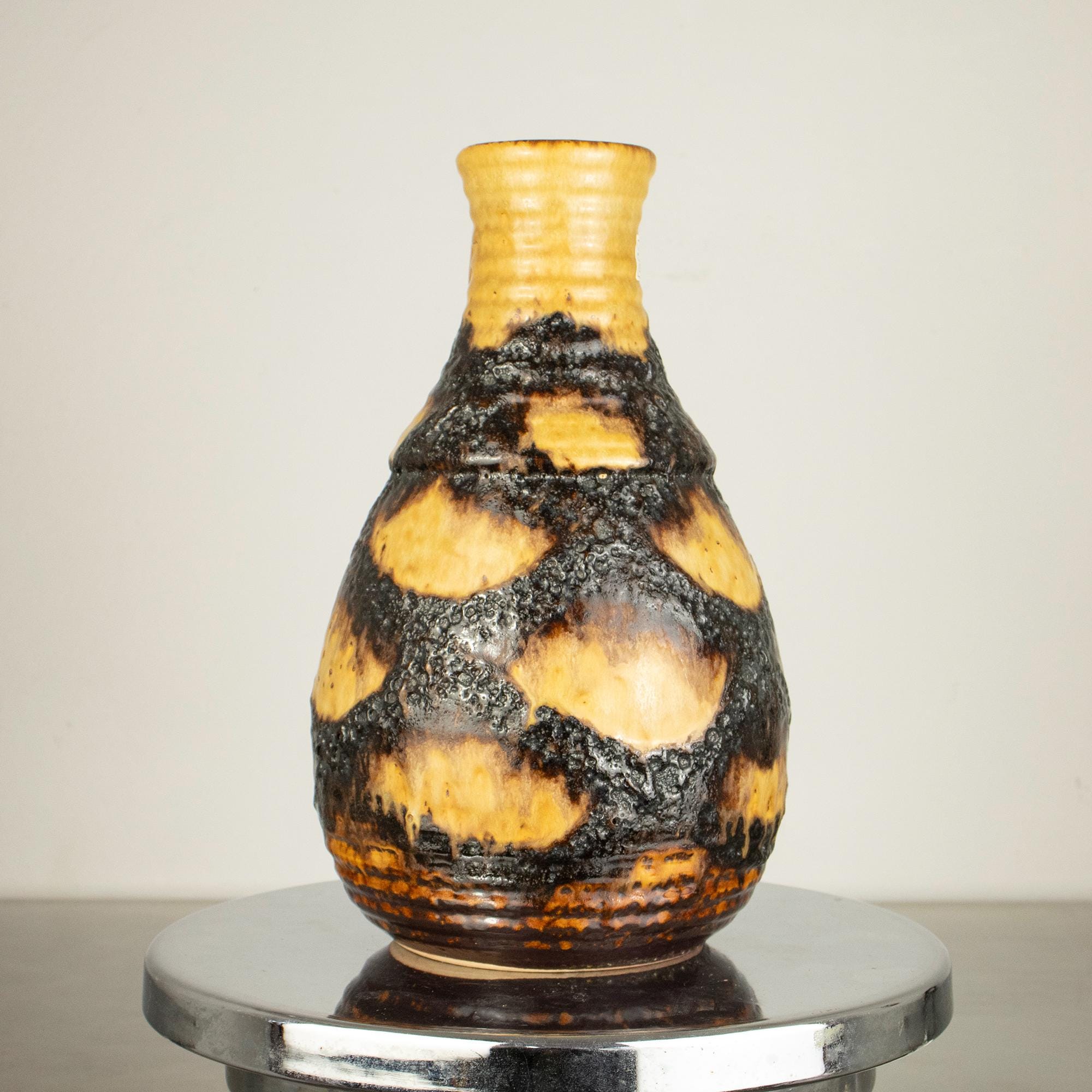This is a true statement piece — tall, heavy, and visually powerful. The vase features the classic fat lava volcanic texture in deep dark brown and black, contrasted beautifully with a warm honey-yellow glaze flowing down from the rim. The dramatic surface and strong form make it a perfect example of iconic West German pottery design.