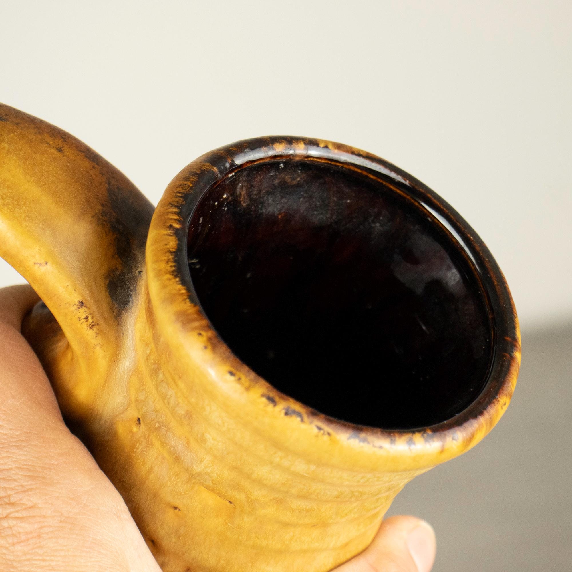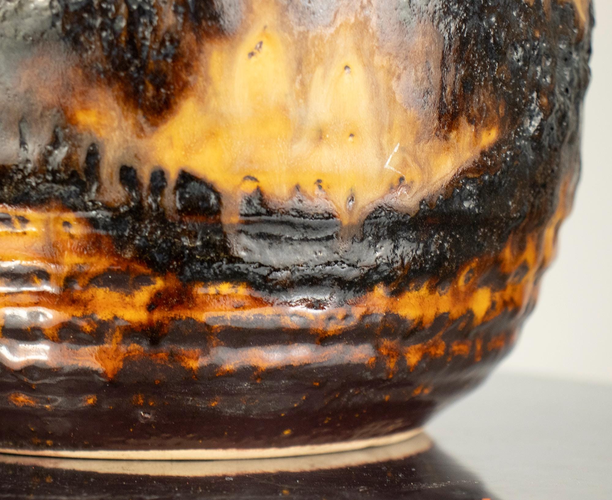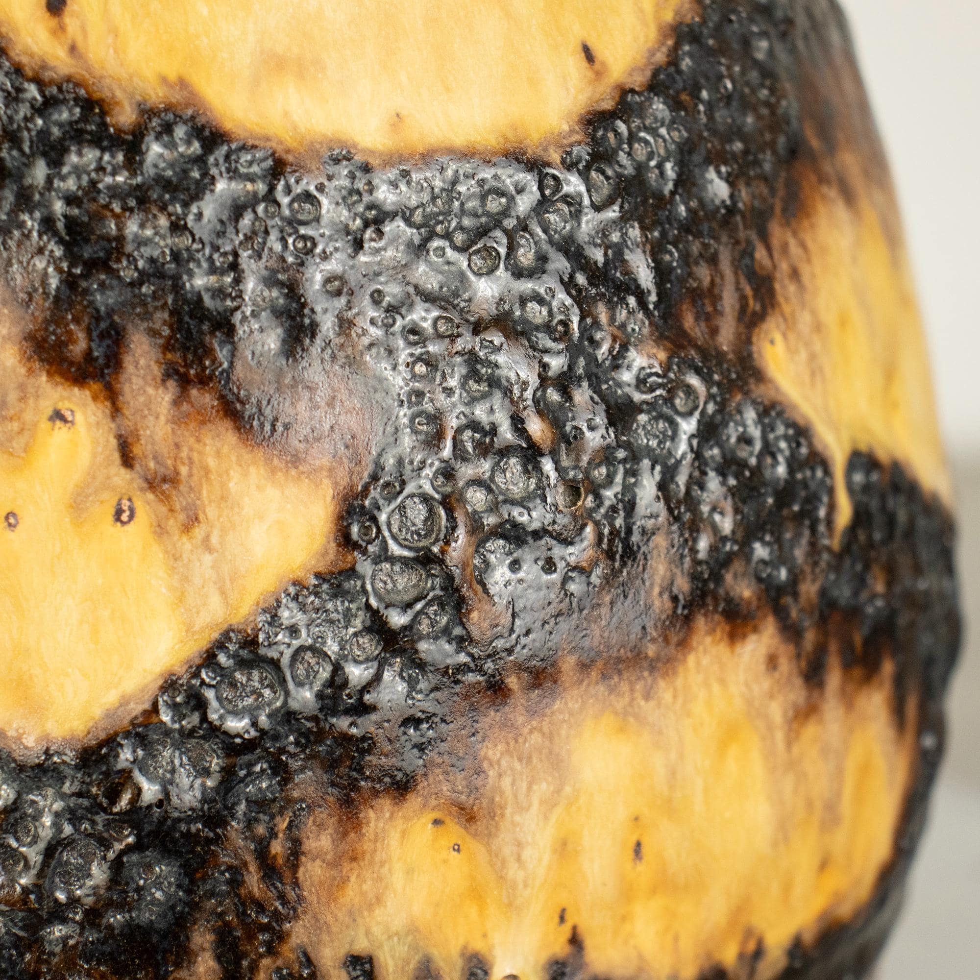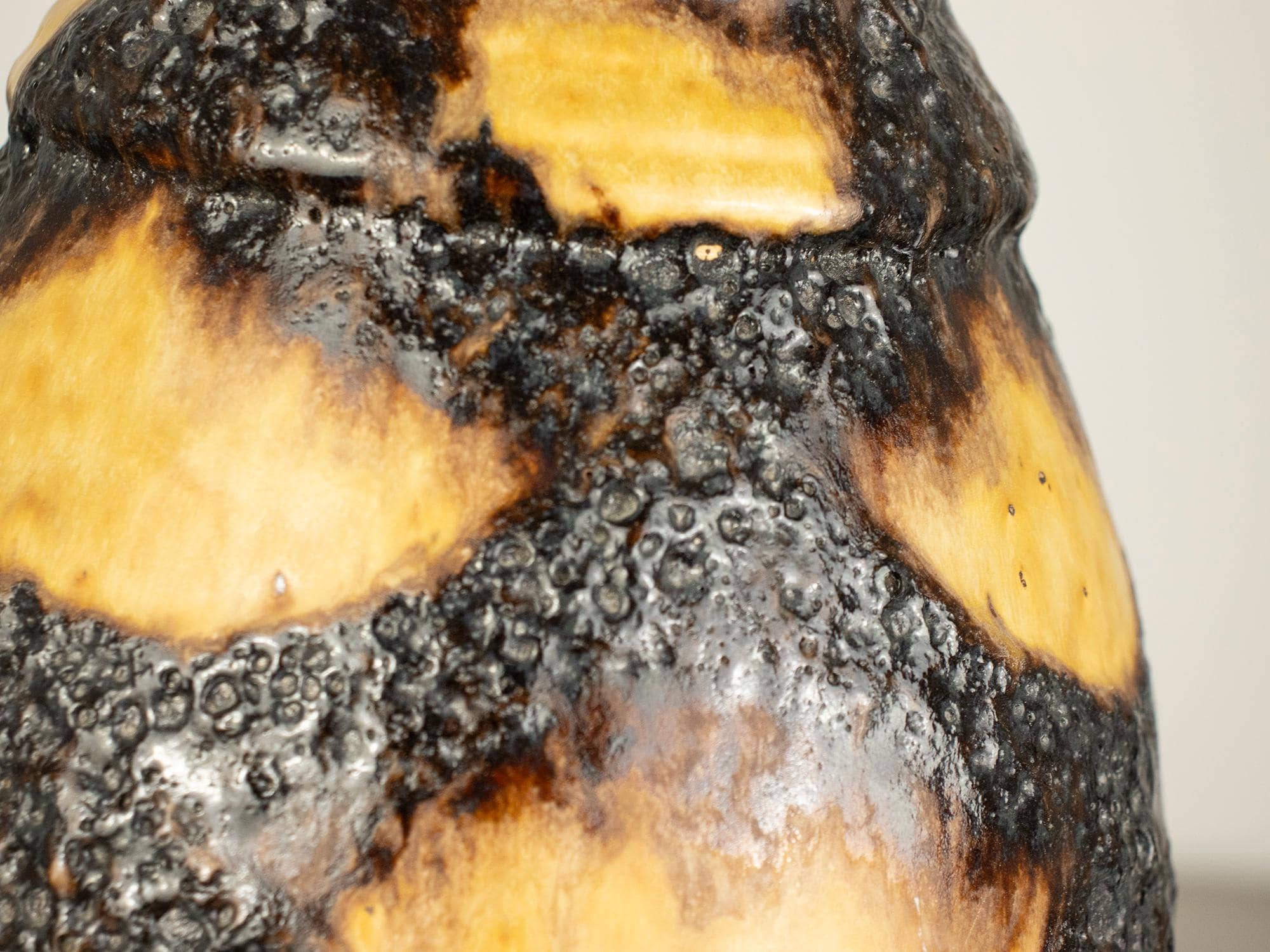This is a true statement piece — tall, heavy, and visually powerful. The vase features the classic fat lava volcanic texture in deep dark brown and black, contrasted beautifully with a warm honey-yellow glaze flowing down from the rim. The dramatic surface and strong form make it a perfect example of iconic West German pottery design.