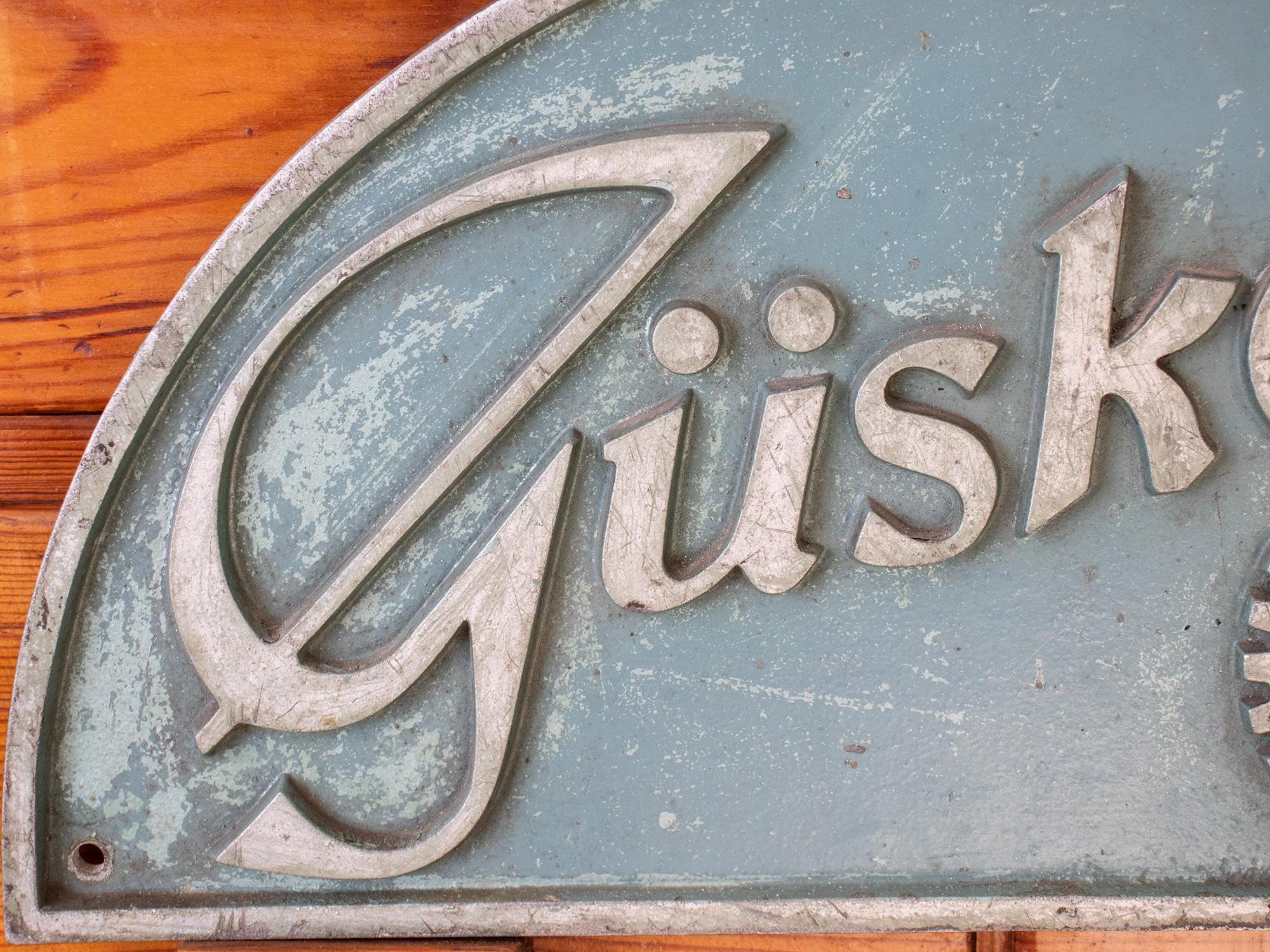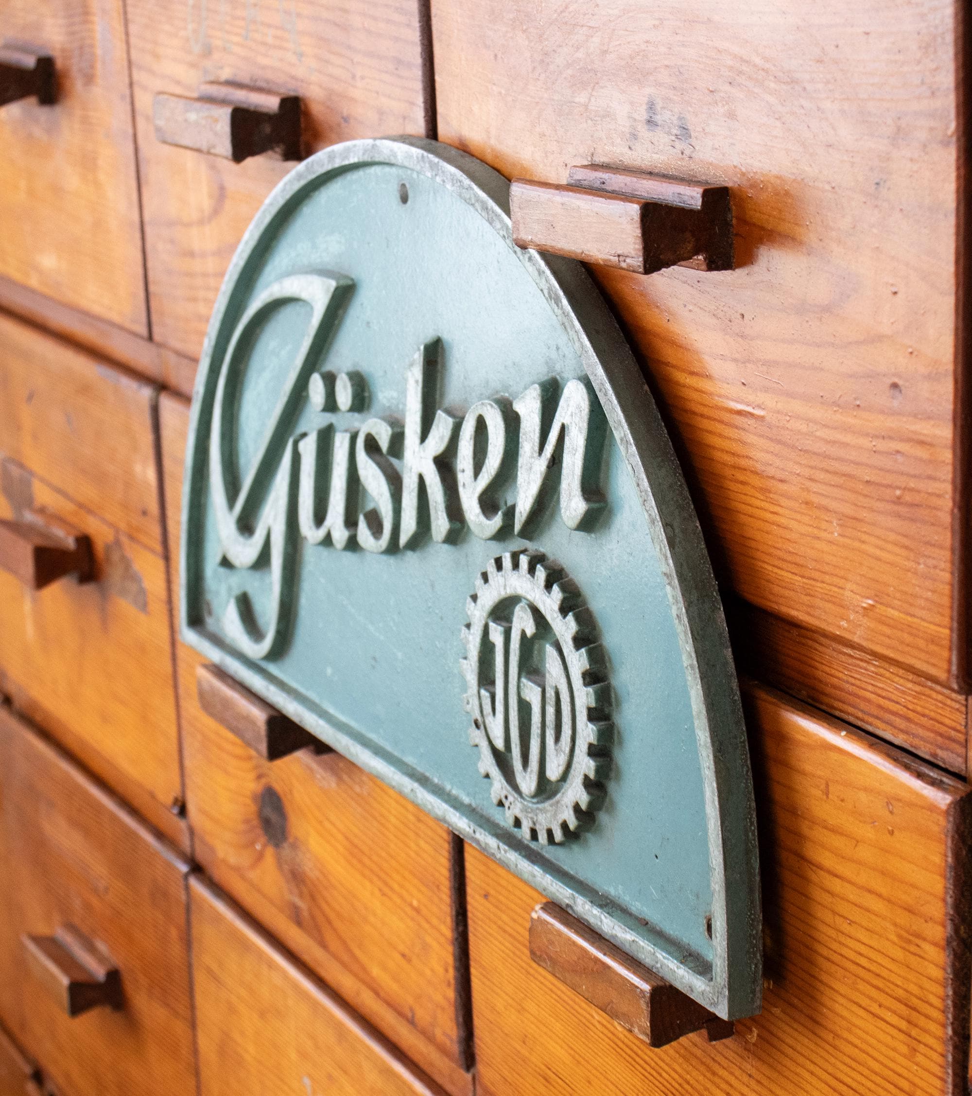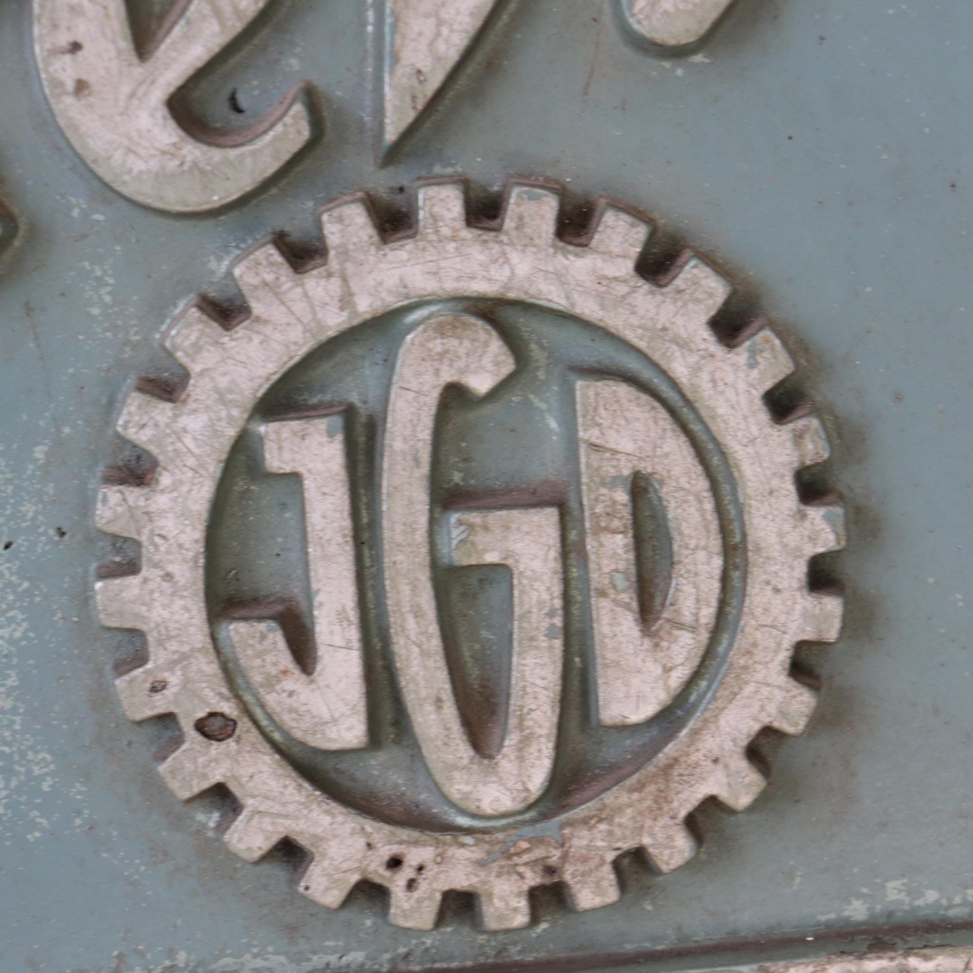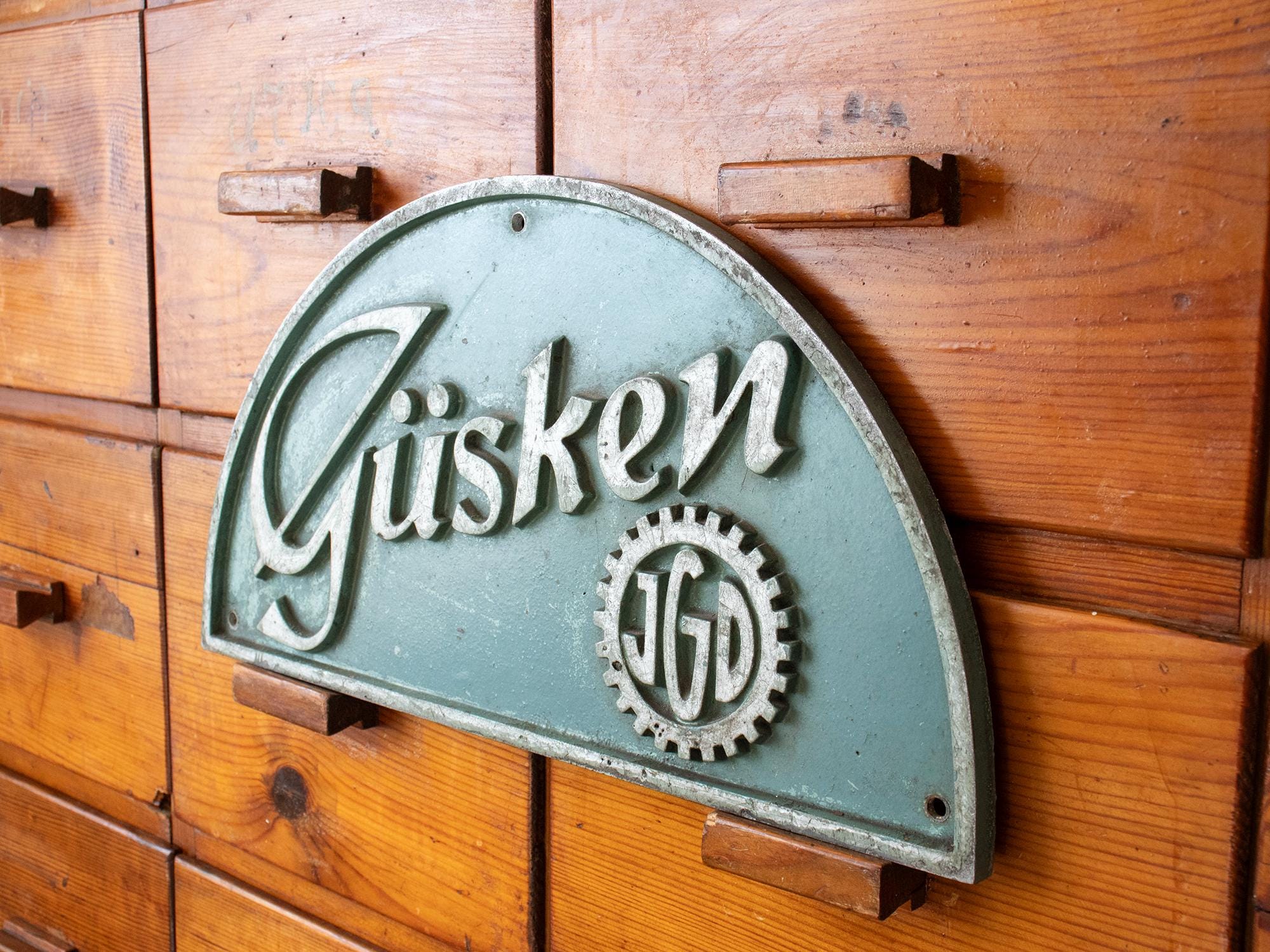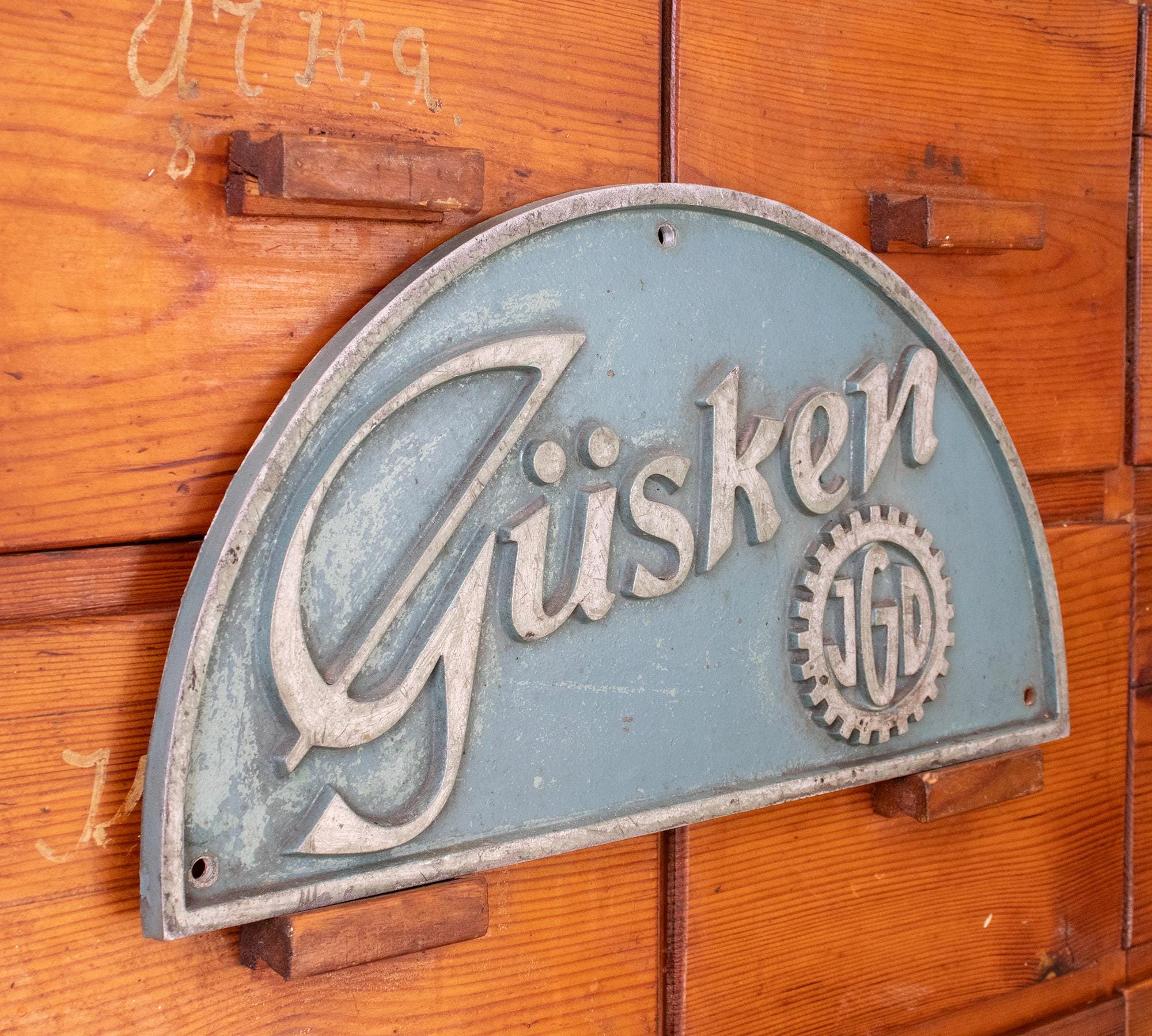 An amazing vintage Gusken industrial machine sign from the 1970s, originally mounted on the company's velvet loom machinery.