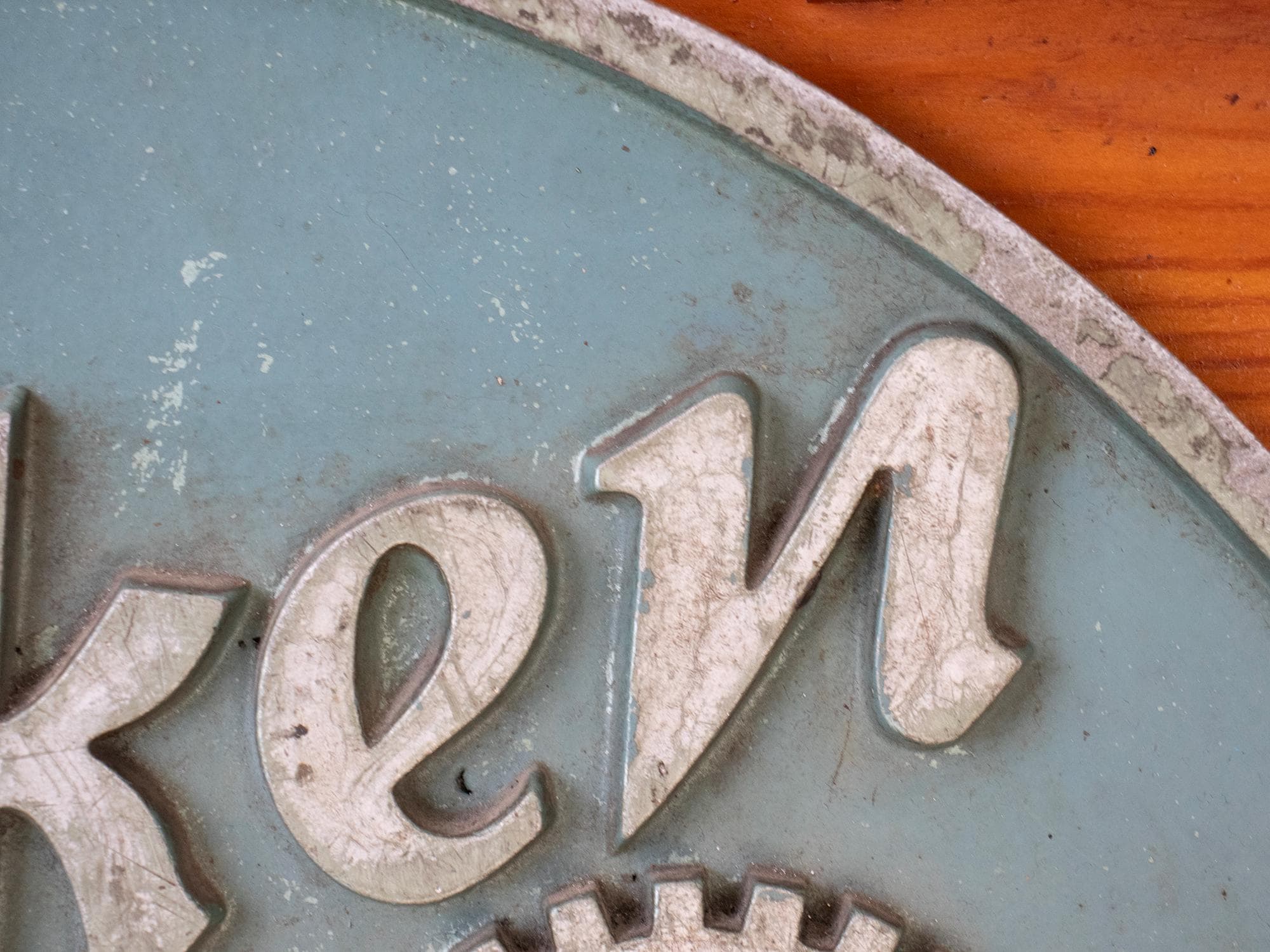 The surface has developed a natural patina over time, highlighting the depth of the lettering and the design's mechanical aesthetic. The semi-circular shape and gear emblem give the piece a striking visual presence.