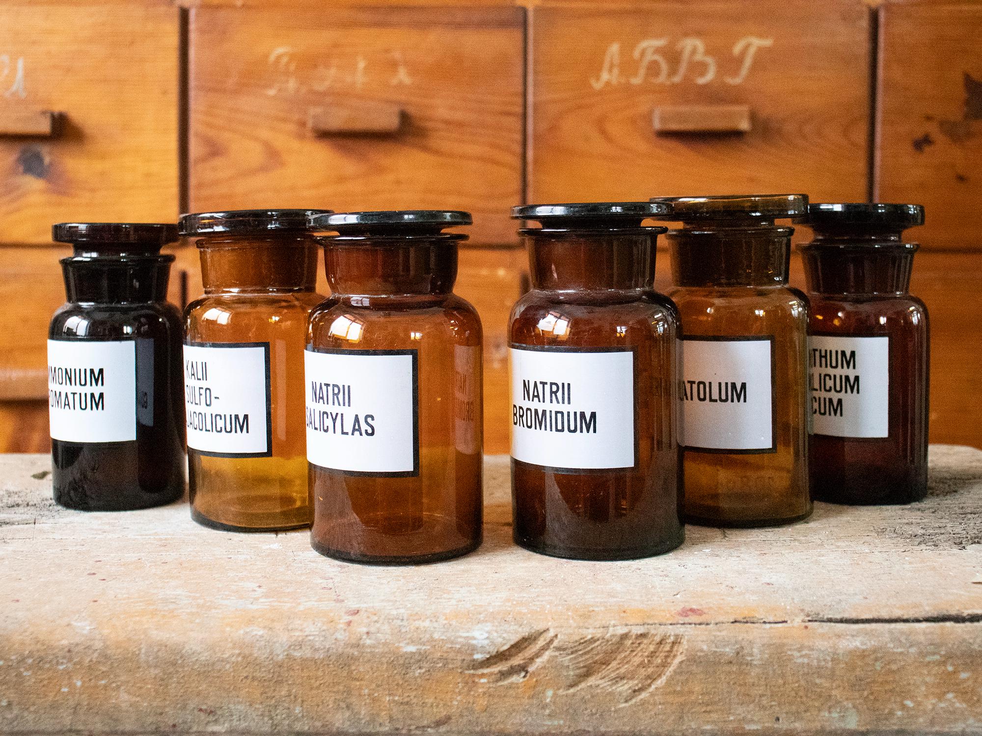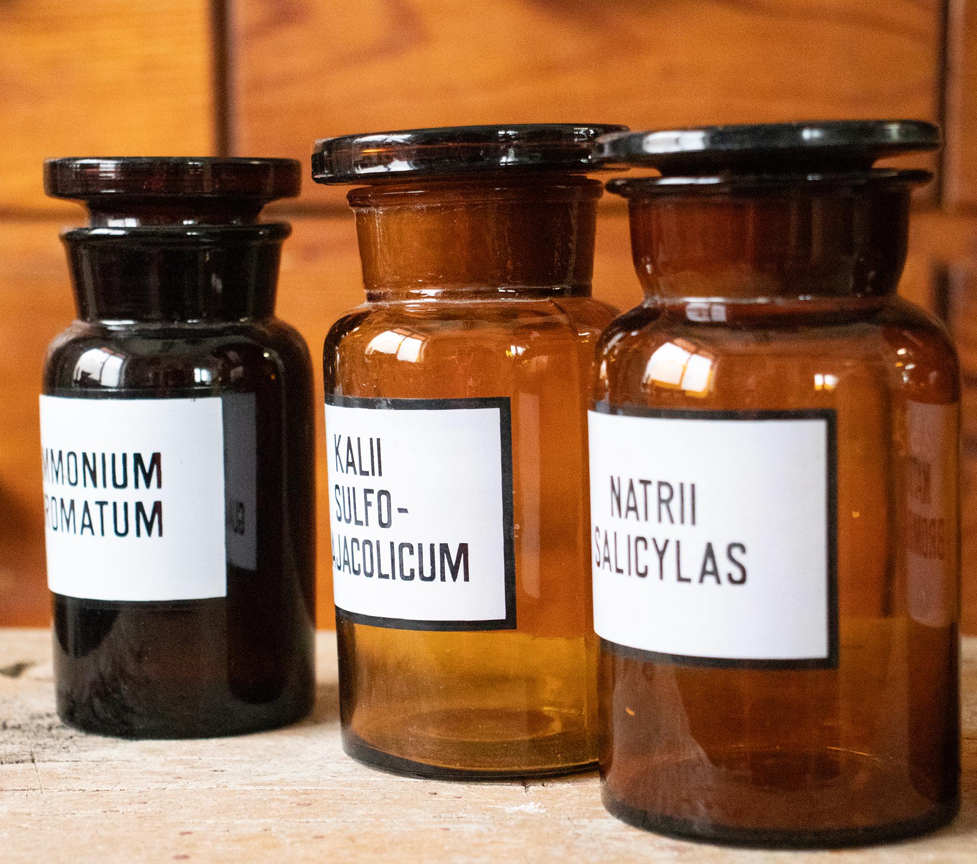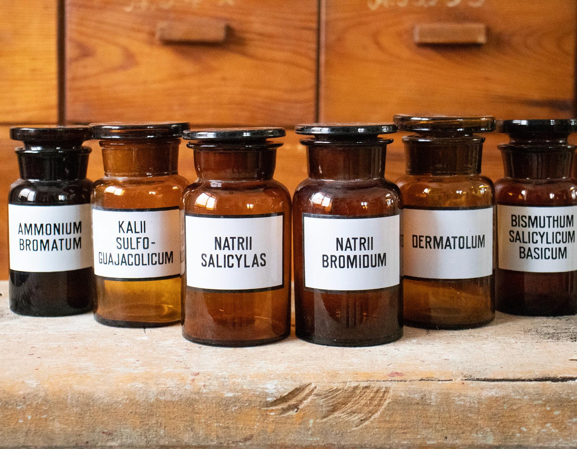 A charming set of vintage apothecary bottles made from rich amber glass, each finished with a classic glass stopper and clean pharmaceutical label.