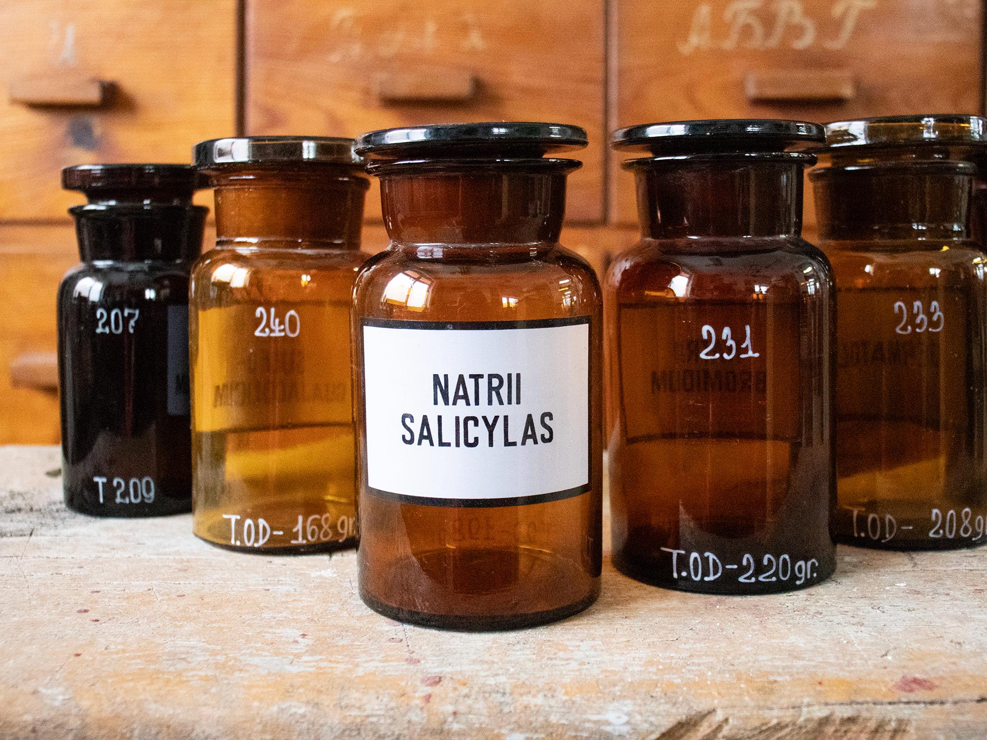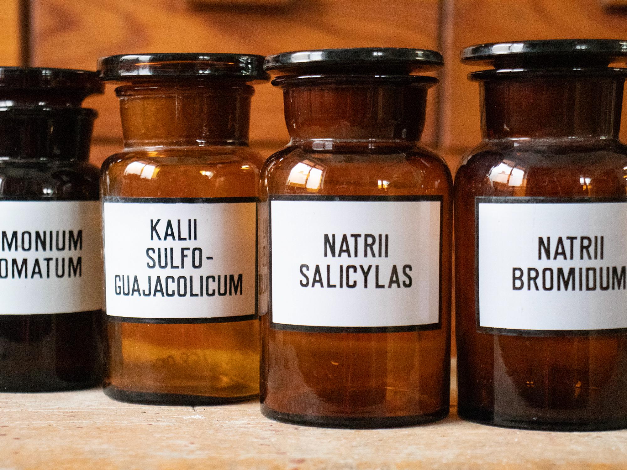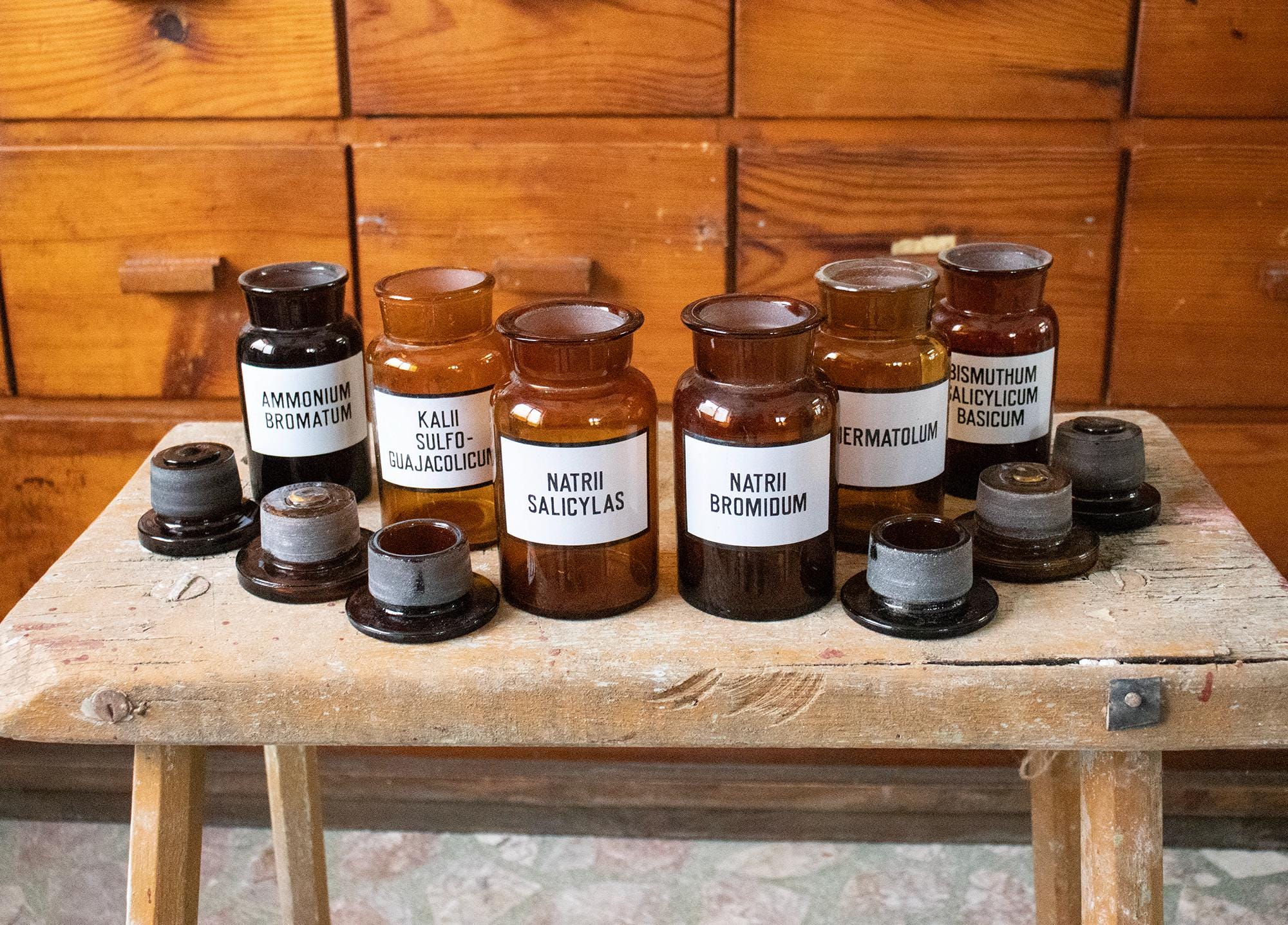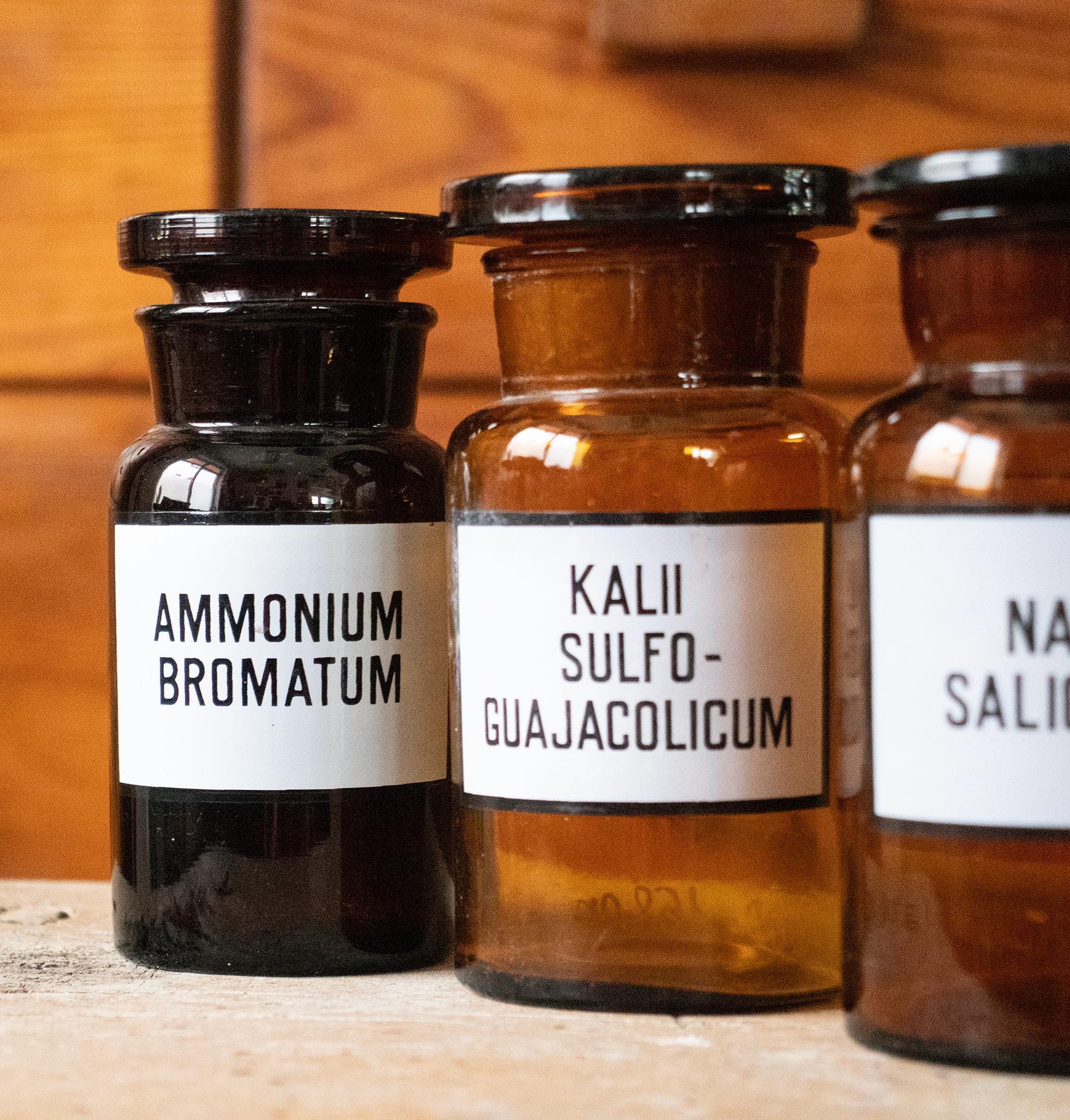 A charming set of vintage apothecary bottles made from rich amber glass, each finished with a classic glass stopper and clean pharmaceutical label.