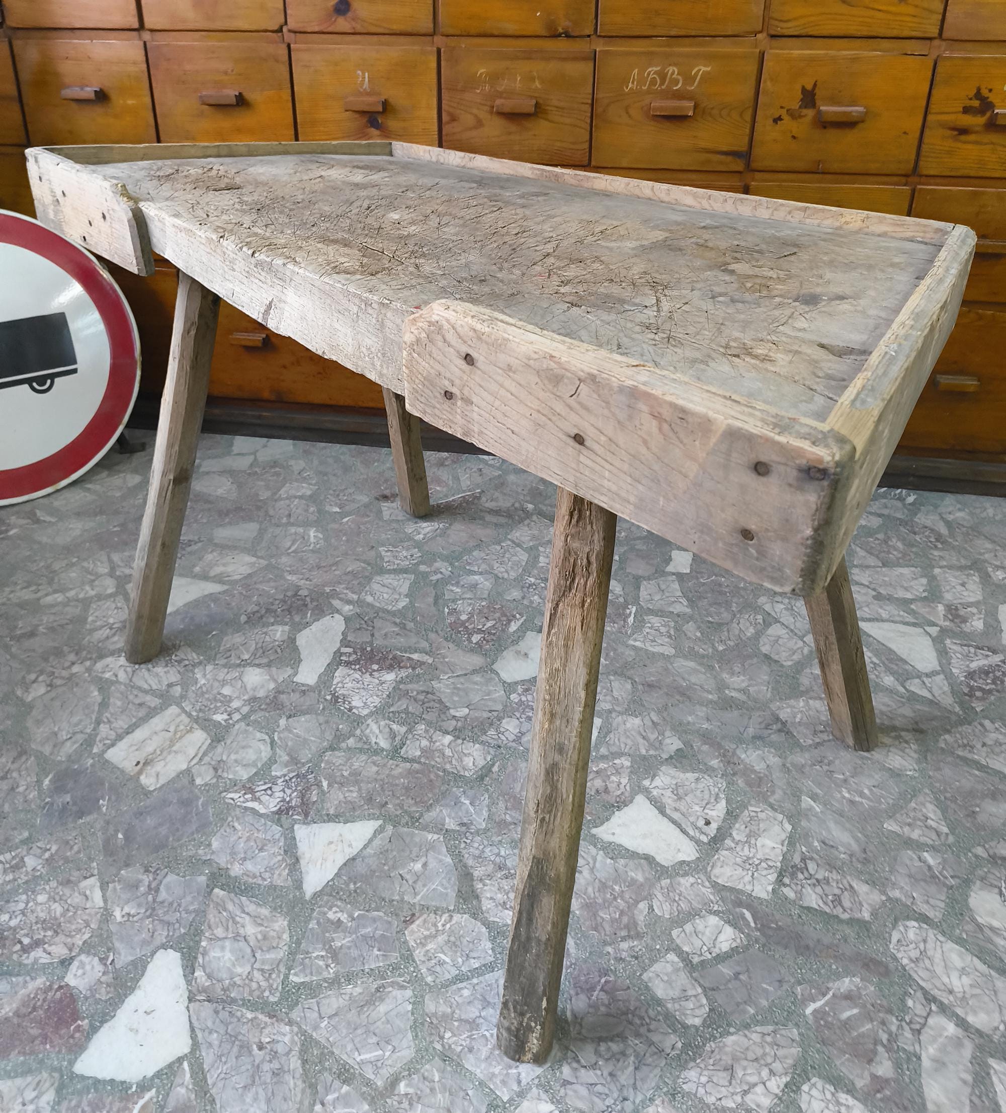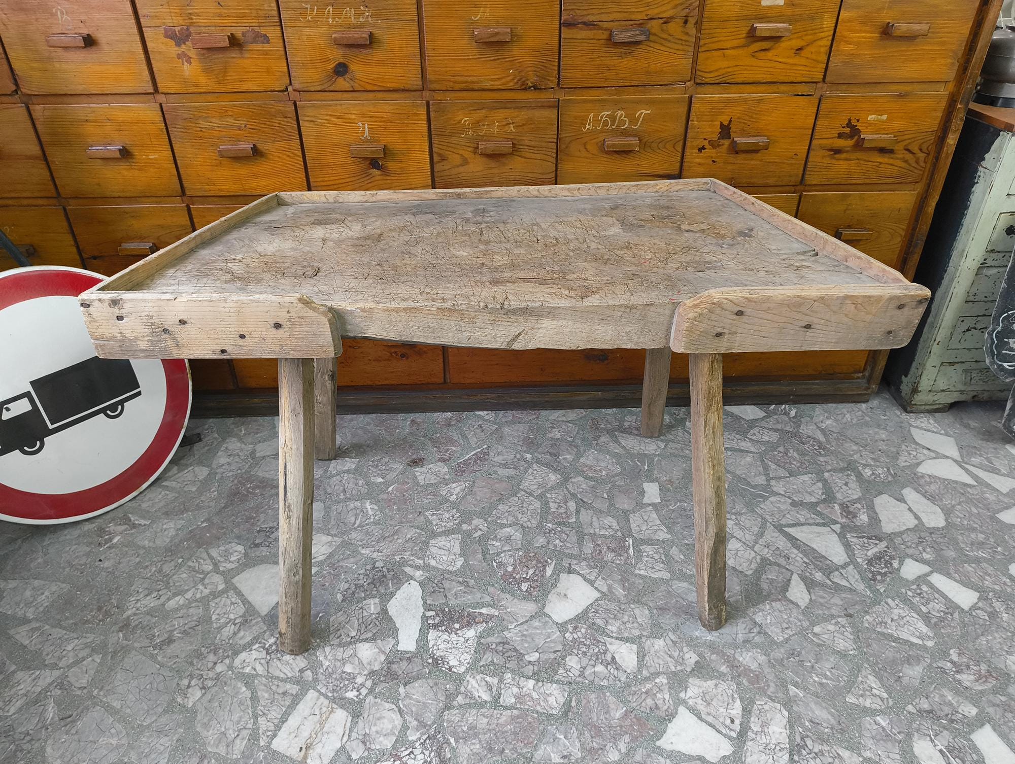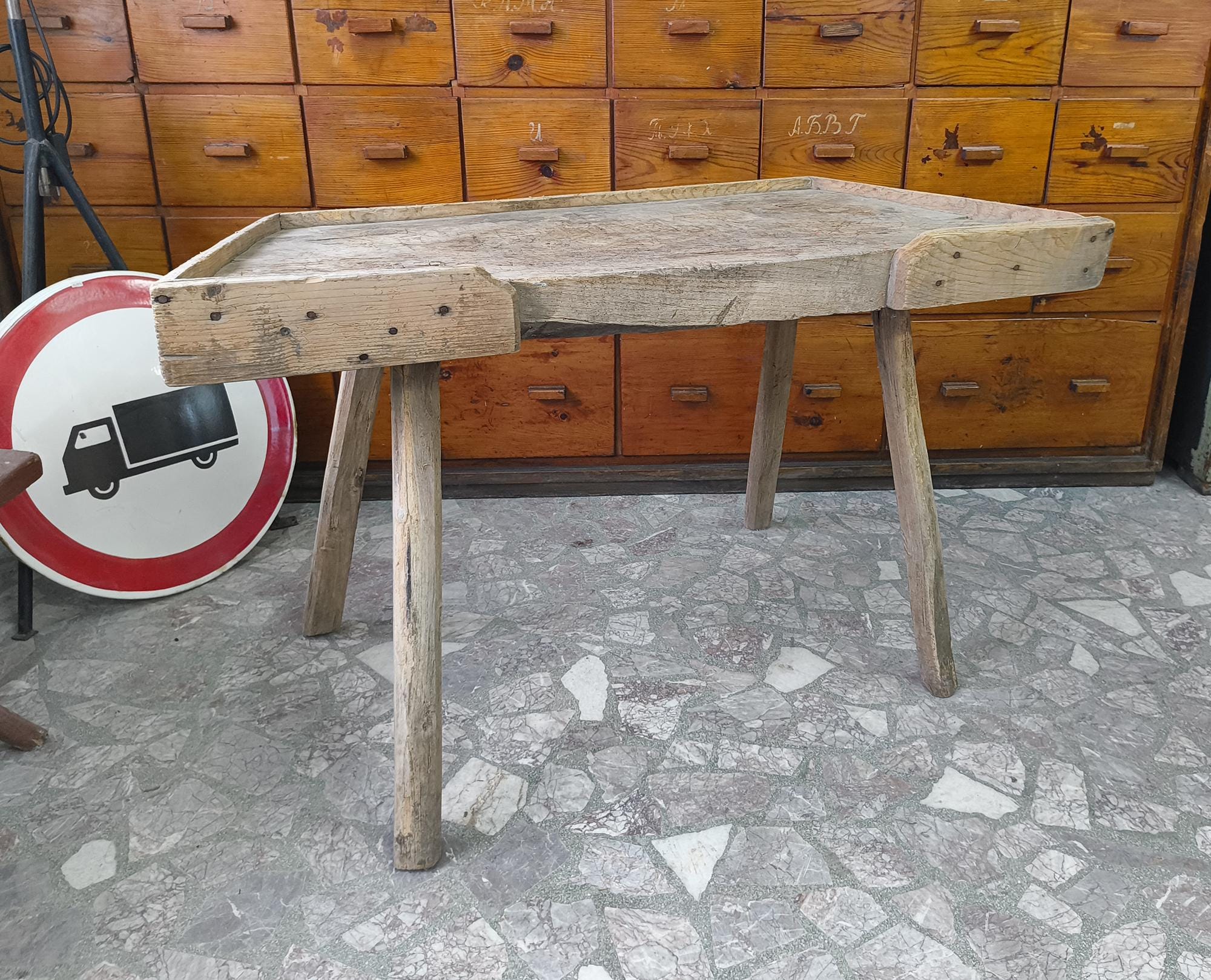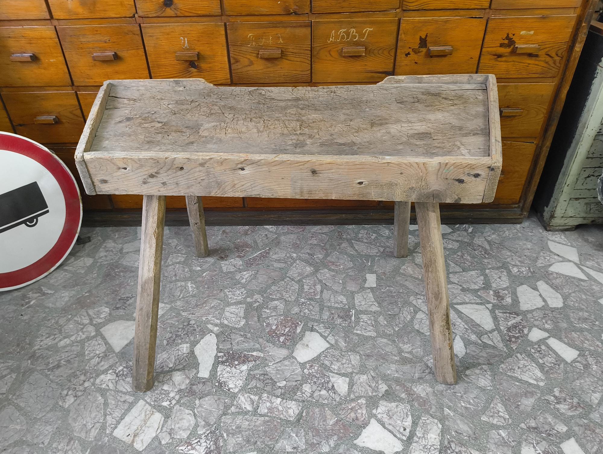 Suitable as a console table, kitchen piece, or display in a shop or interior.