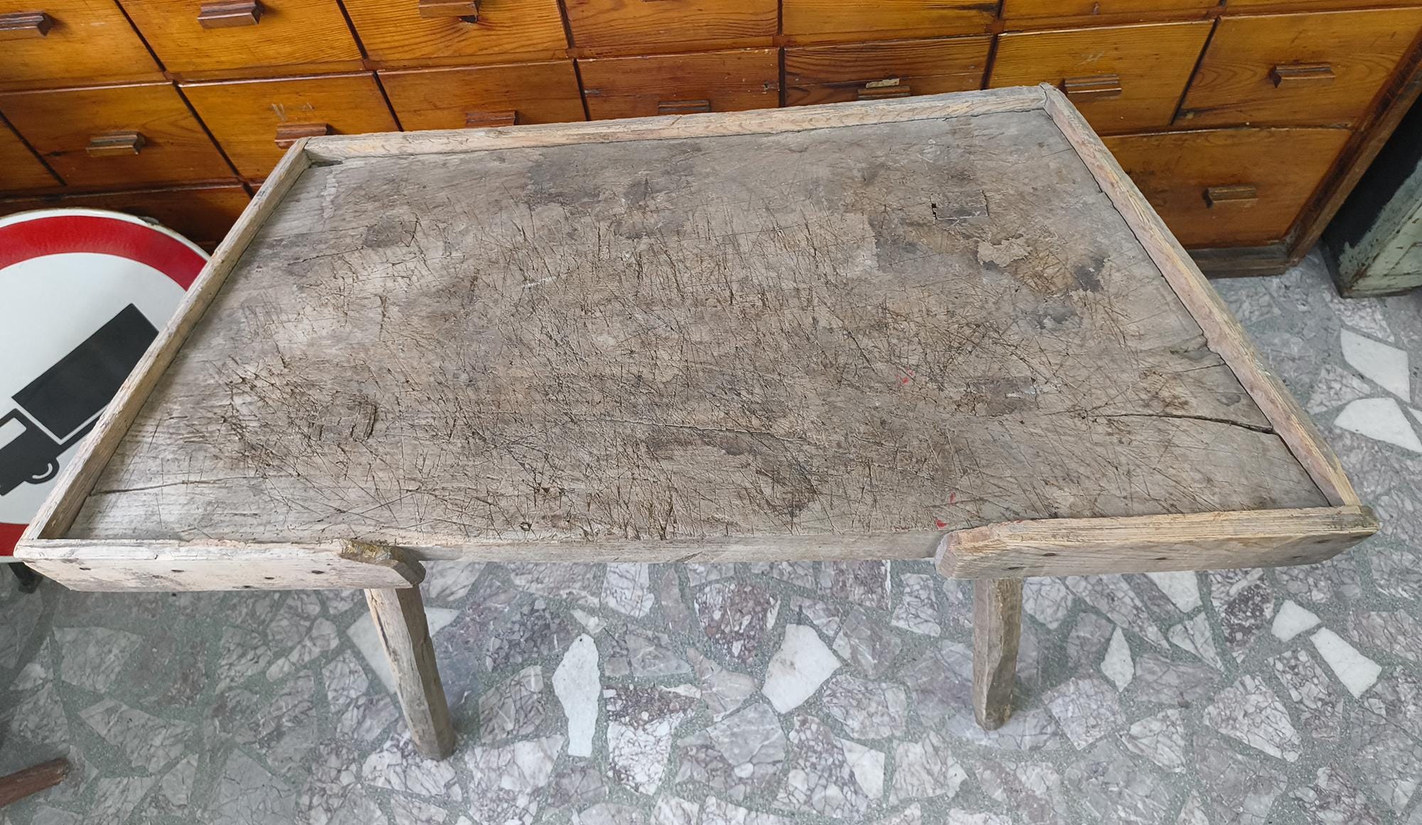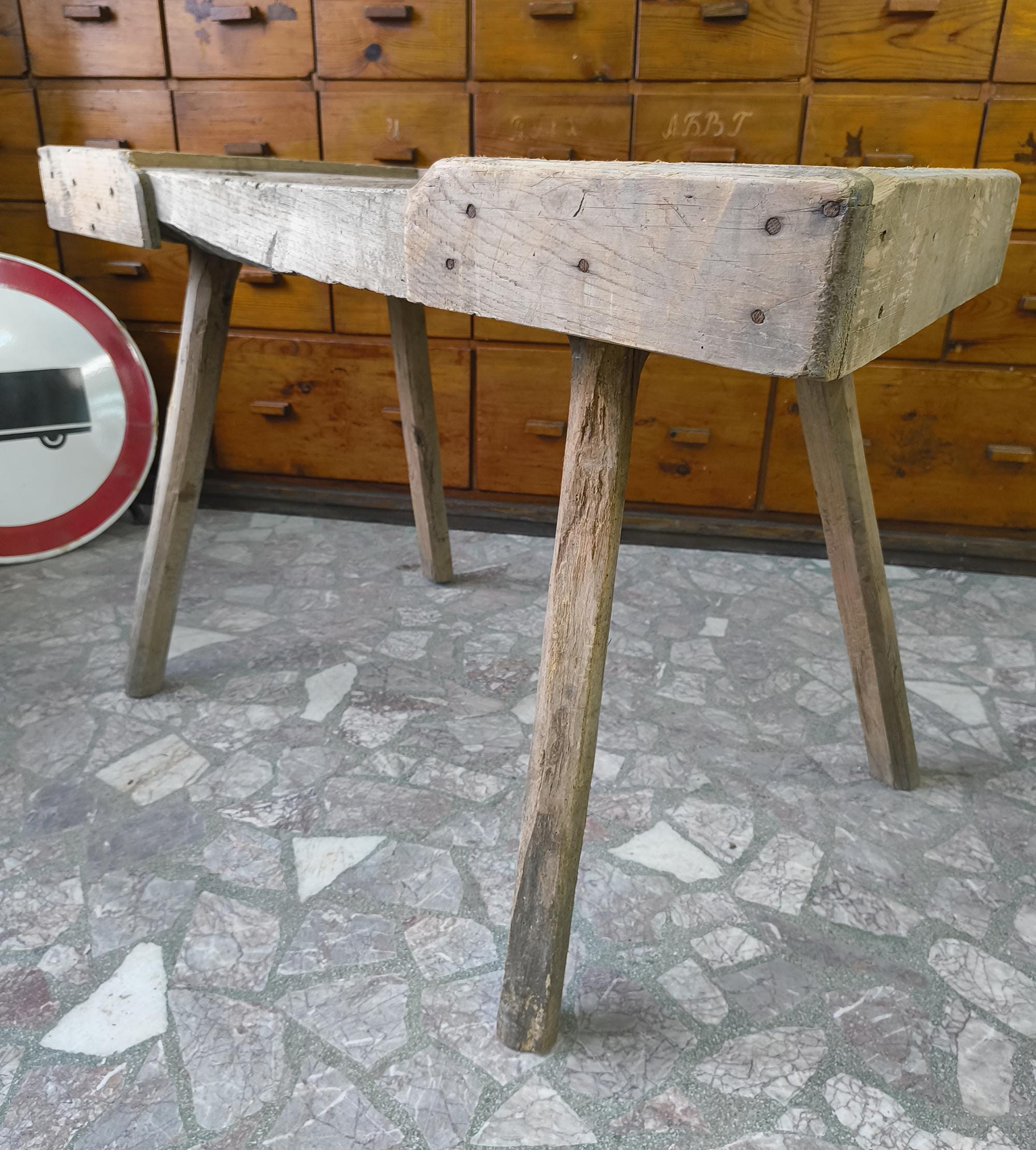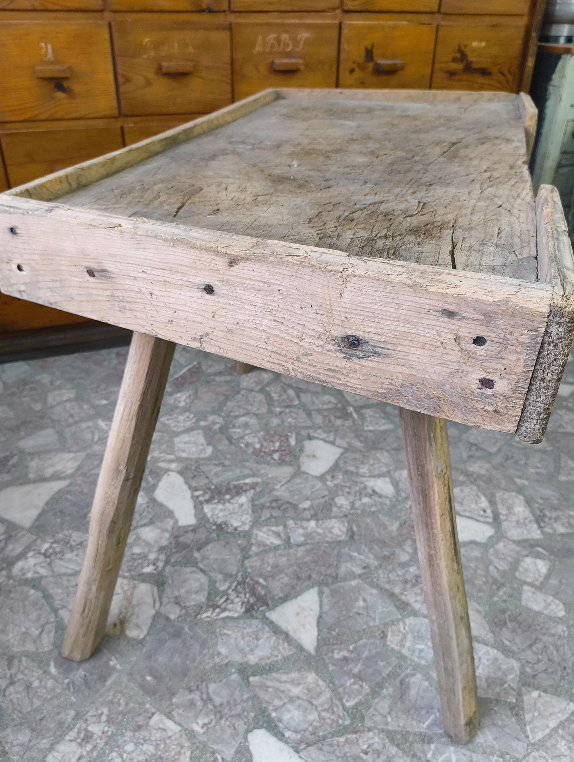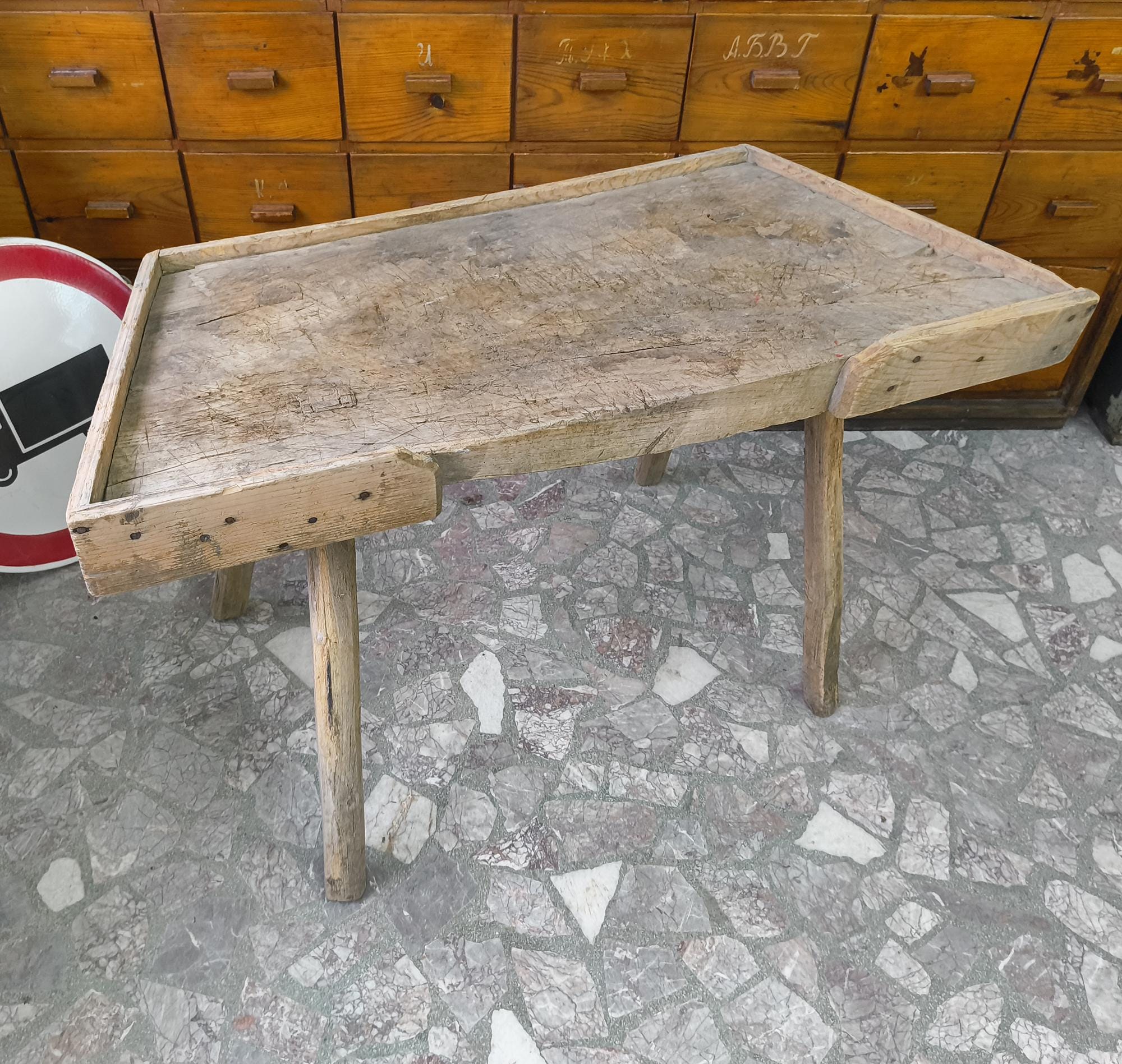 Suitable as a console table, kitchen piece, or display in a shop or interior.
