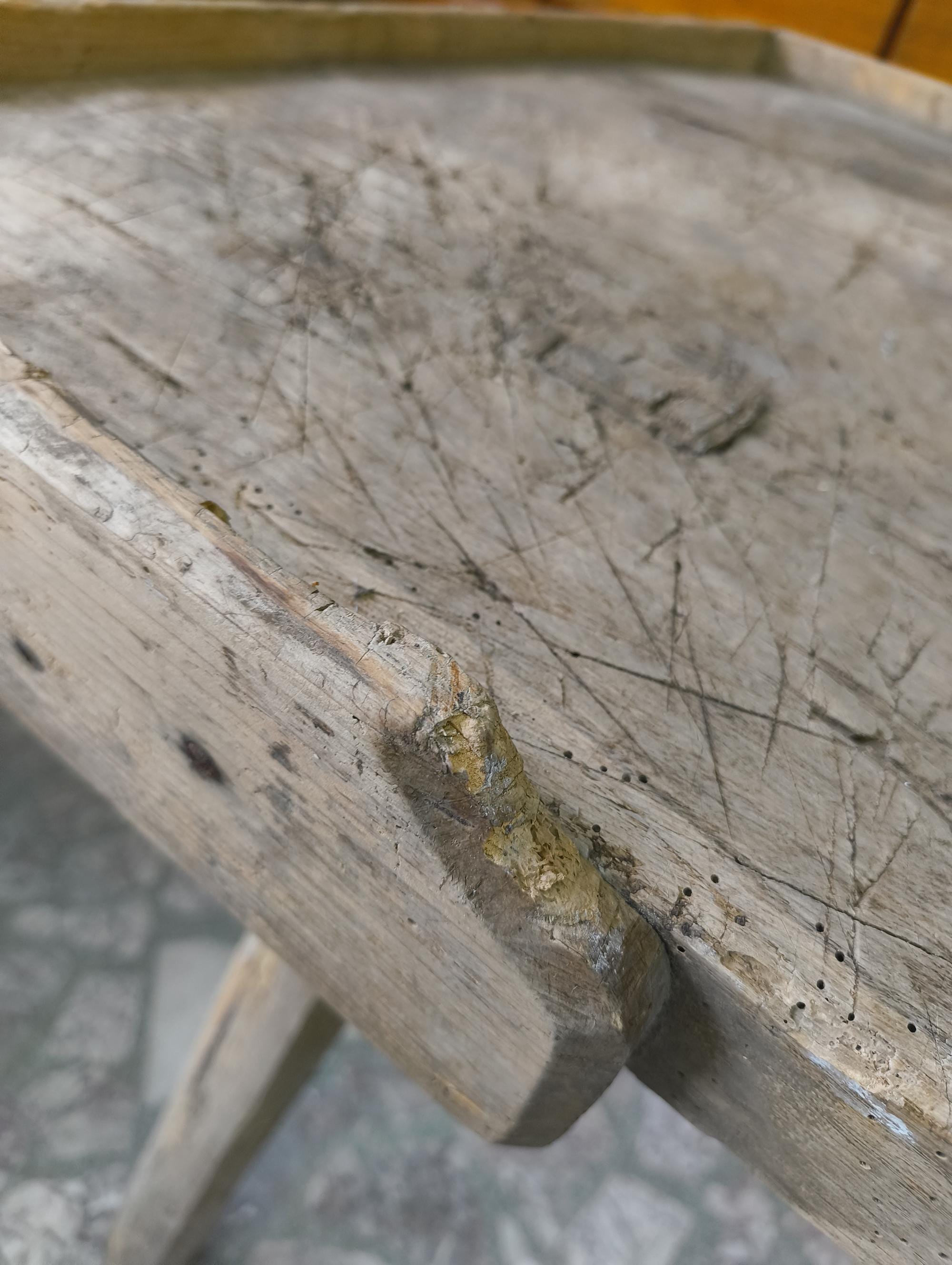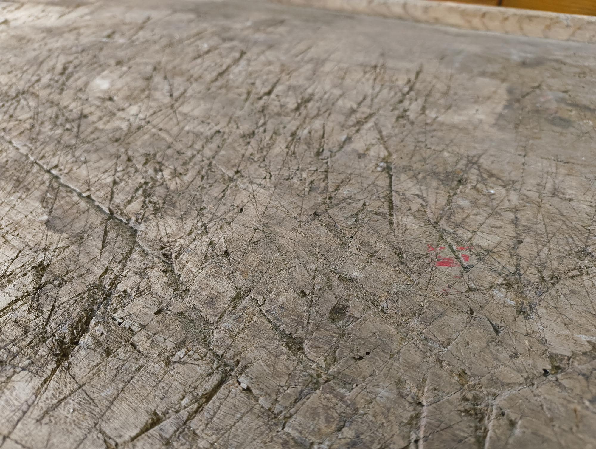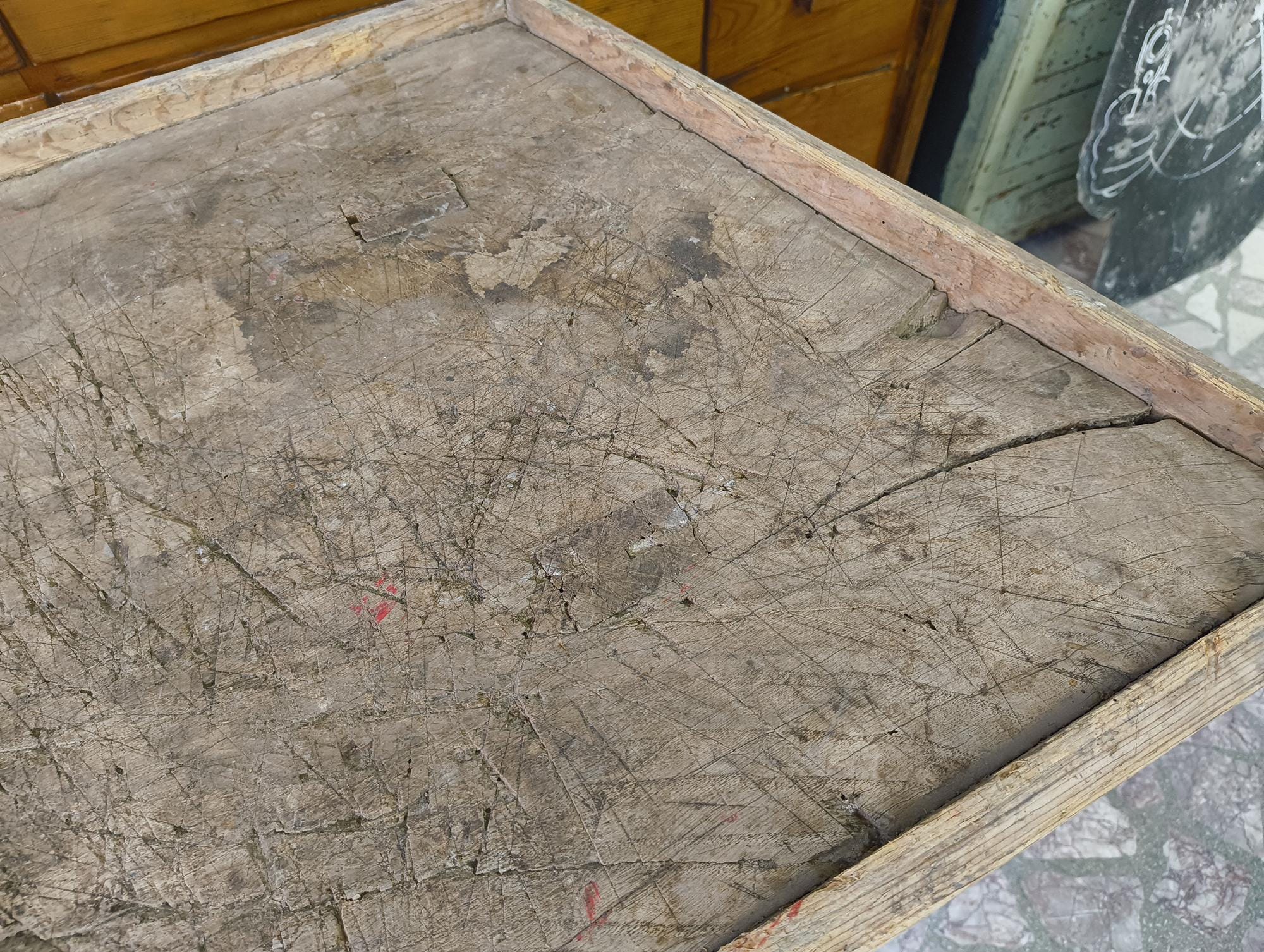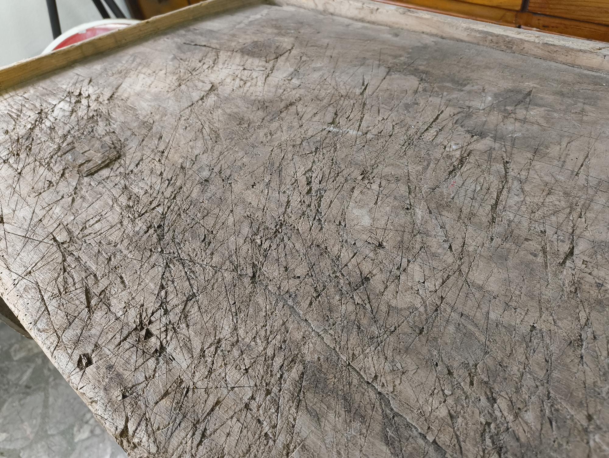 The surface shows years of use with visible cuts, scratches, and wear, giving it a strong, natural patina. Raised edges on three sides. Clean, functional construction.
