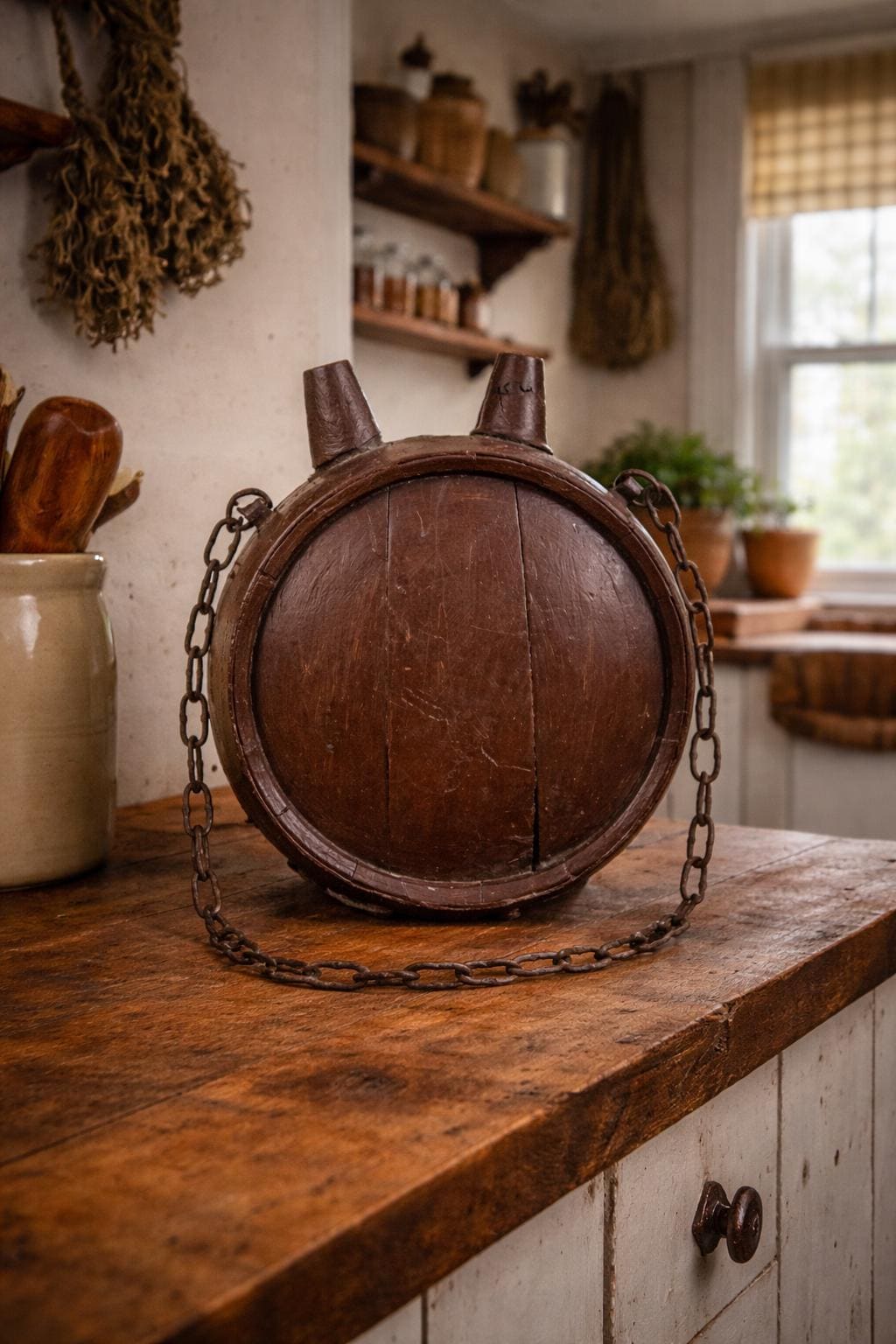 The water keg is 30 cm high, 22 cm wide, 15 cm deep (bottom) 14 cm deep (top) 1,60kg. It is a great housewarming gift for people who appreciate original vintage objects, have a passion for history, or just like rustic interiors.
