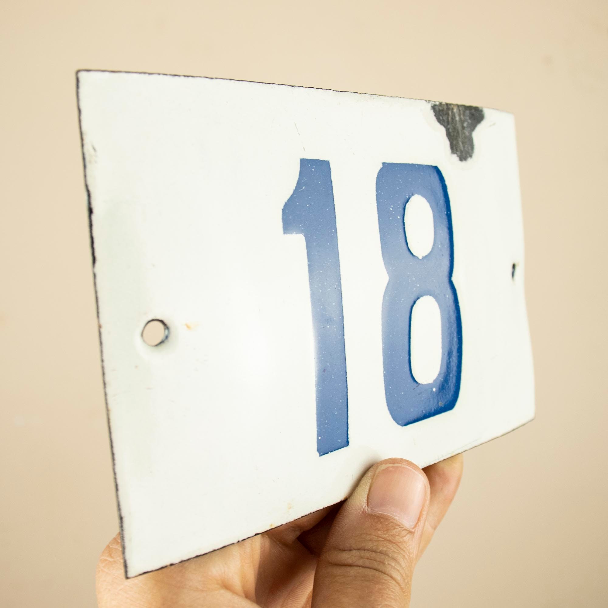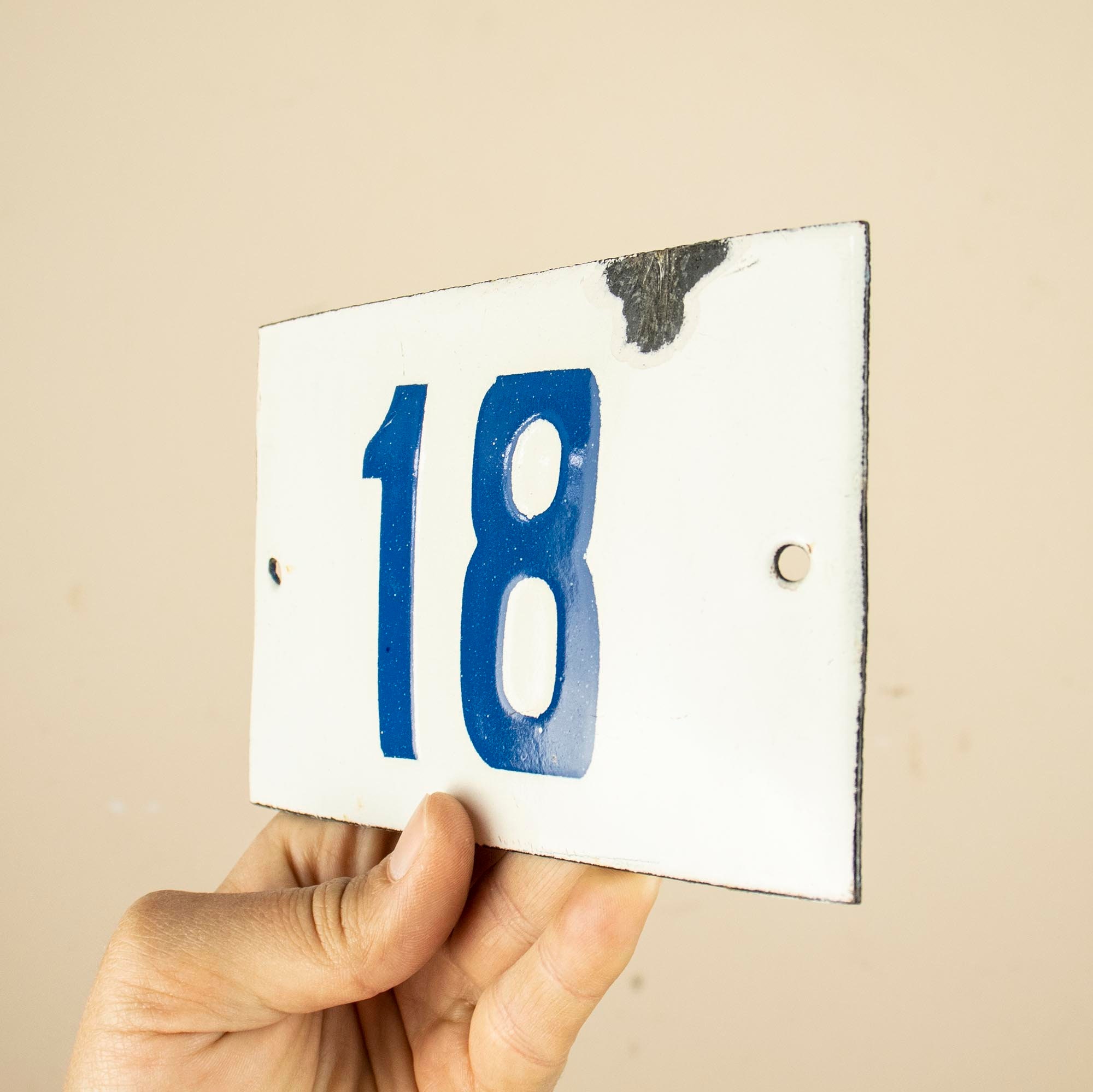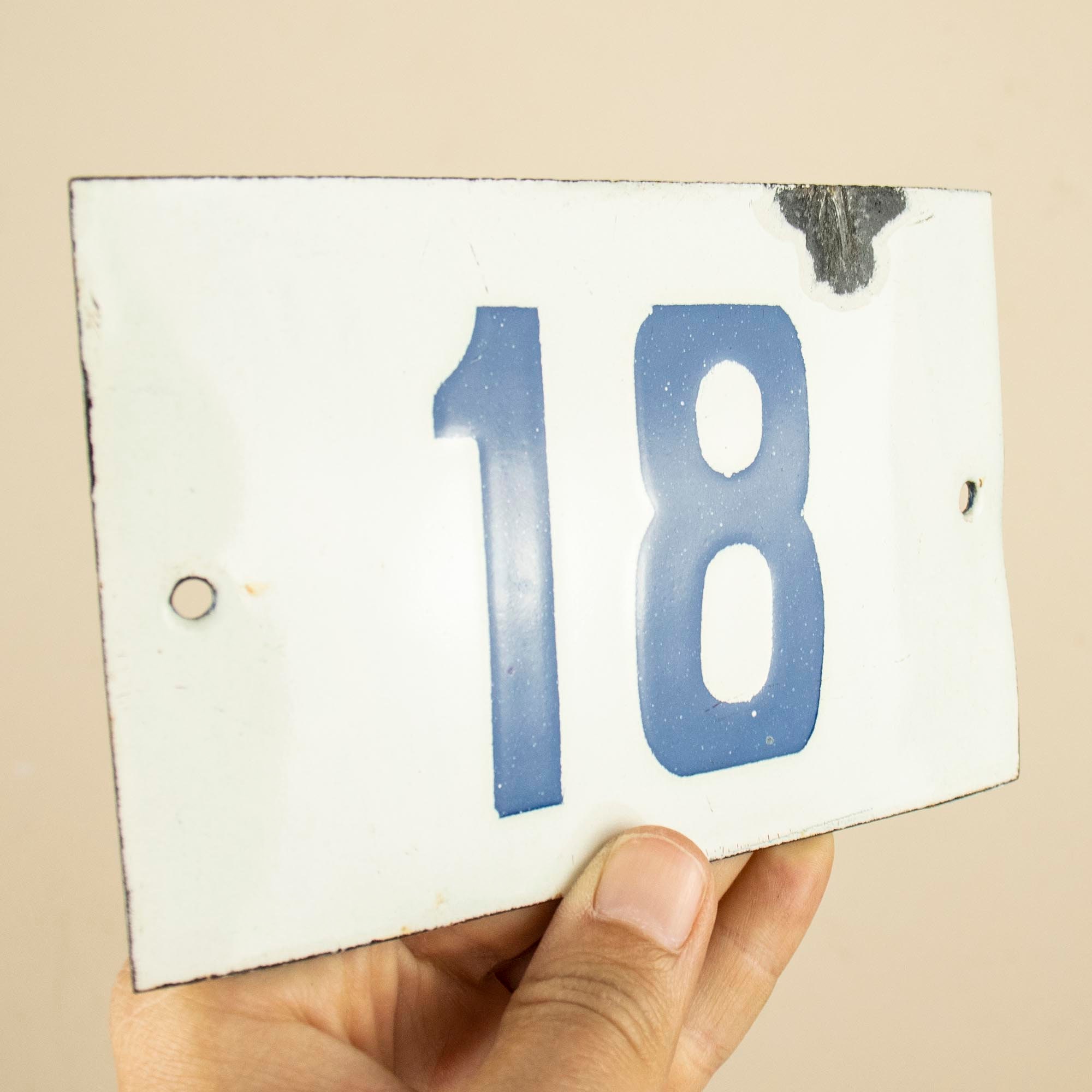 Beautiful vintage porcelain enamel street number sign 18 in white and blue. Very high-quality thick porcelain sign made in Bulgaria and widely used in the whole country. Today we still see many of them hanging on the houses in more remote villages. The sign comes in rare colors and is in really good condition.