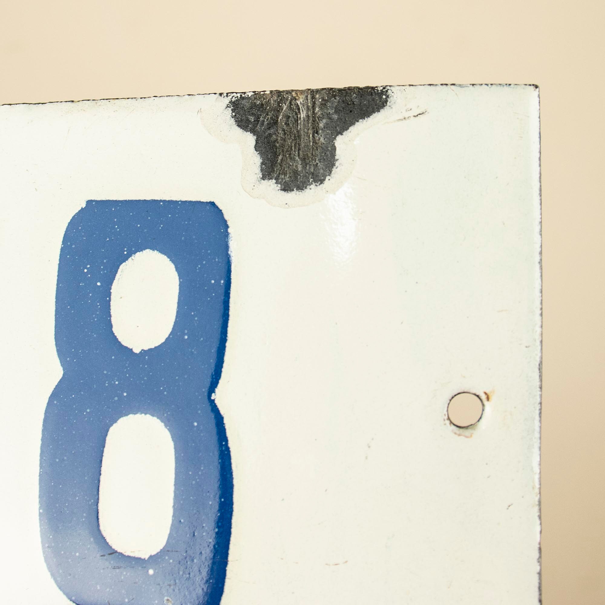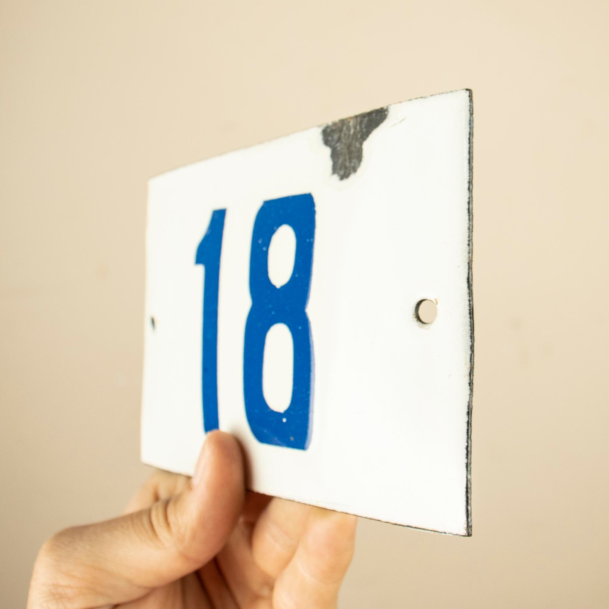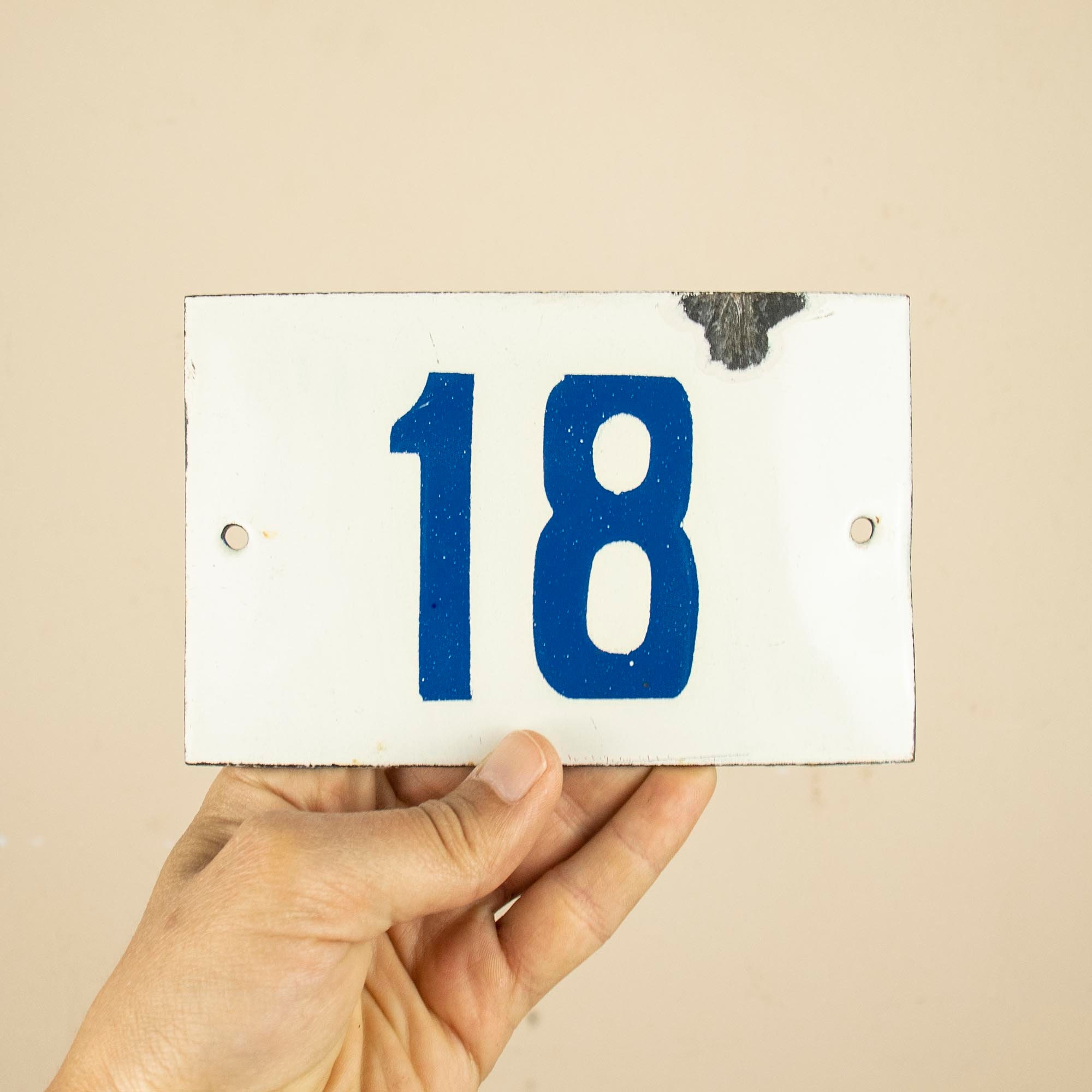 Beautiful vintage porcelain enamel street number sign 18 in white and blue. Very high-quality thick porcelain sign made in Bulgaria and widely used in the whole country. Today we still see many of them hanging on the houses in more remote villages. The sign comes in rare colors and is in really good condition.
